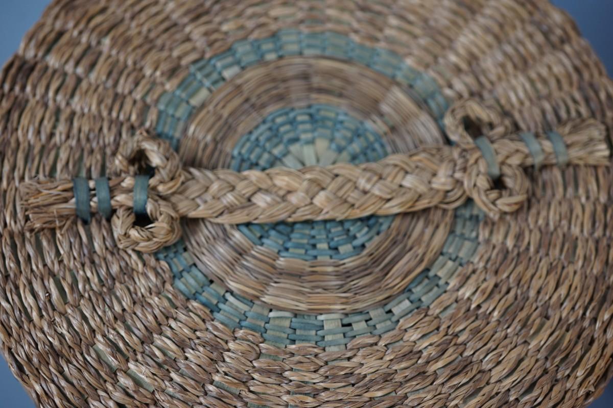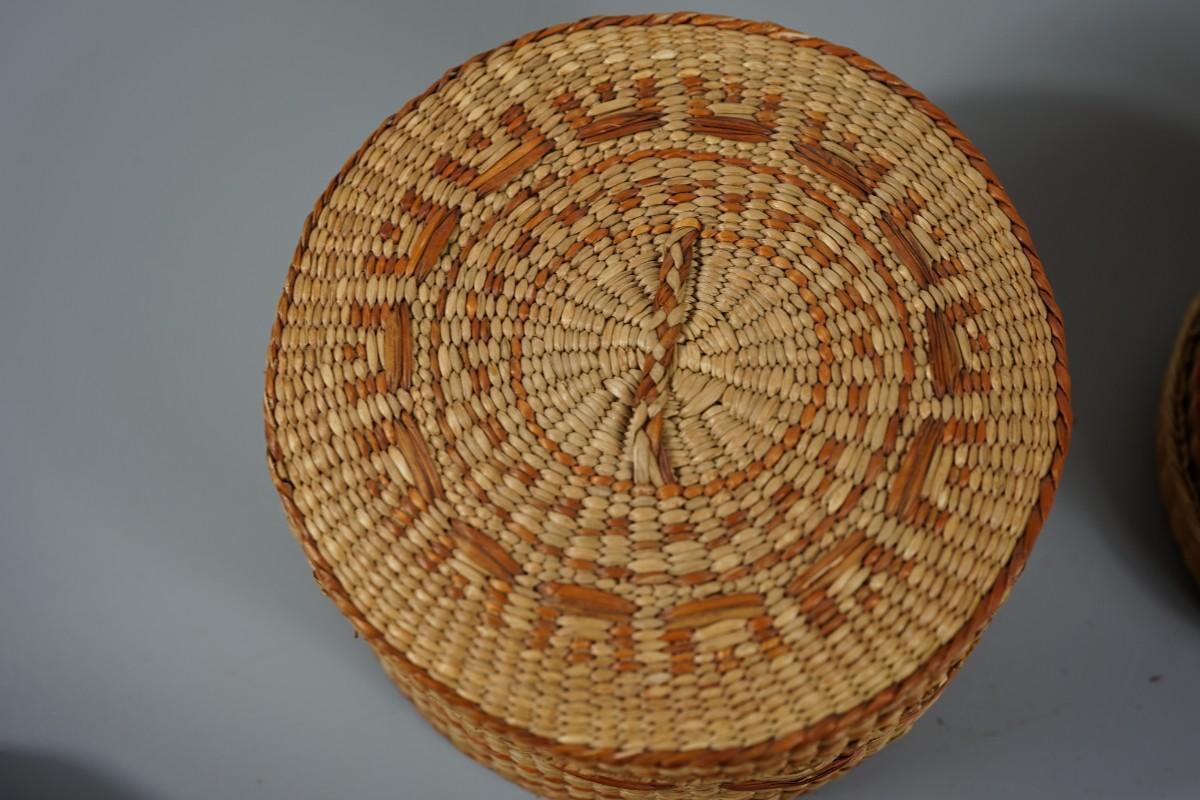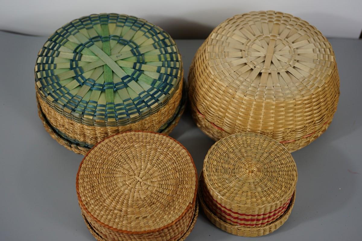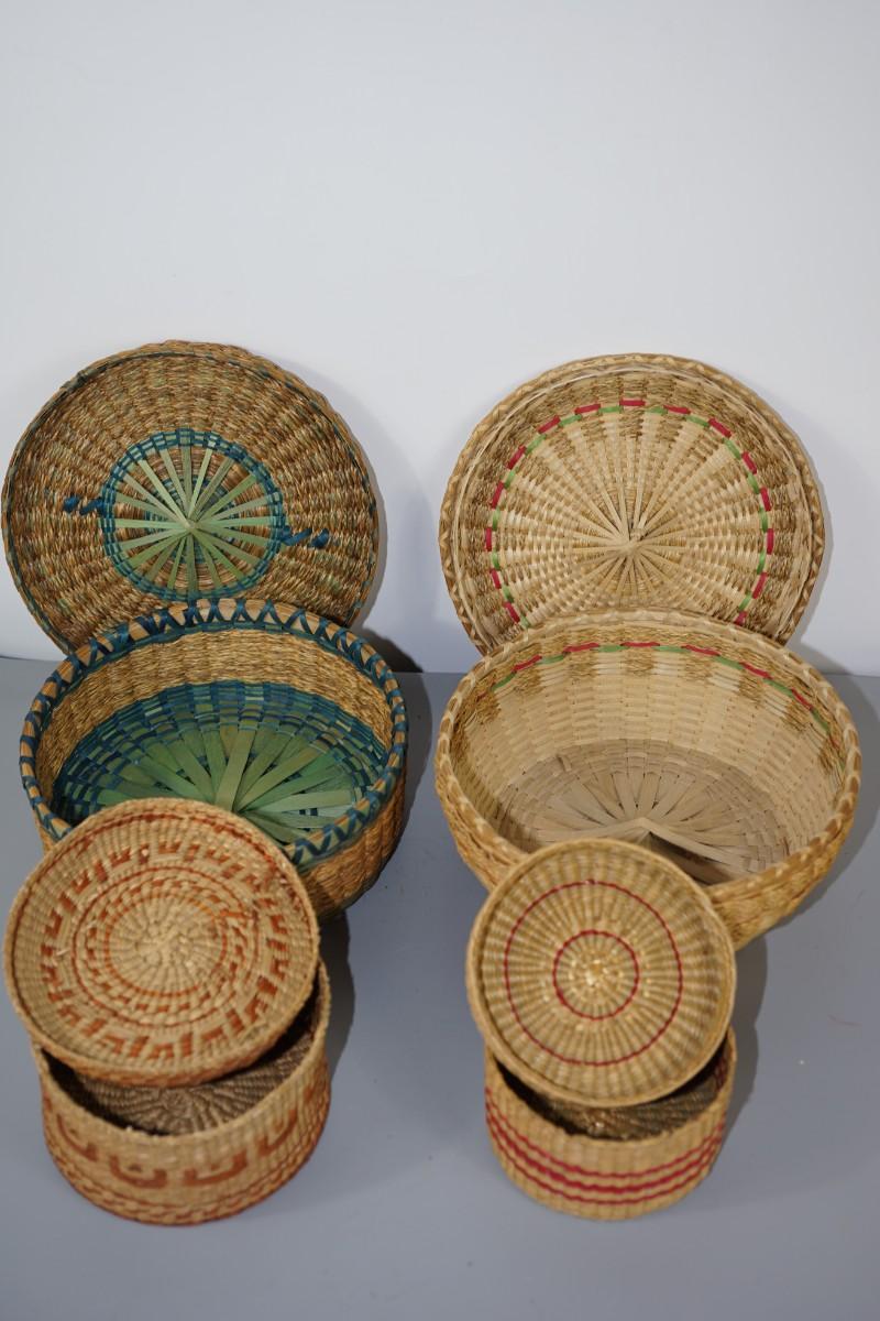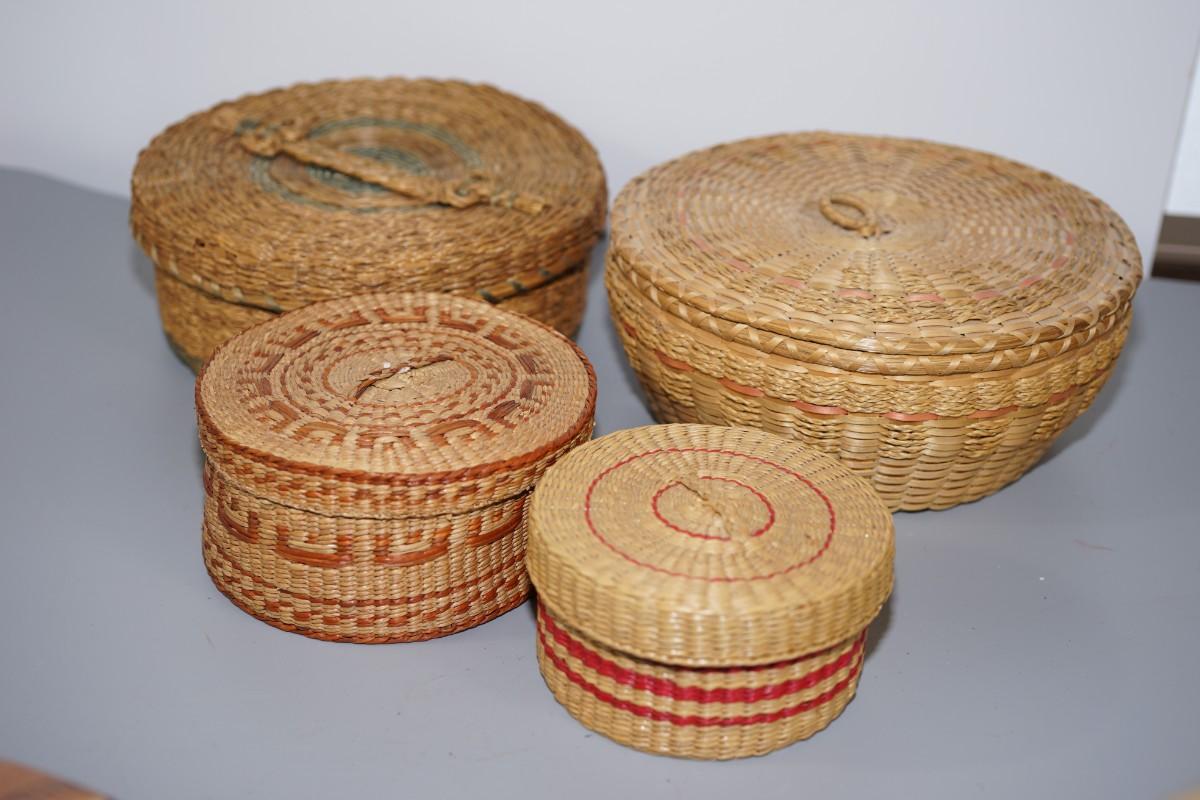 GROUPING OF FOUR GRASS WOVEN BASKETS WITH LIDS. NATURAL DYES.