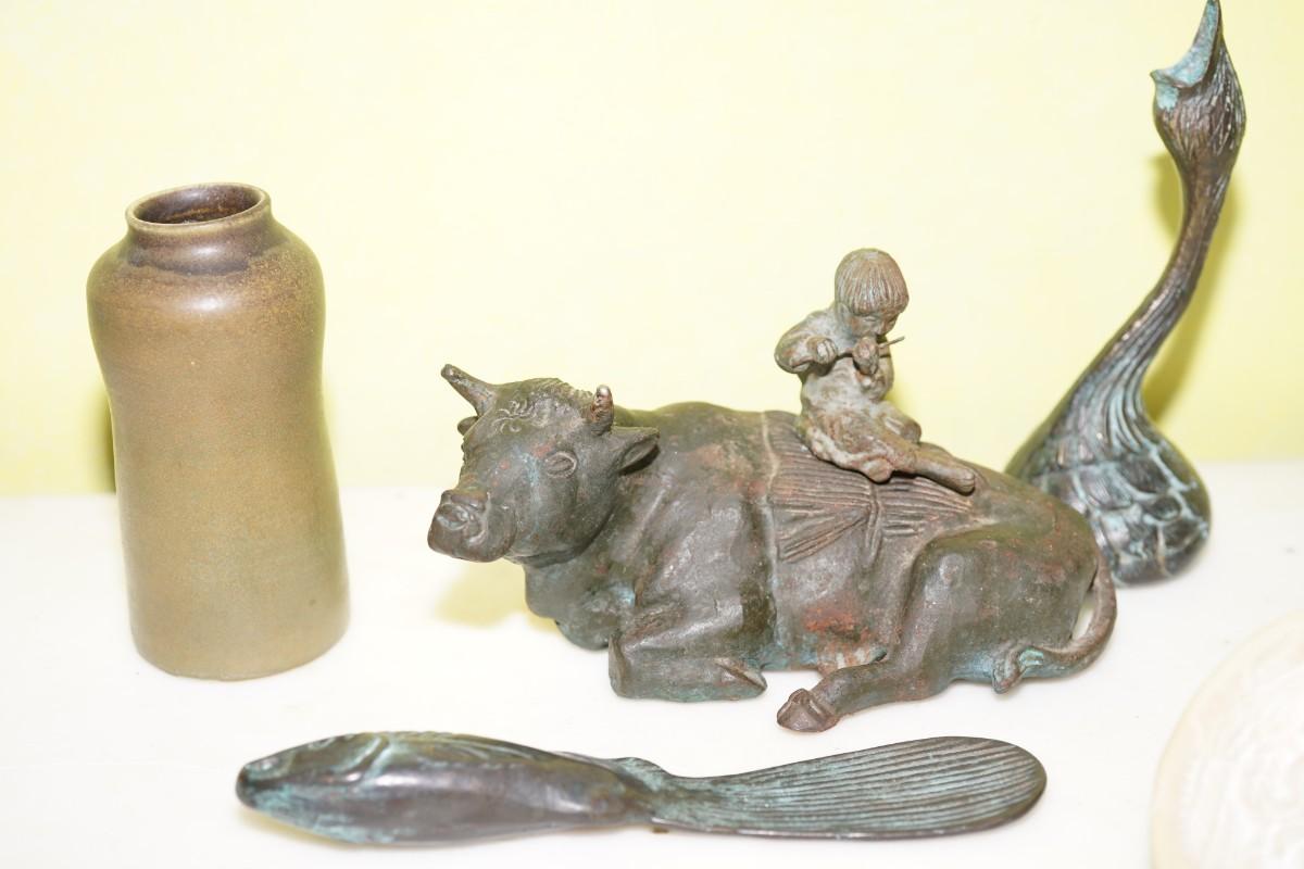 GROUPING OF FOUR ITEMS PIDGEON FORGE POTTERY VASE AND THREE BRONZE ASIAN ITEMS