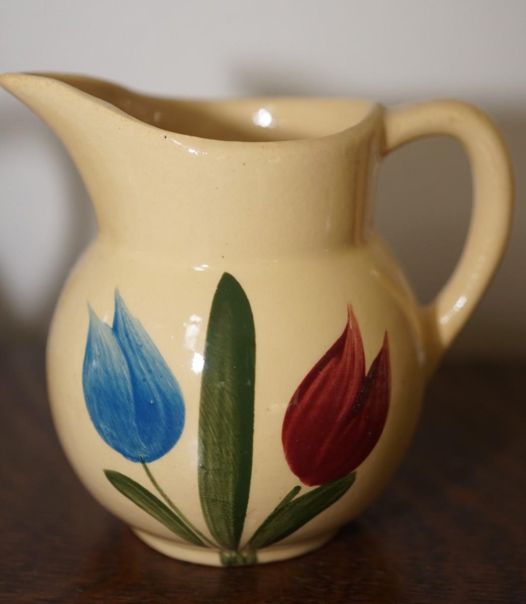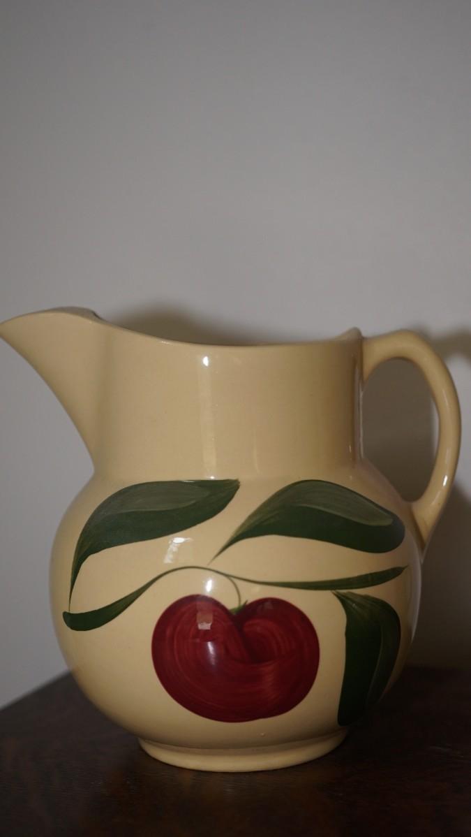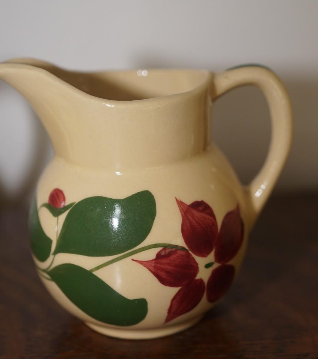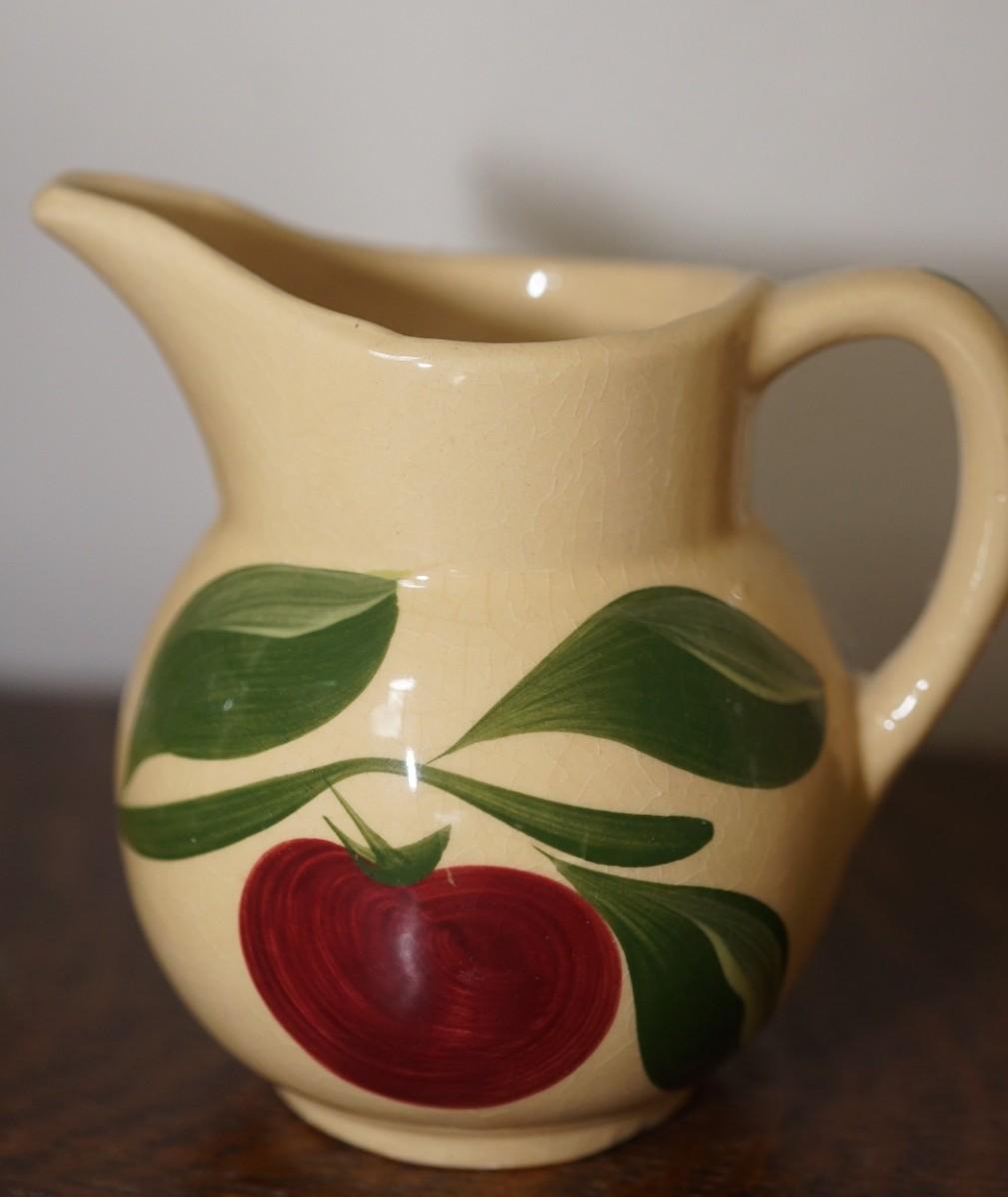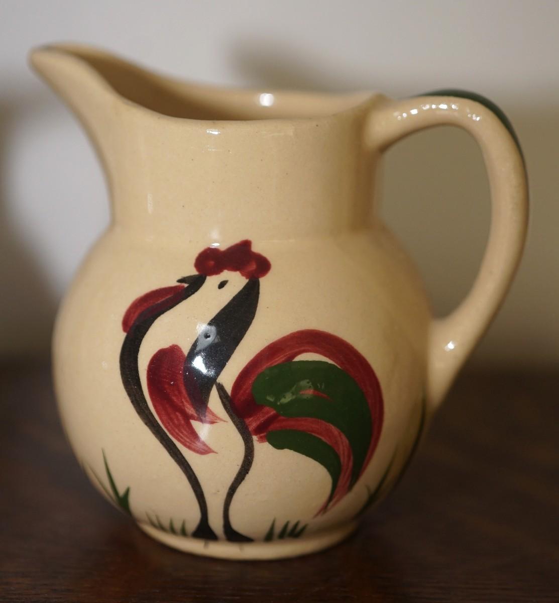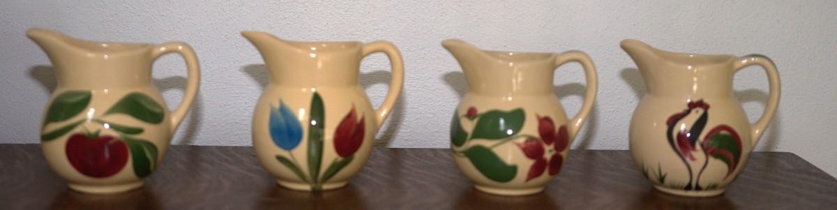 watts ware ceramic pitchers with rooster, tulip, apple and star flower