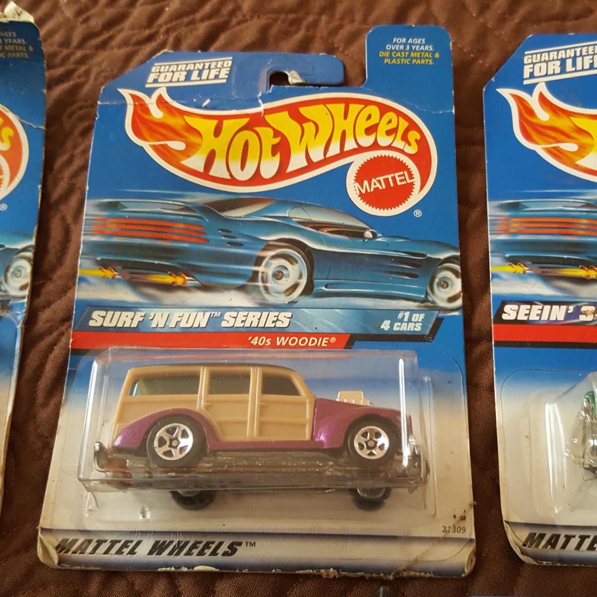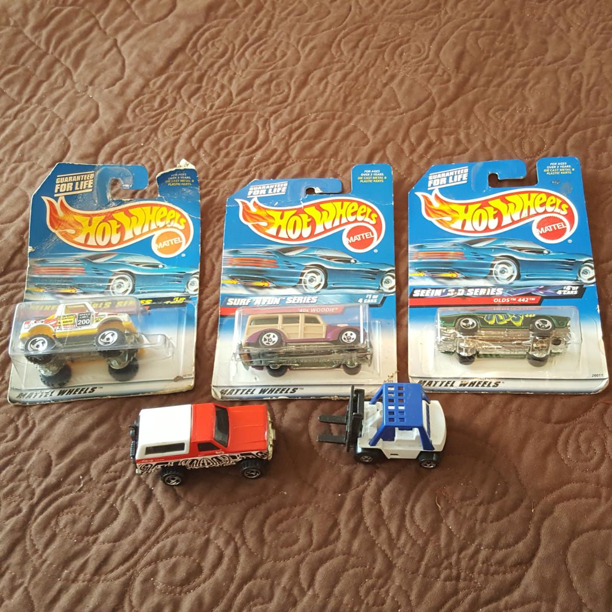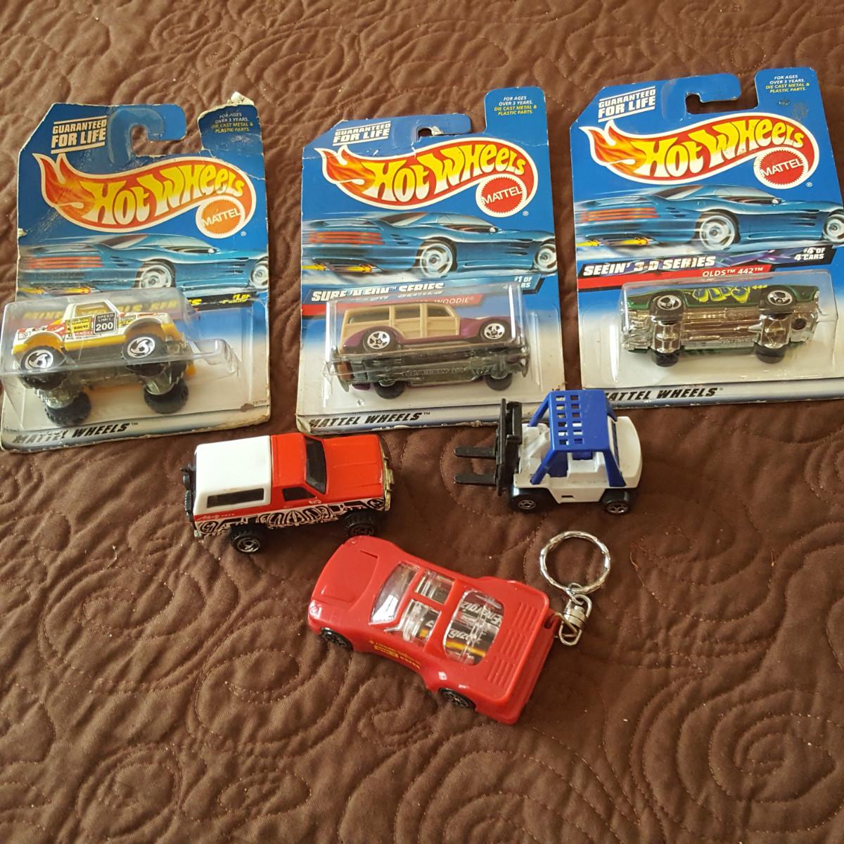 This auction lot is for a Grouping of 6 Hot Wheels plus a Eveready Car flashlight key chain. Two of the Hot Wheels are still in unopened hanging sales cards and one is in a hanging sales card that has been slightly opened - the cards are in various conditions - please see photos. The sale includes a Street Roader, a Olds 442 and a 40s Woodie with their cards and a Alaska Trek and Forklift with no cards. Plus the Eveready Car Light Key Chain. Also includes a How Wheels car that is decorated with Roy Lichtenstein-style artwork for a total of 6 items.