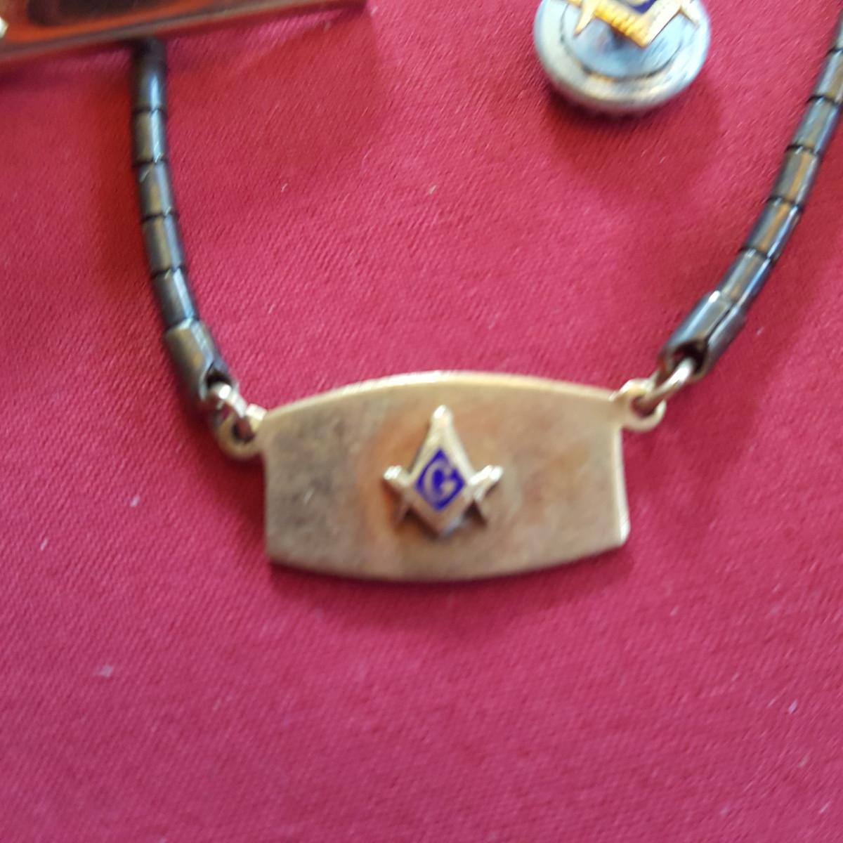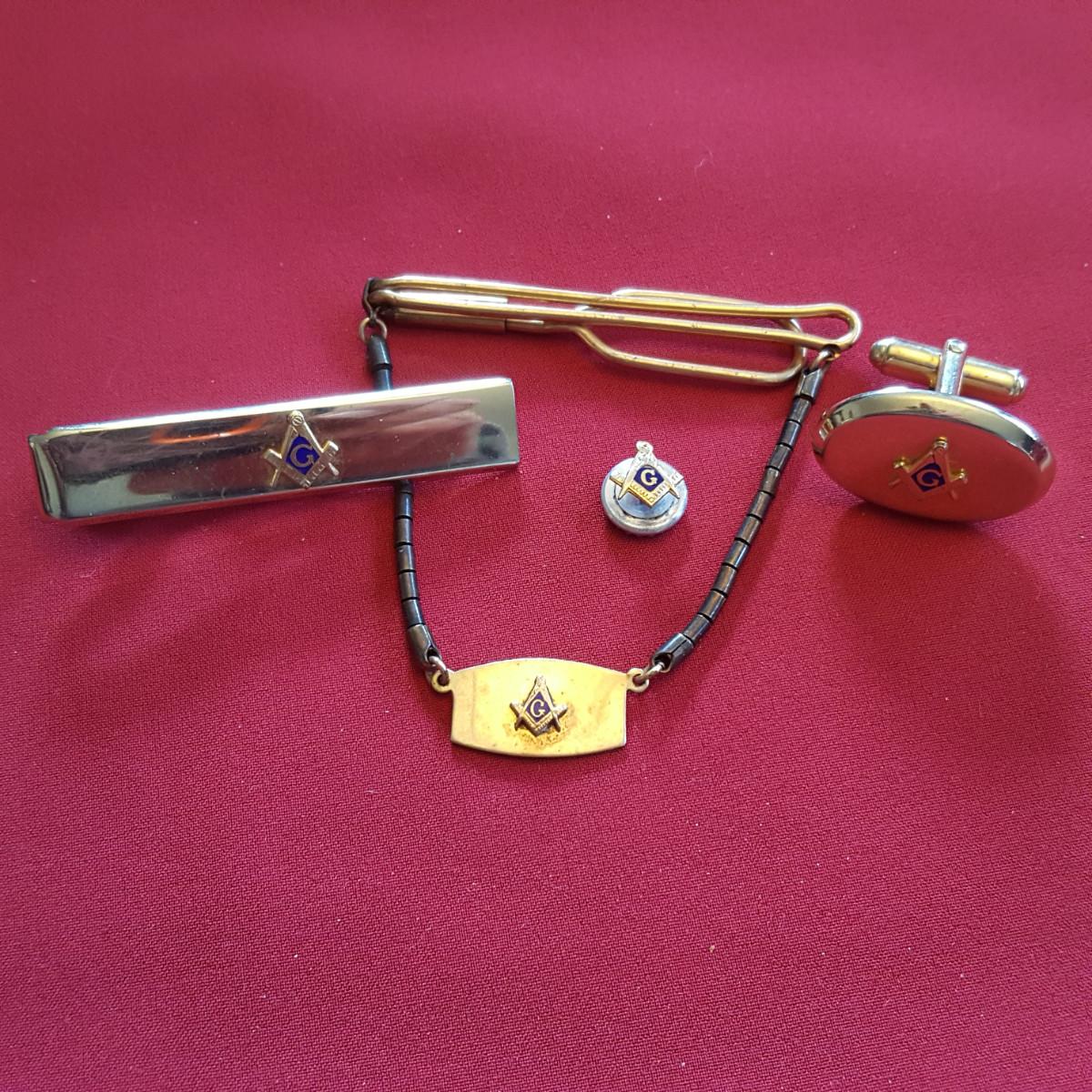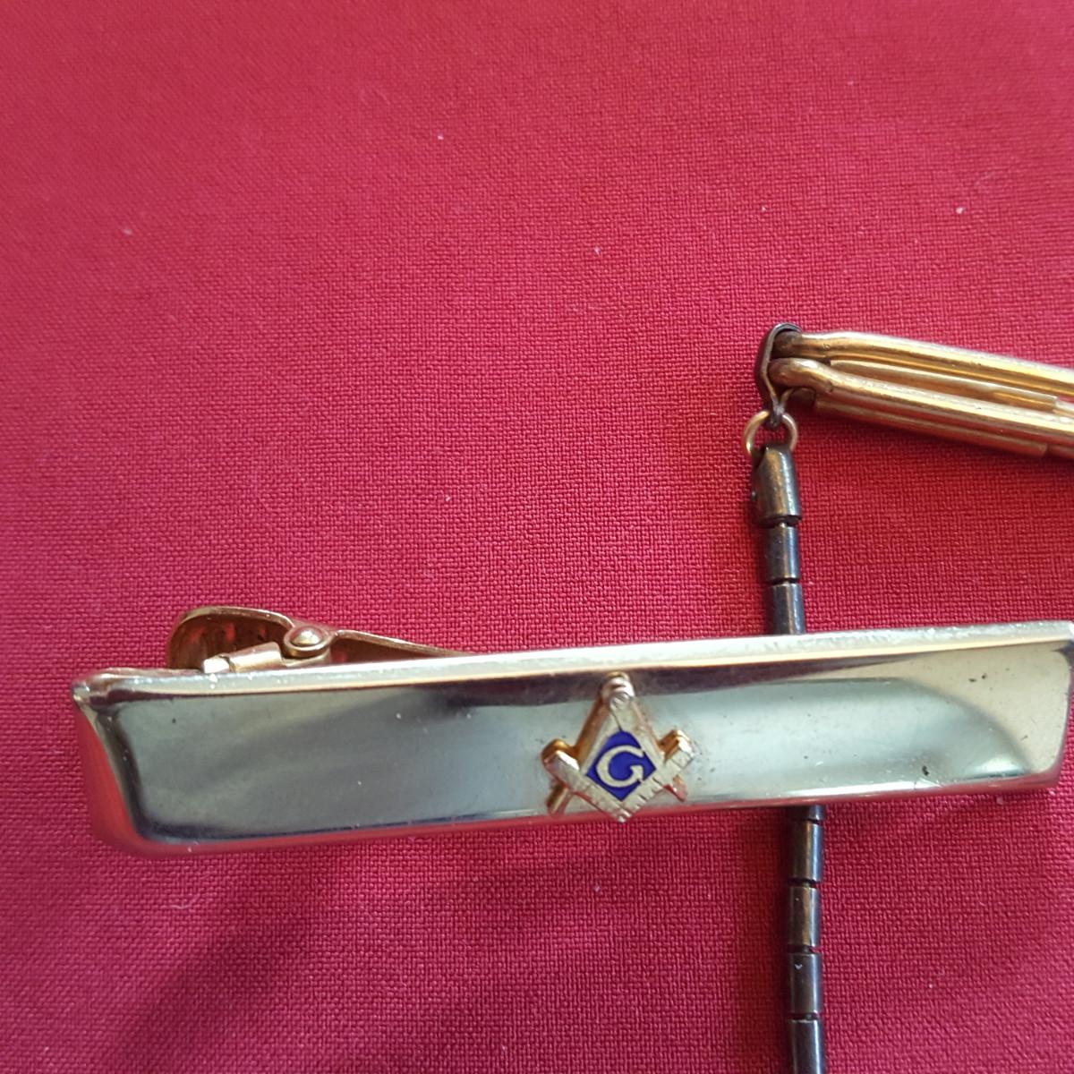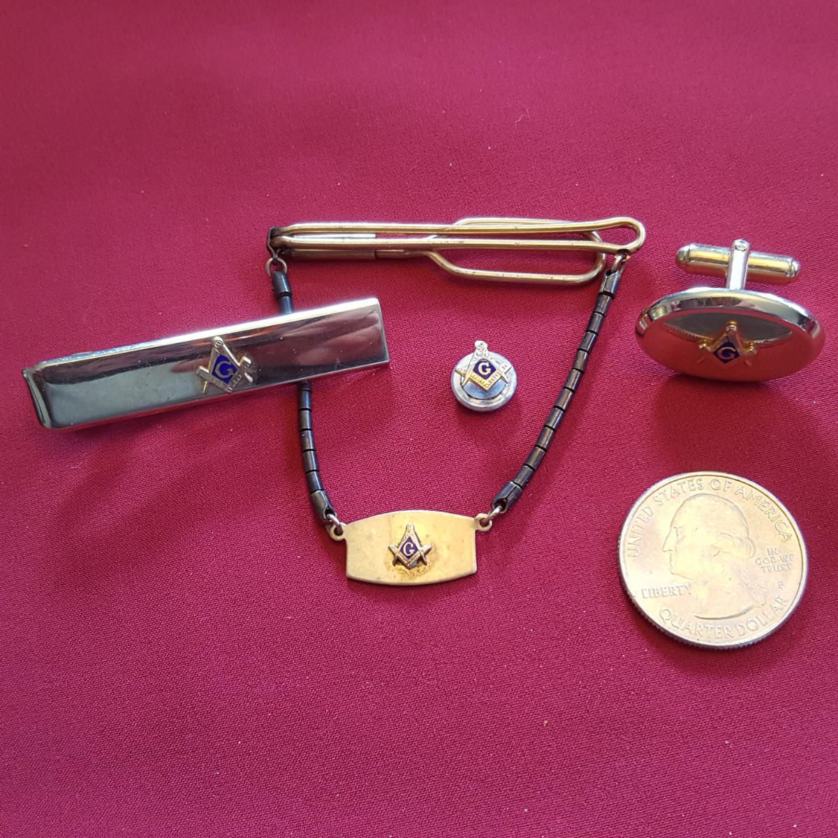 This auction lot is for a Grouping of Masonic Items. The 4 items offered here are a single cuff link with the Mason's symbol and a tie bar also decorated - both made by Anson. A small pin for lapel or tie with the Masonic symbol and a tie clasp with the same symbol marked 1/20 12K GF. See photo for sizing.