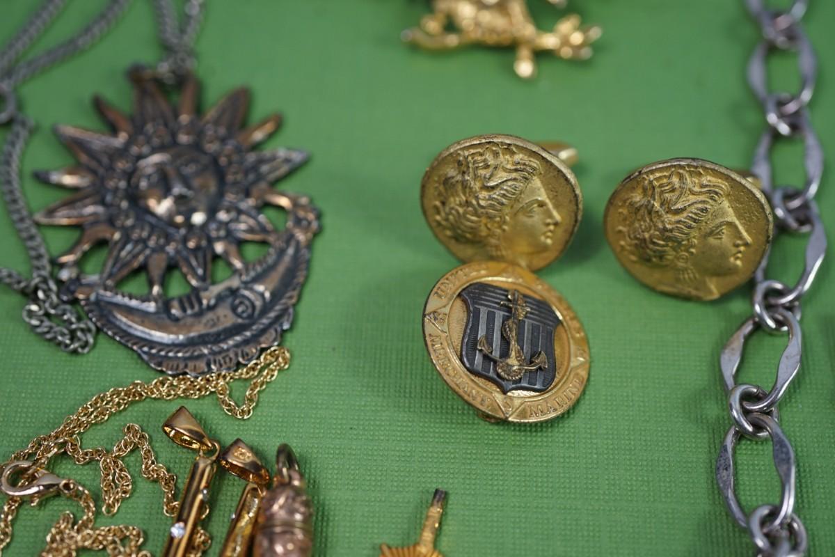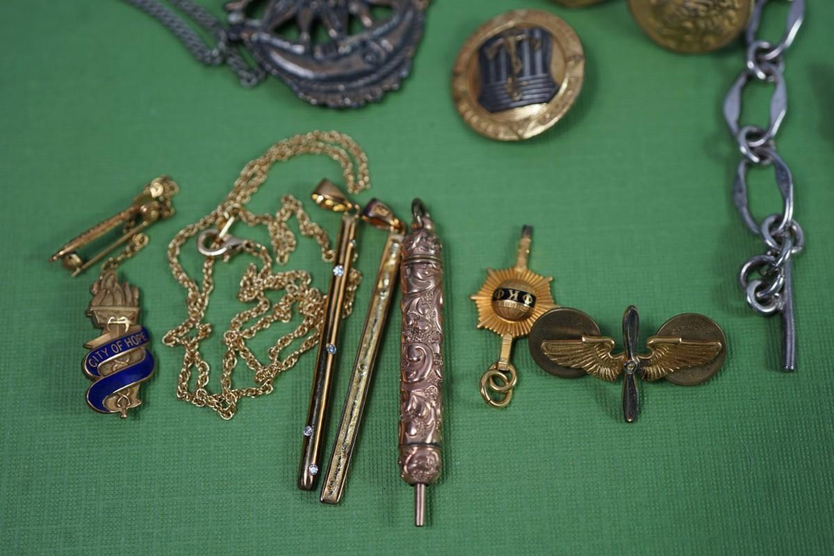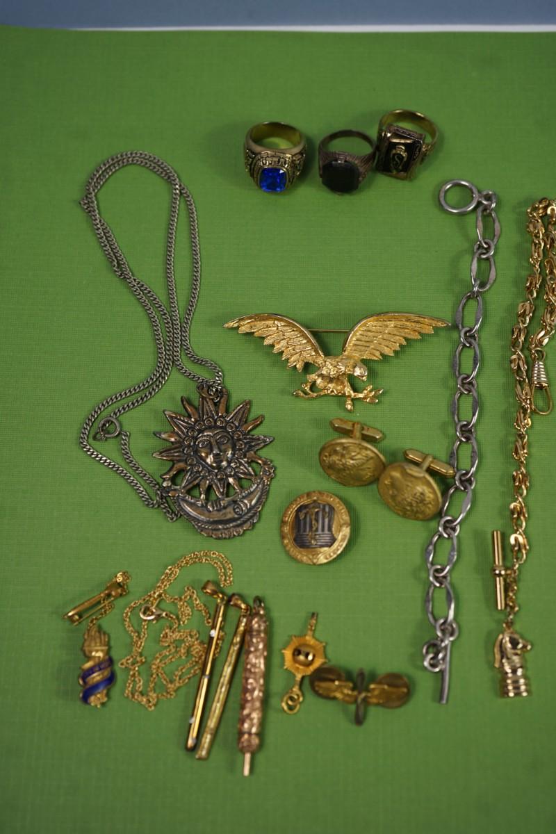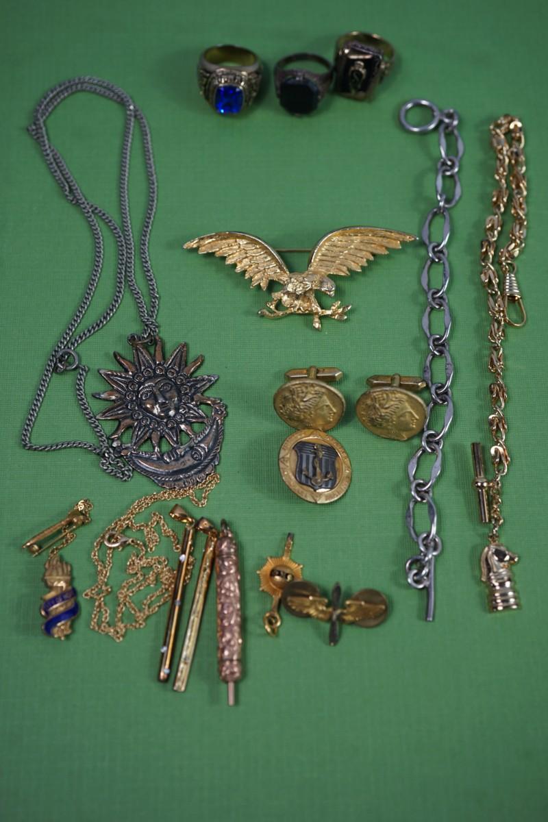 GROUPING OF MENS RINGS WATCH FOBS, WAR RELATED PINS AND OTHER