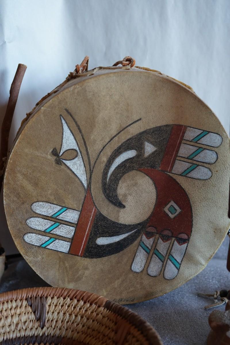 hand painted dance drum, it has the bear claw painting. in good condition. comes with the stick that has hide and hide string tie.
