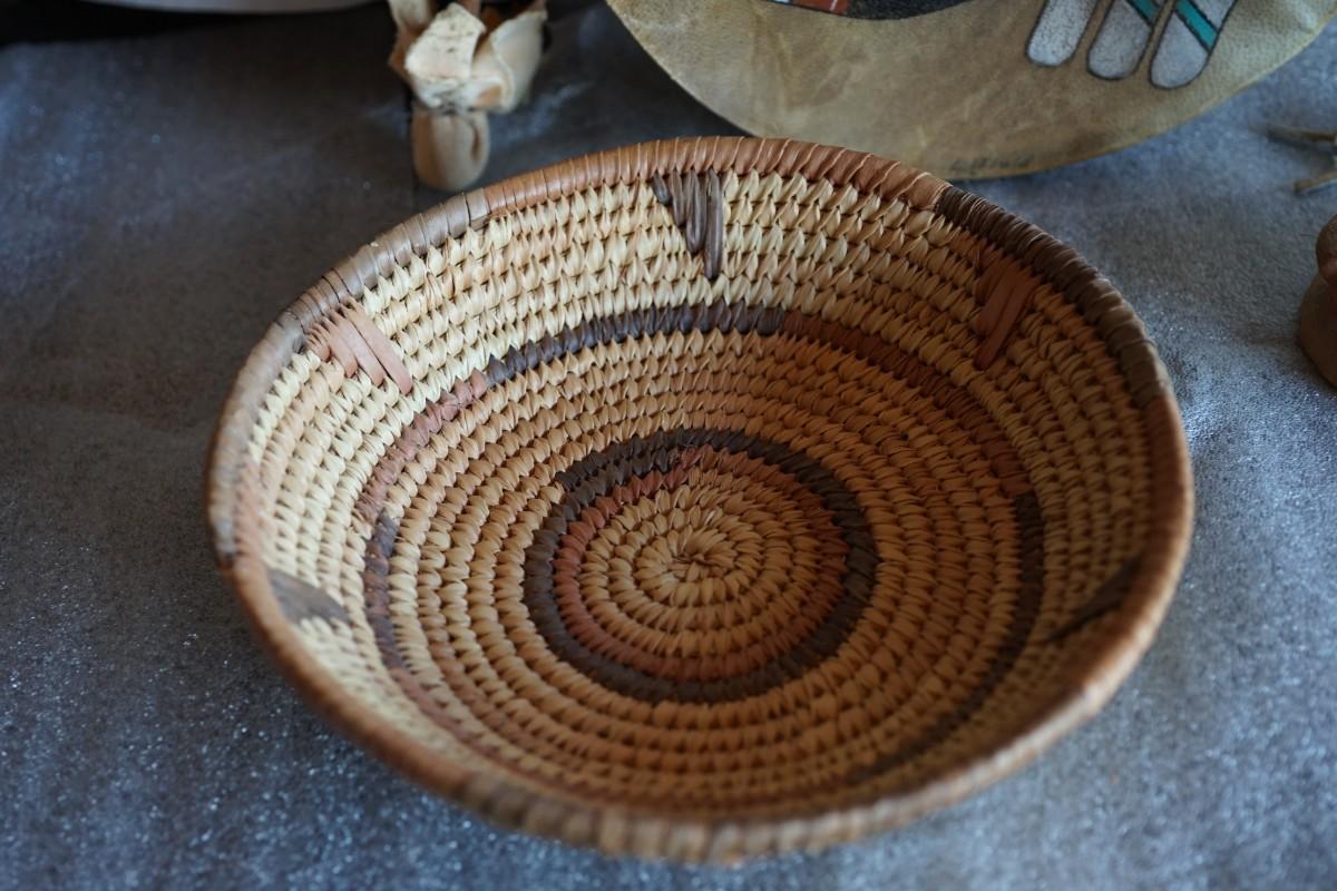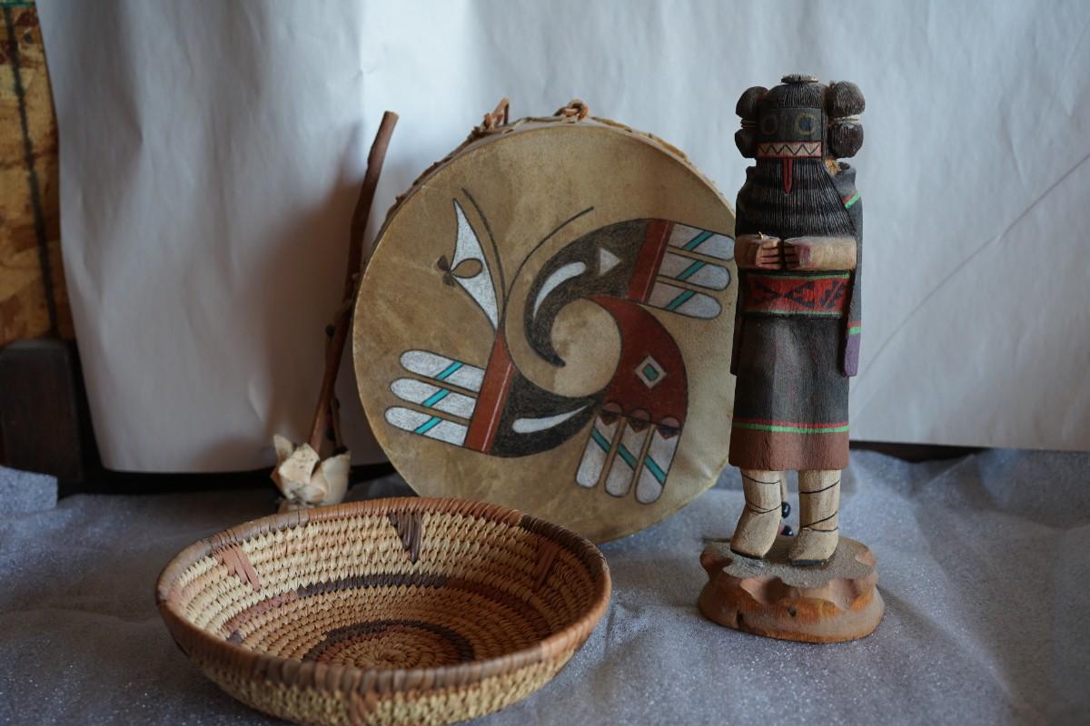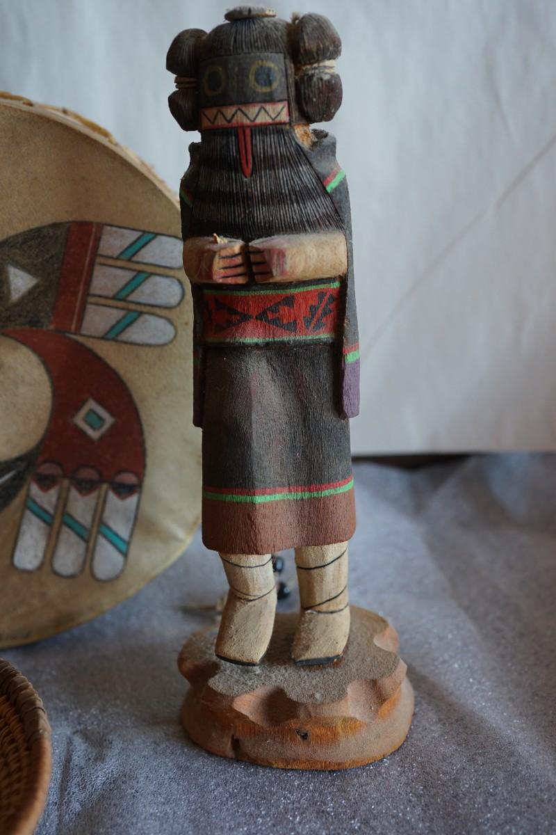 GROUPING OF NATIVE AMERICAN ITEMS TO INCLUDE A KATCHINA DOLL, POSSIBLE INUIT DANCE DRUM AND HOPI WOVEN DEEP PLATE