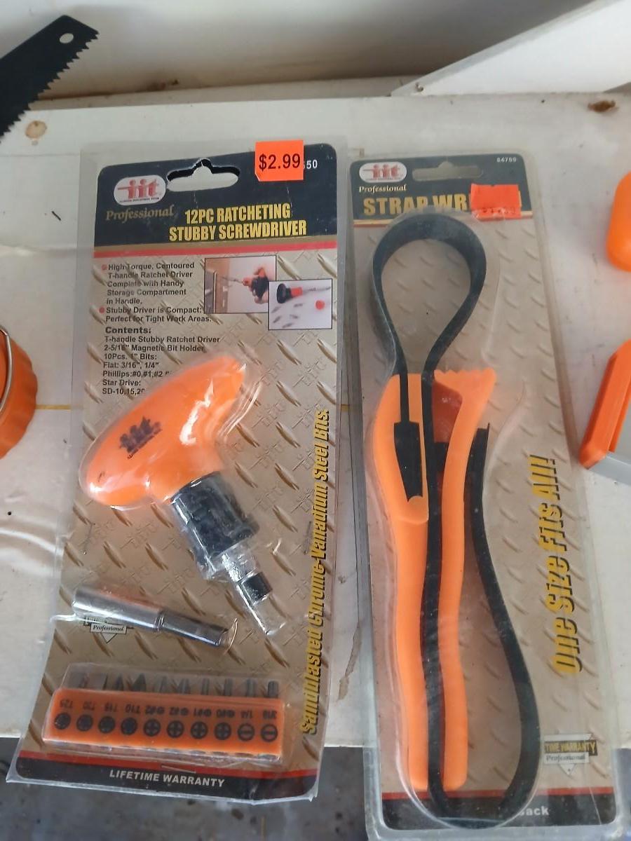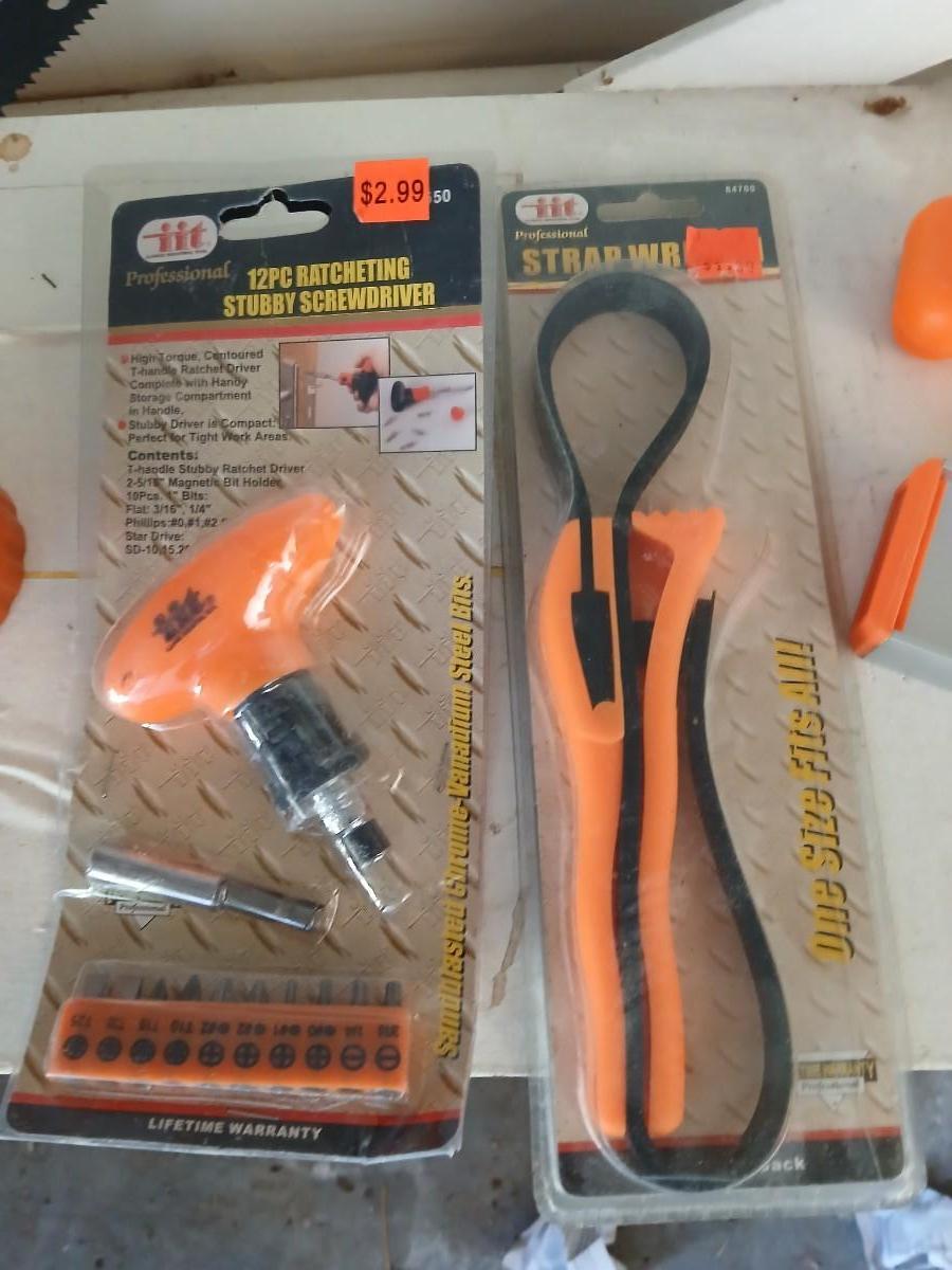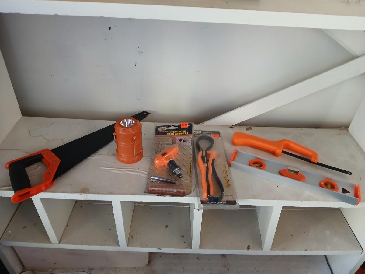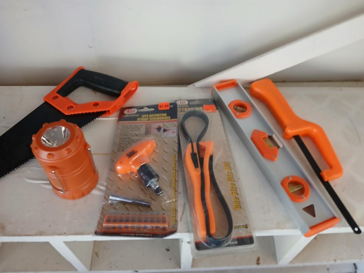 Grouping of orange tools, saws, level, strap wrench, flashlight, and more
