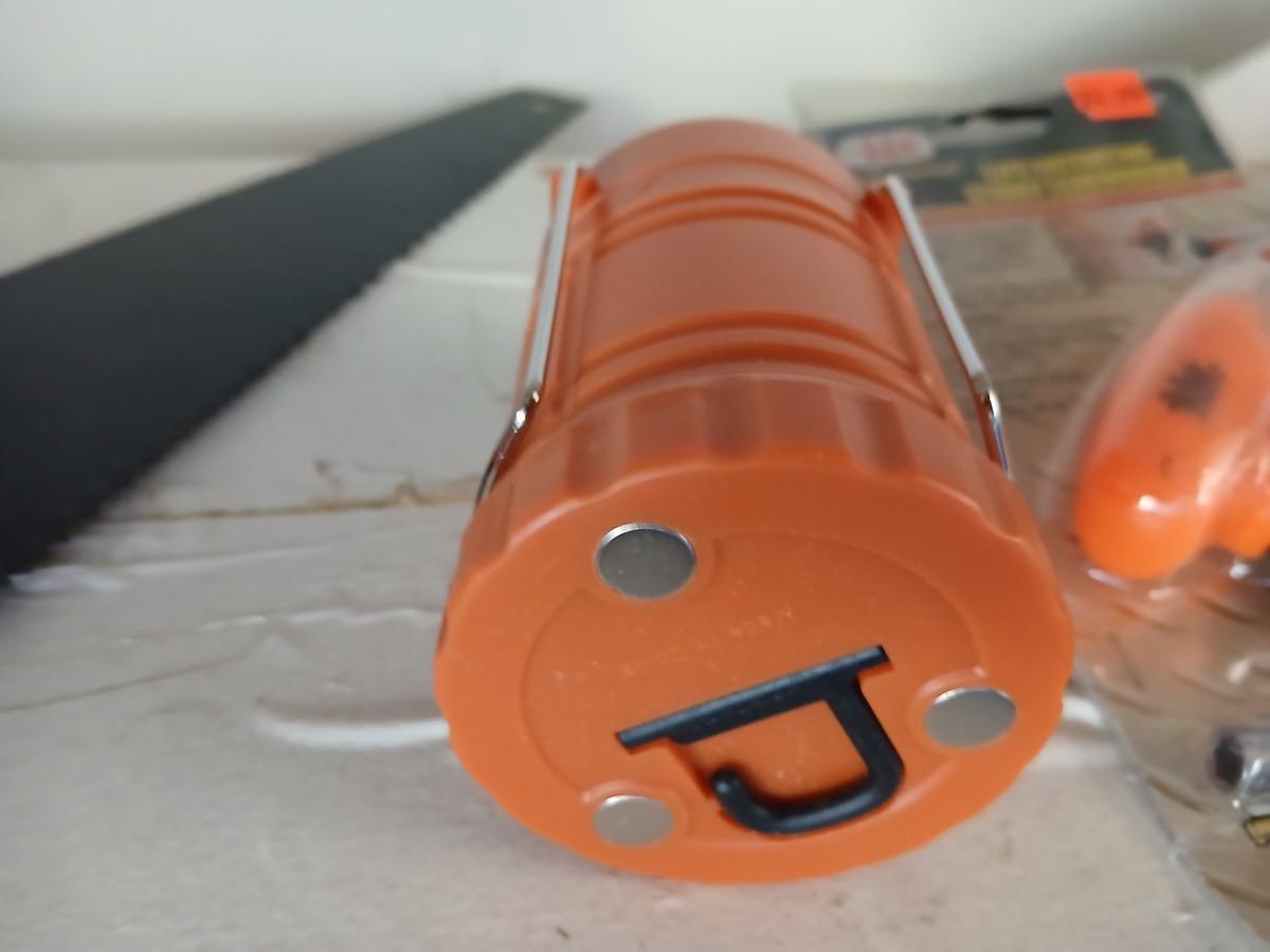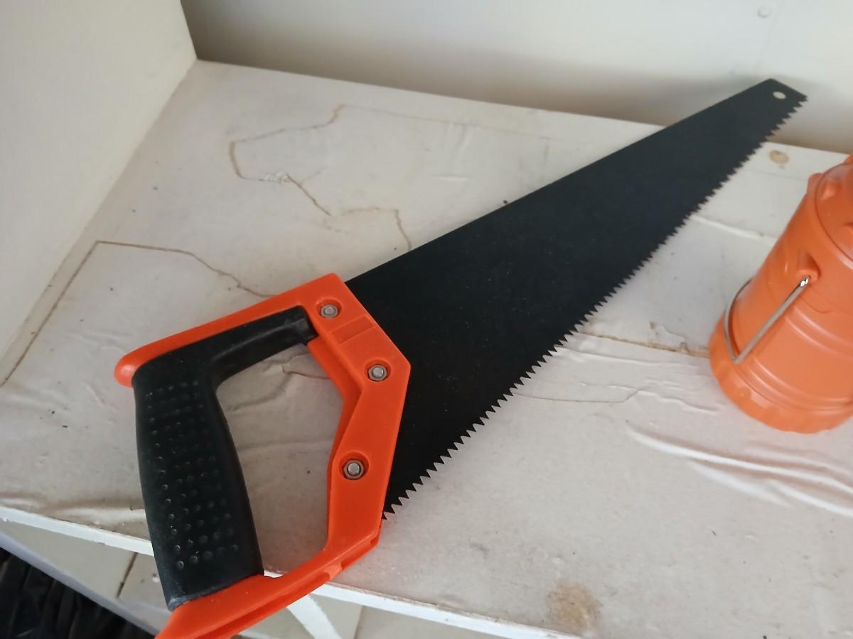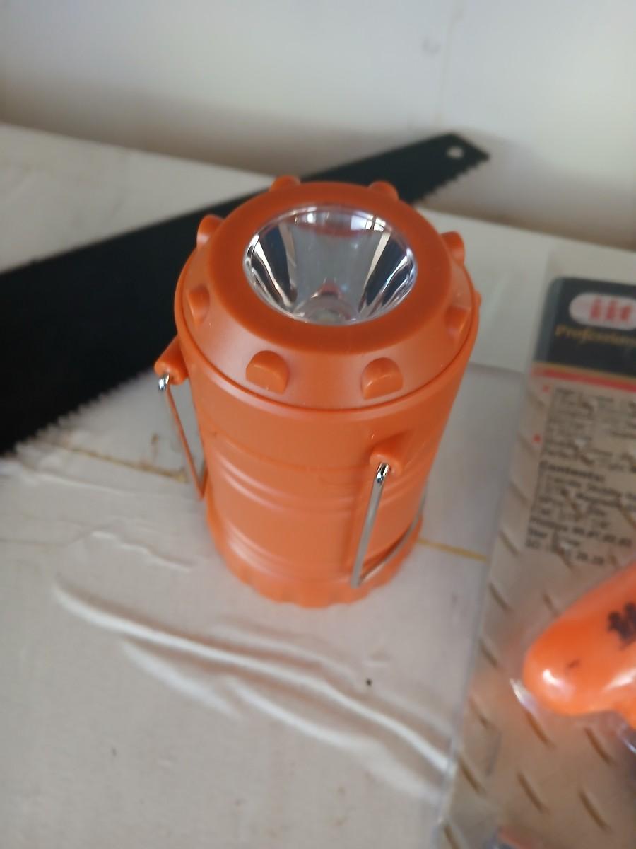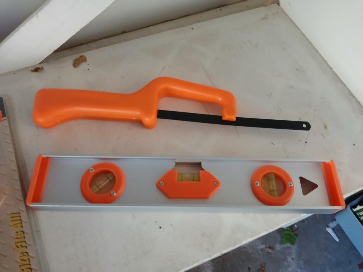 Grouping of orange tools, saws, level, strap wrench, flashlight, and more
