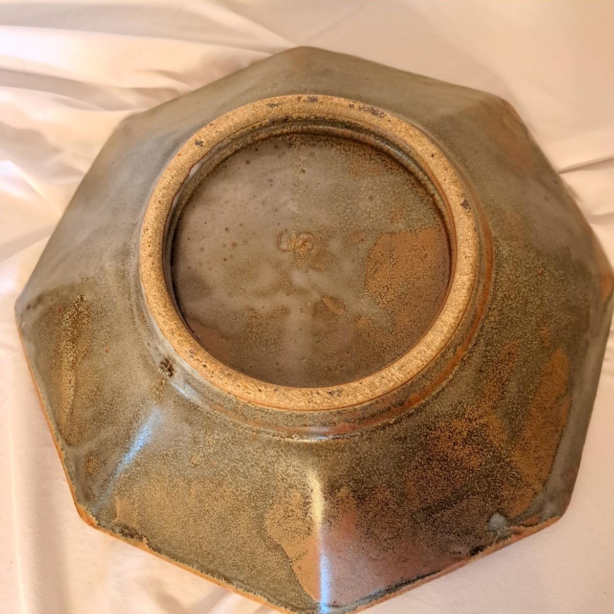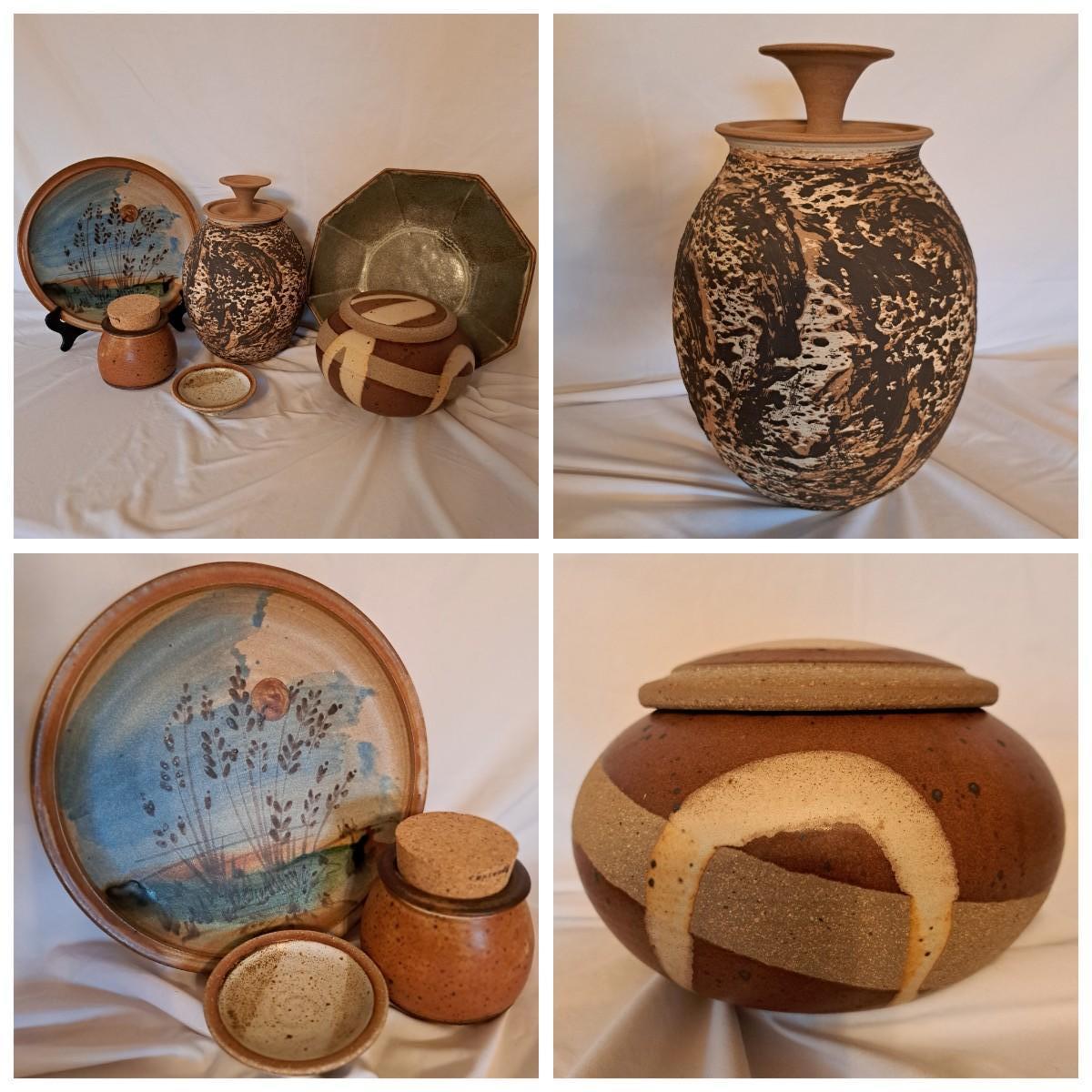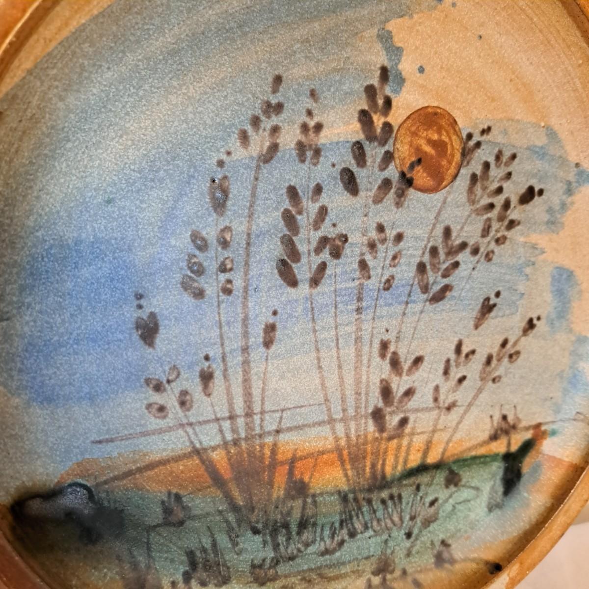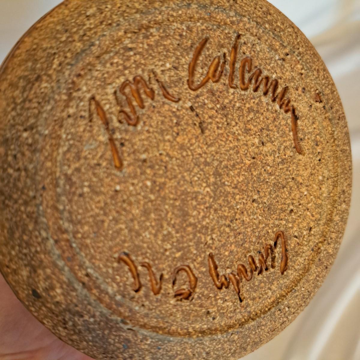 Grouping of six includes - the largest - a 12"H pottery jar with turned lid, an octagonal bowl with a bird in its center (possibly a heron), a hand-painted decorative wall plate with what might be an Outer Banks sunrise/sunset scene with sea oats blowing in the wind, a large lidded round jar with white swirls, a small crock with cork top and - the smallest - a 1.5"H dish (or top). All have makers' marks at bottom except for the small dish/top. The small crock appears.to be signed by Jim Coleman. Shipping available. Shipping can be costly. We suggest contacting our preferred local shipping provider, Postage Express, with dimensions and getting an estimate before bidding: (828) 255-9250 or shipping@postageexpressnc.com.