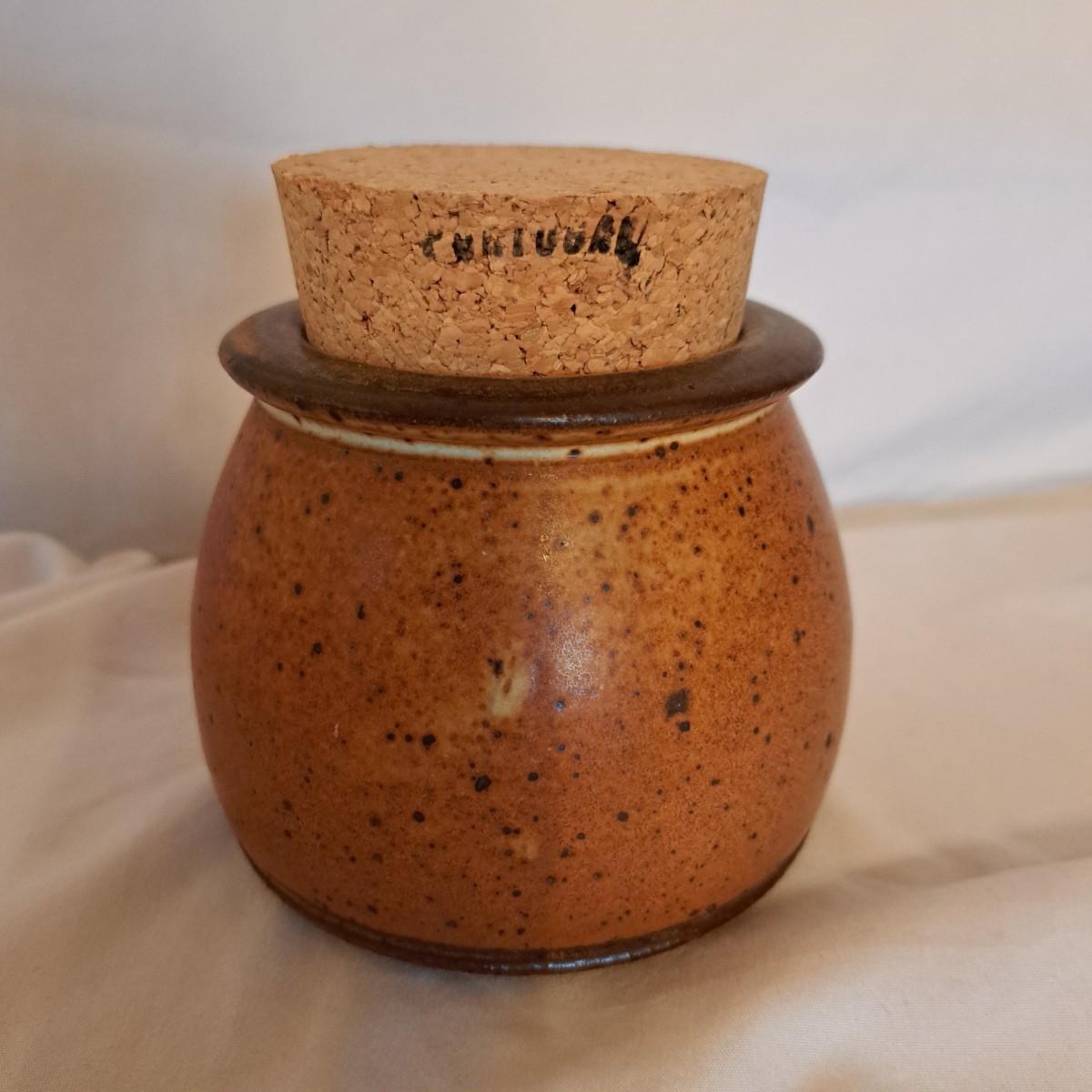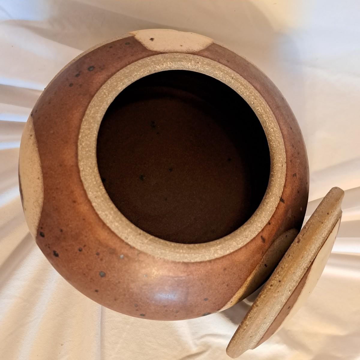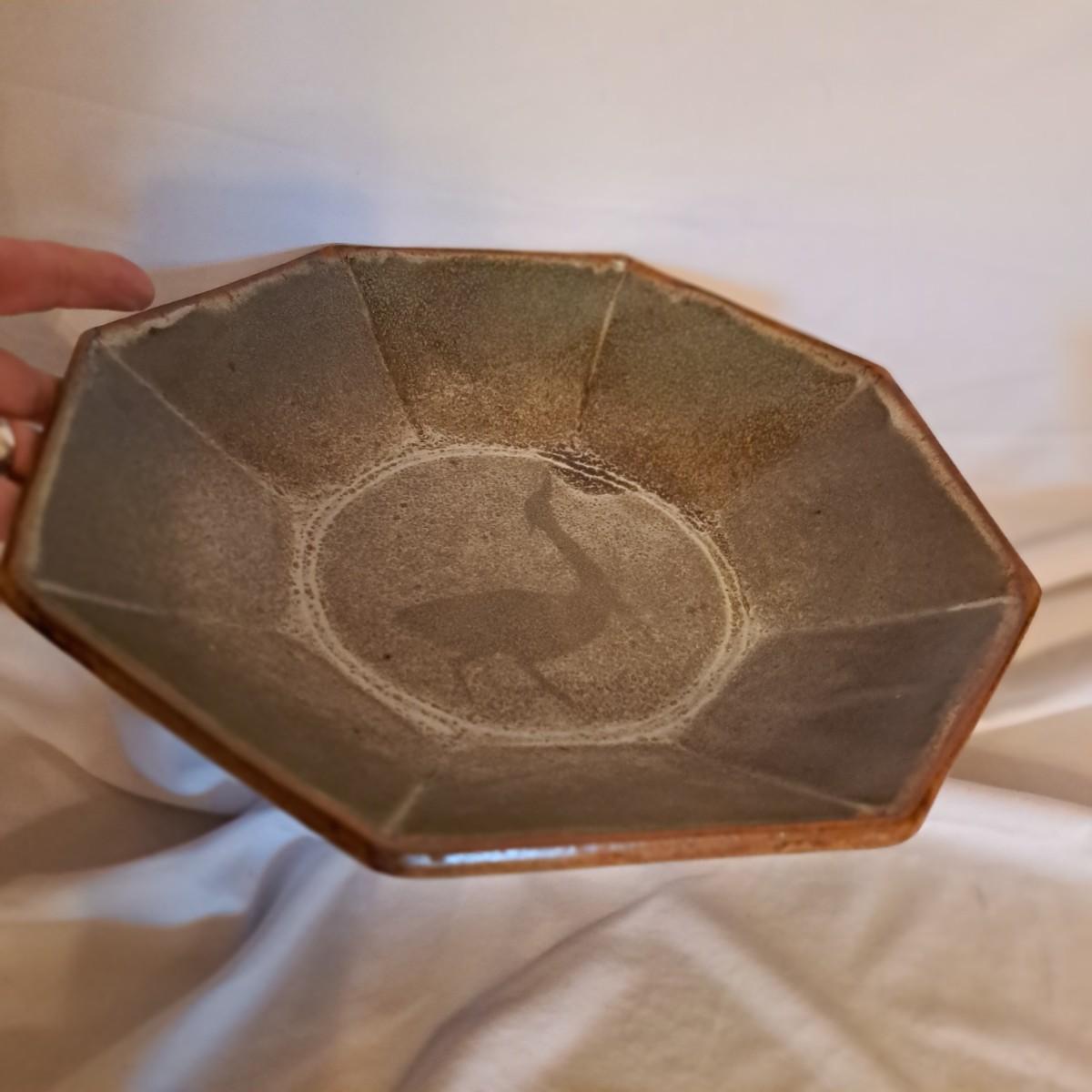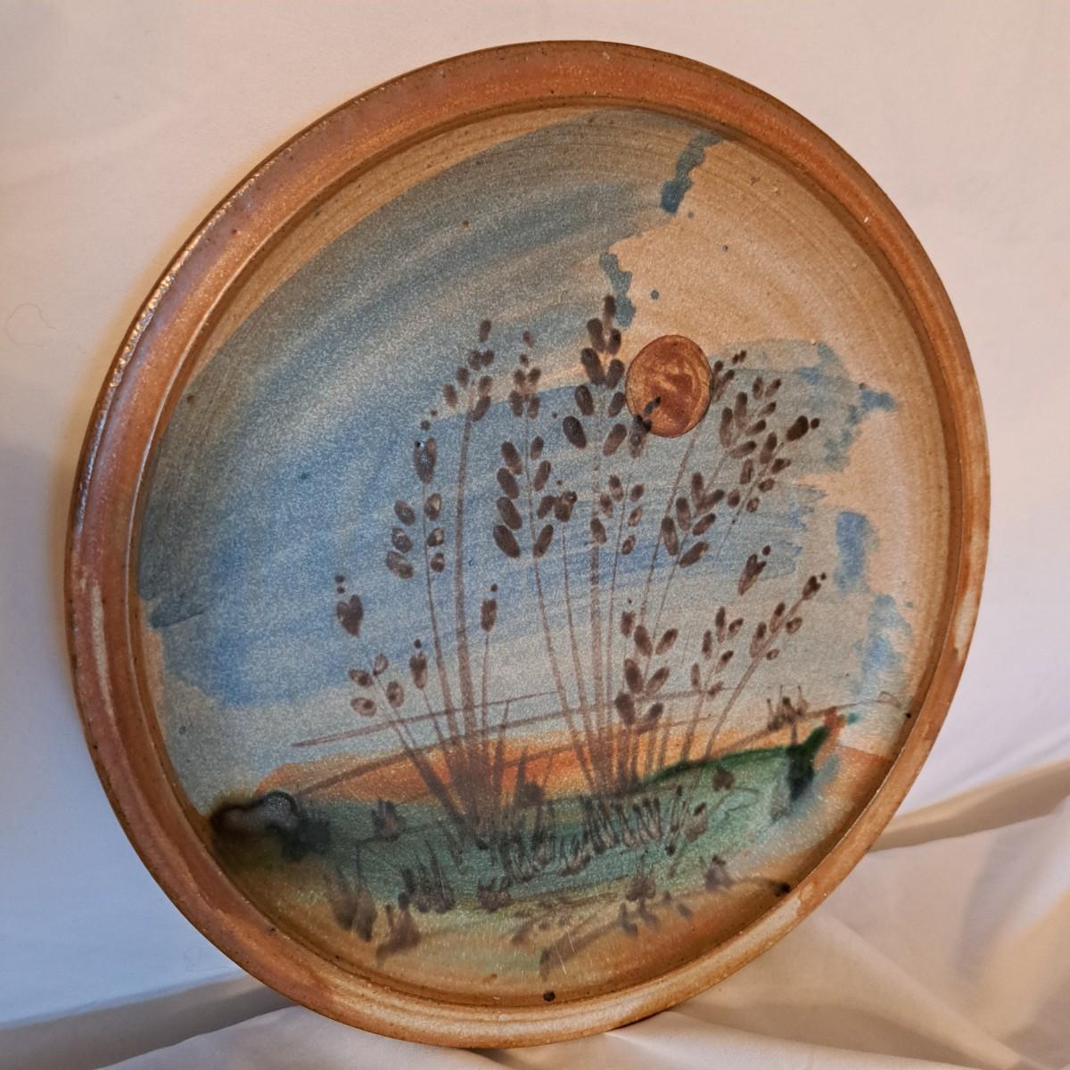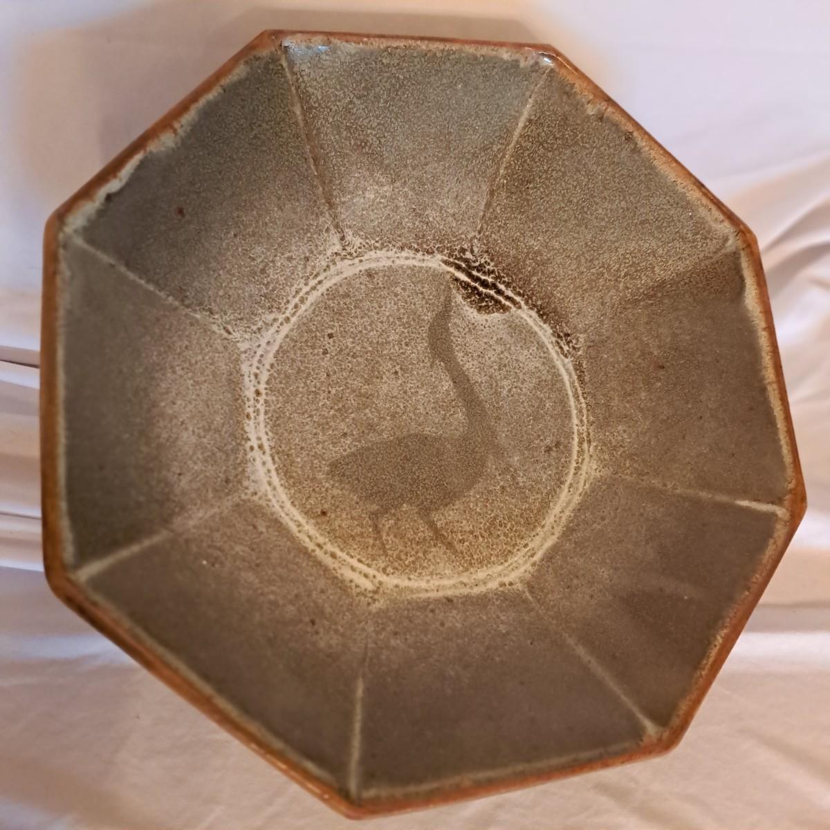 Grouping of six includes - the largest - a 12"H pottery jar with turned lid, an octagonal bowl with a bird in its center (possibly a heron), a hand-painted decorative wall plate with what might be an Outer Banks sunrise/sunset scene with sea oats blowing in the wind, a large lidded round jar with white swirls, a small crock with cork top and - the smallest - a 1.5"H dish (or top). All have makers' marks at bottom except for the small dish/top. The small crock appears.to be signed by Jim Coleman. Shipping available. Shipping can be costly. We suggest contacting our preferred local shipping provider, Postage Express, with dimensions and getting an estimate before bidding: (828) 255-9250 or shipping@postageexpressnc.com.