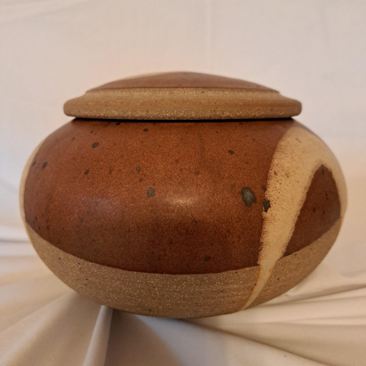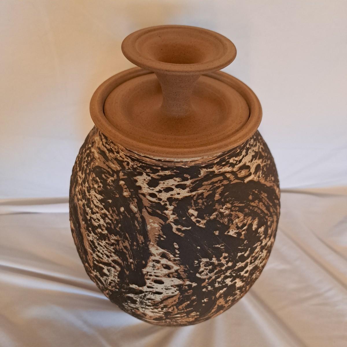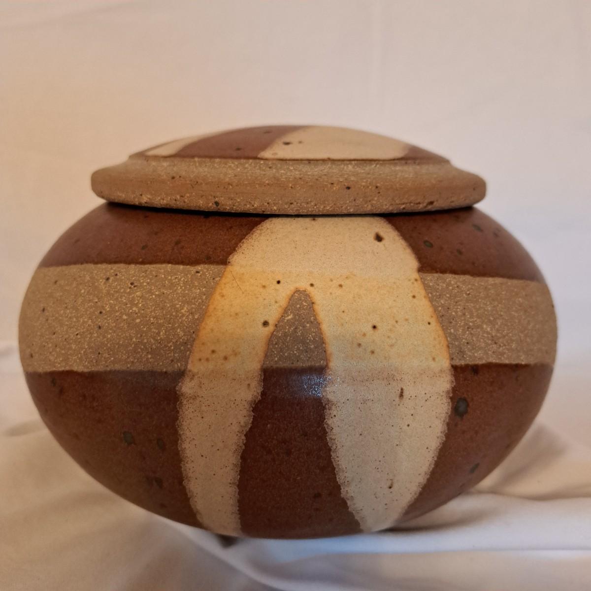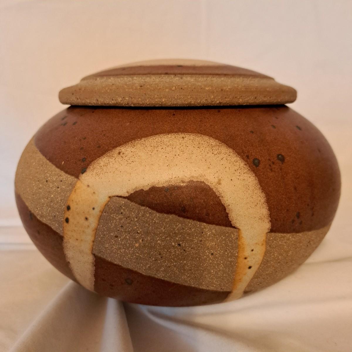 Grouping of six includes - the largest - a 12"H pottery jar with turned lid, an octagonal bowl with a bird in its center (possibly a heron), a hand-painted decorative wall plate with what might be an Outer Banks sunrise/sunset scene with sea oats blowing in the wind, a large lidded round jar with white swirls, a small crock with cork top and - the smallest - a 1.5"H dish (or top). All have makers' marks at bottom except for the small dish/top. The small crock appears.to be signed by Jim Coleman. Shipping available. Shipping can be costly. We suggest contacting our preferred local shipping provider, Postage Express, with dimensions and getting an estimate before bidding: (828) 255-9250 or shipping@postageexpressnc.com.