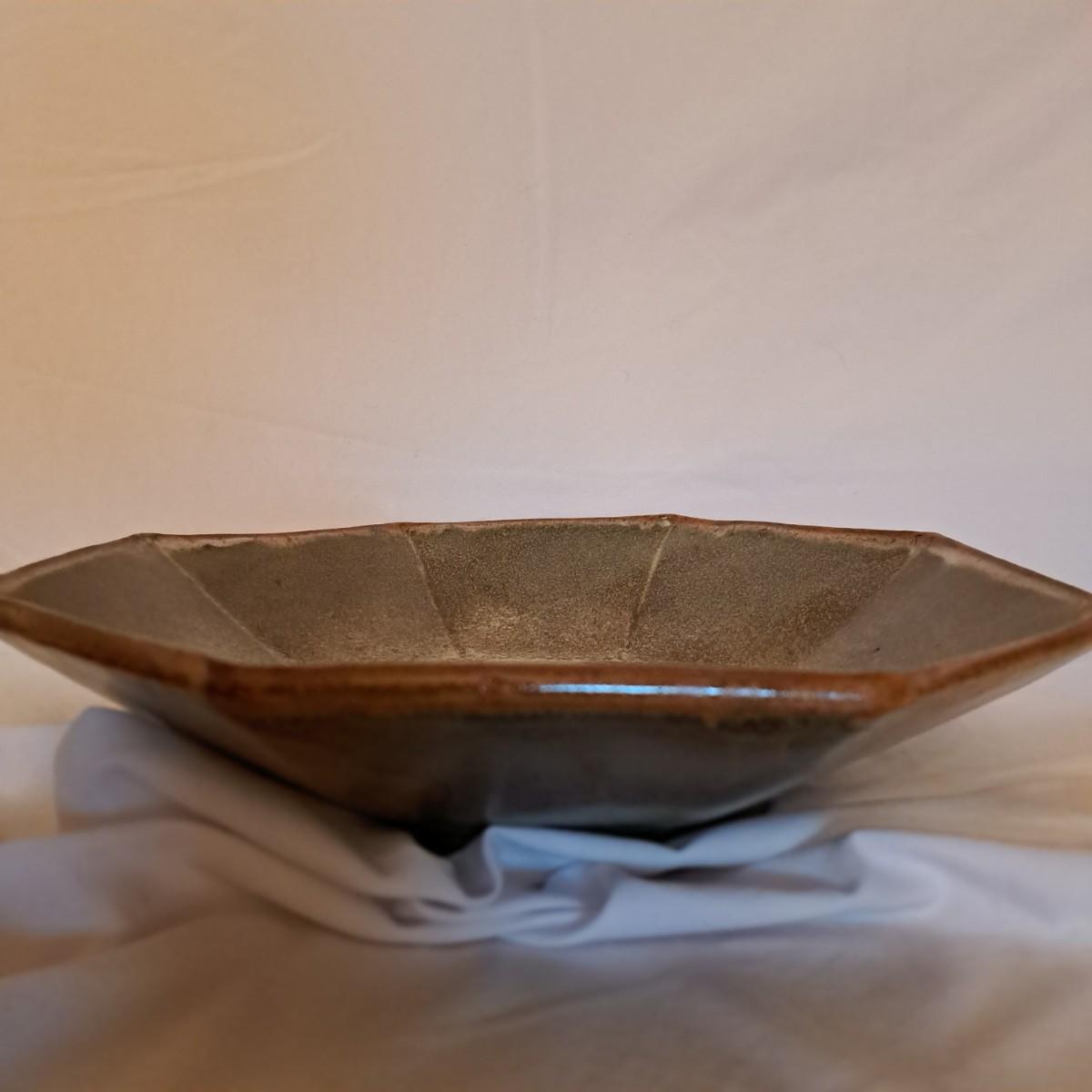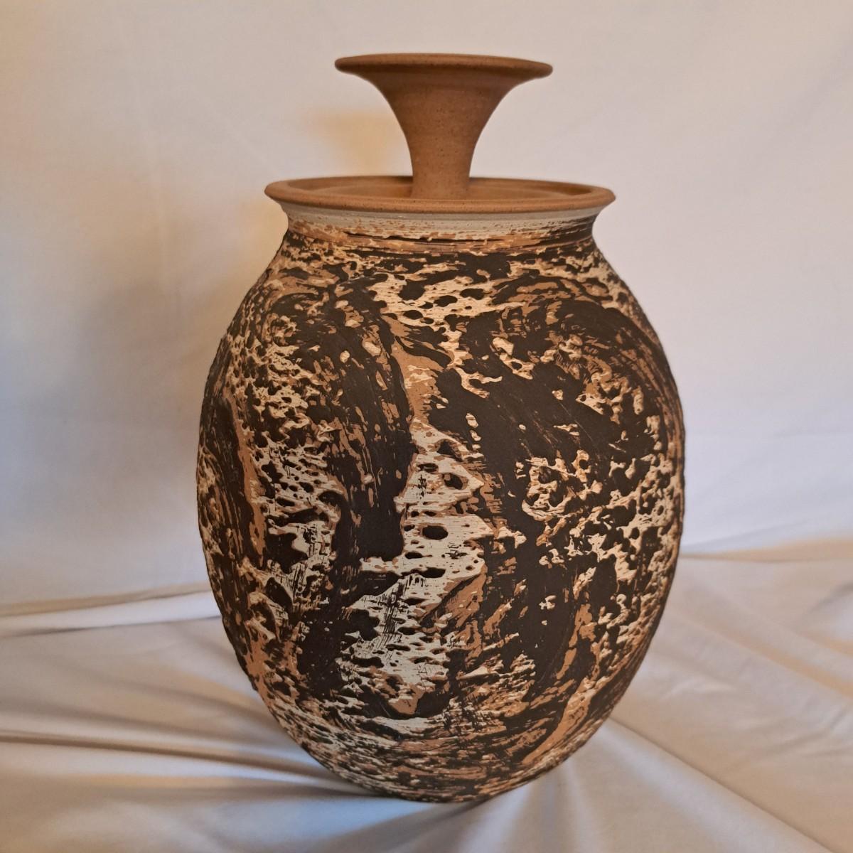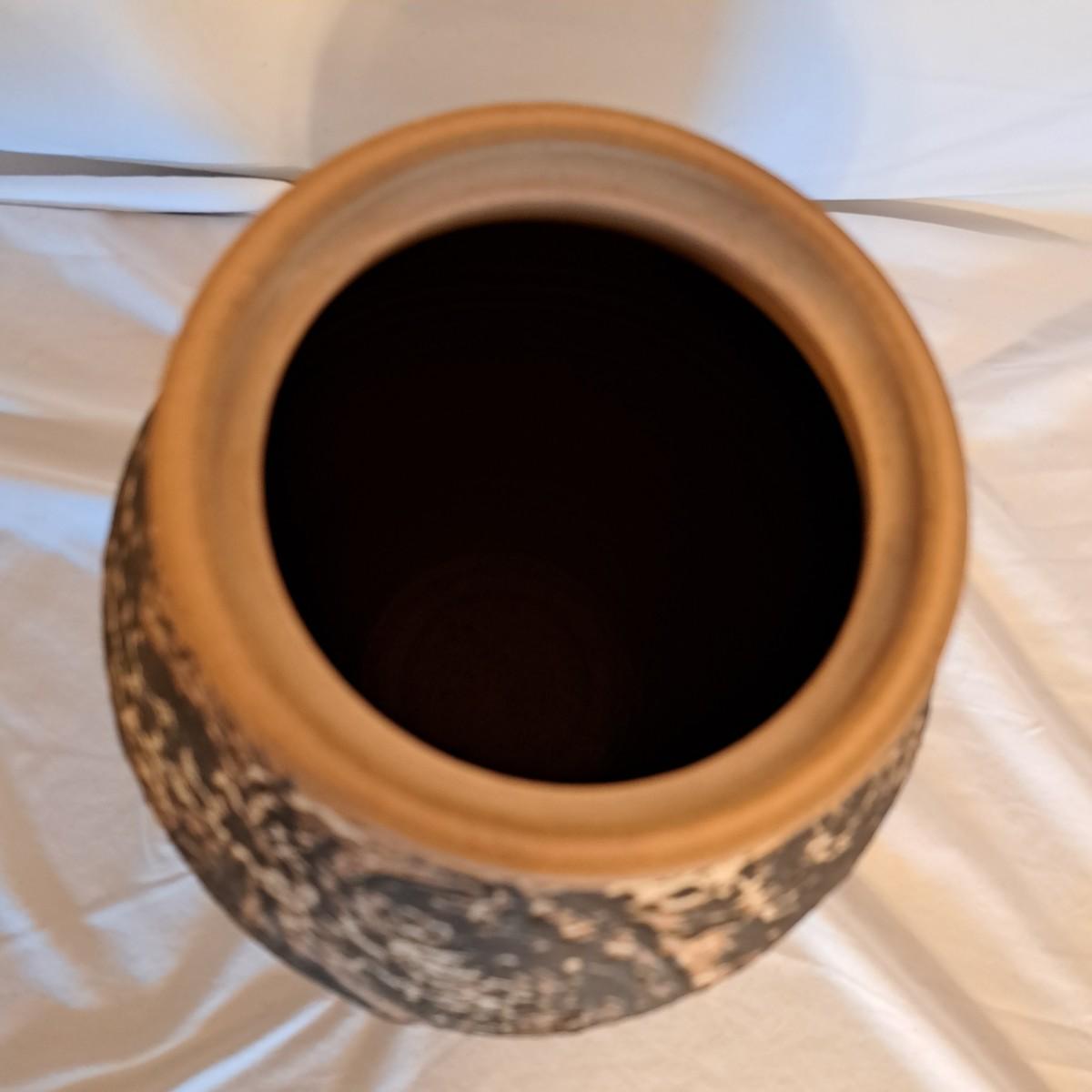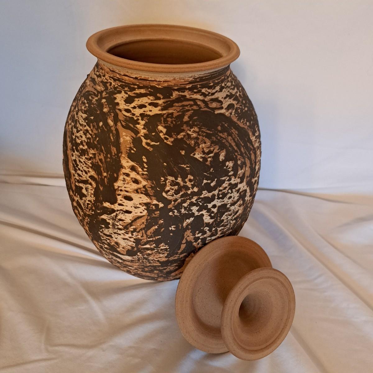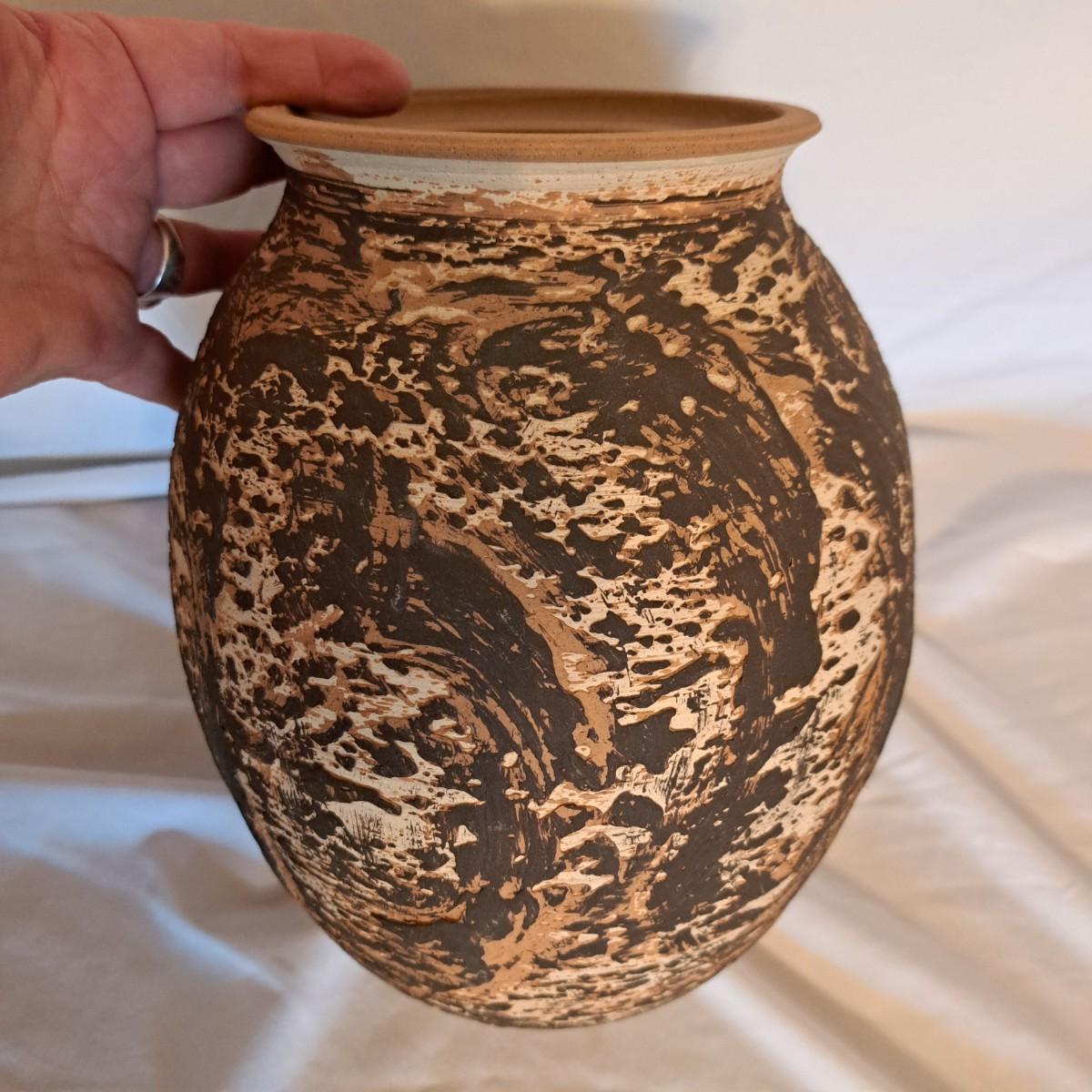 Grouping of six includes - the largest - a 12"H pottery jar with turned lid, an octagonal bowl with a bird in its center (possibly a heron), a hand-painted decorative wall plate with what might be an Outer Banks sunrise/sunset scene with sea oats blowing in the wind, a large lidded round jar with white swirls, a small crock with cork top and - the smallest - a 1.5"H dish (or top). All have makers' marks at bottom except for the small dish/top. The small crock appears.to be signed by Jim Coleman. Shipping available. Shipping can be costly. We suggest contacting our preferred local shipping provider, Postage Express, with dimensions and getting an estimate before bidding: (828) 255-9250 or shipping@postageexpressnc.com.