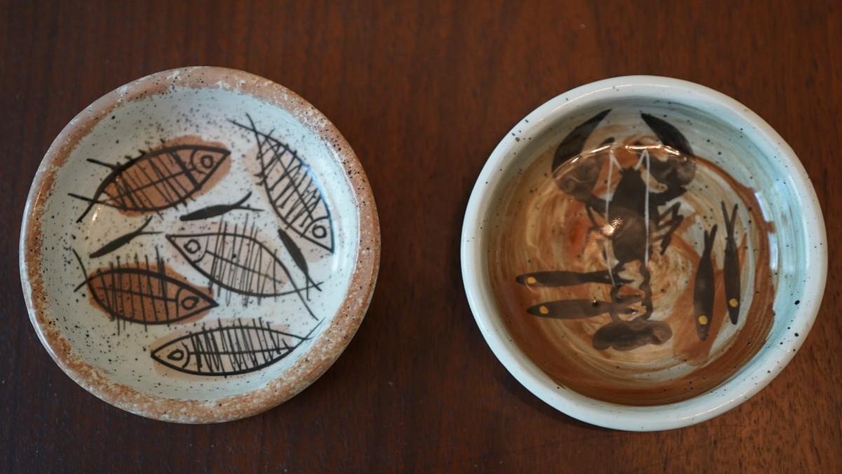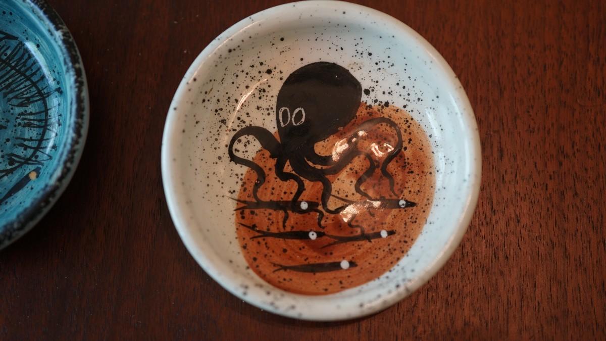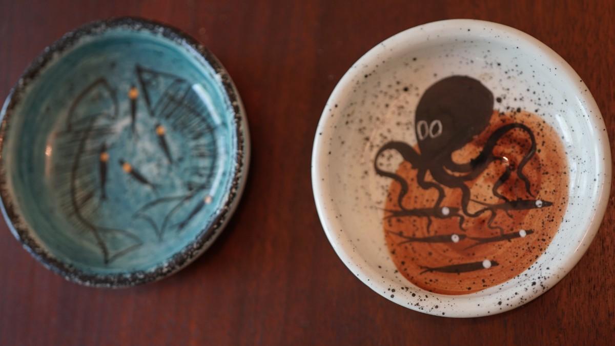glazed ceramic with hand decoration of sea creatures and and black mottled accents.