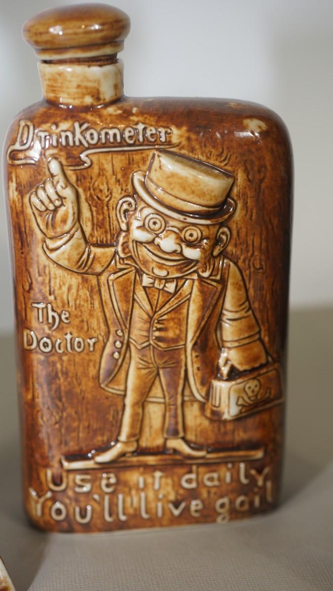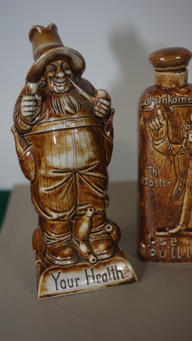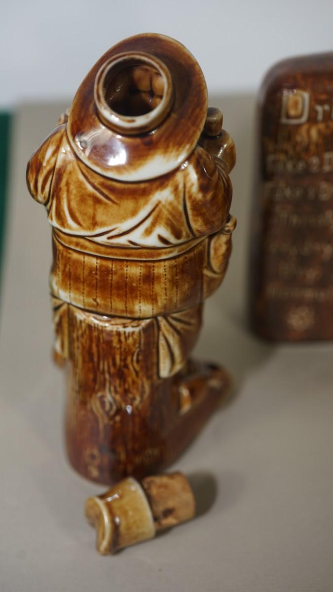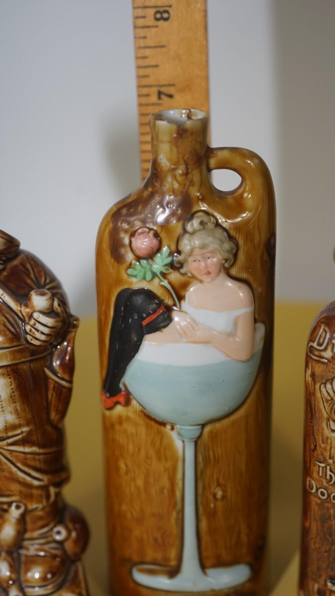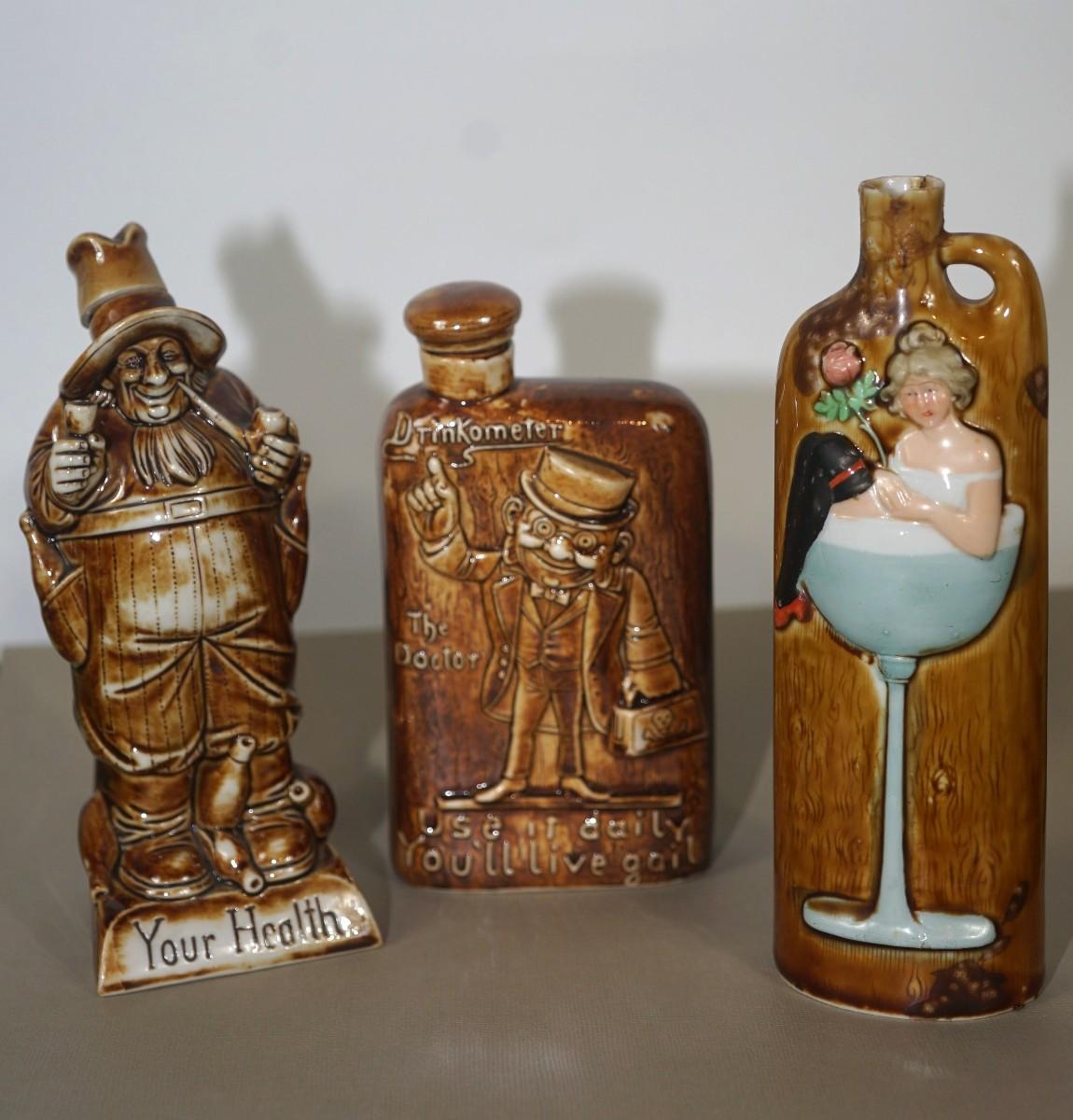 grouping of three liquor bottles German , brown glaze , character forms with hand painted glazes.