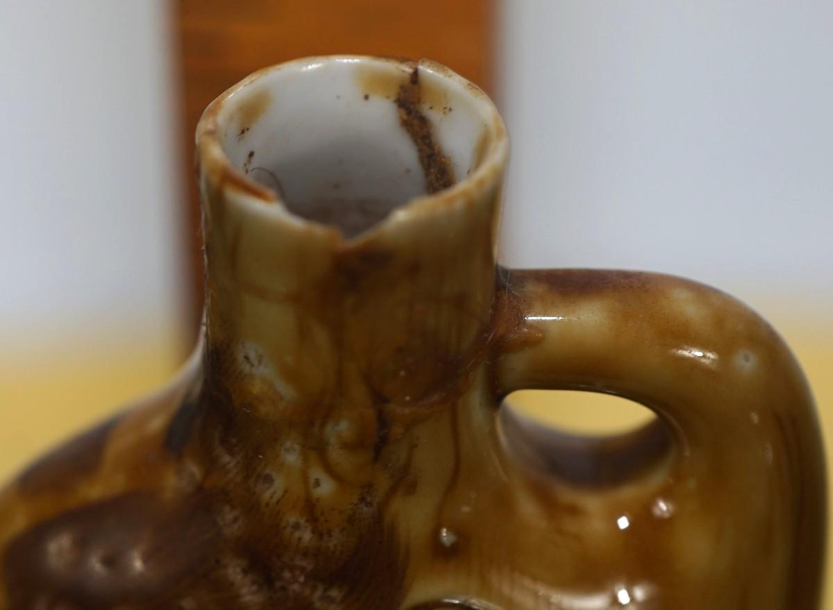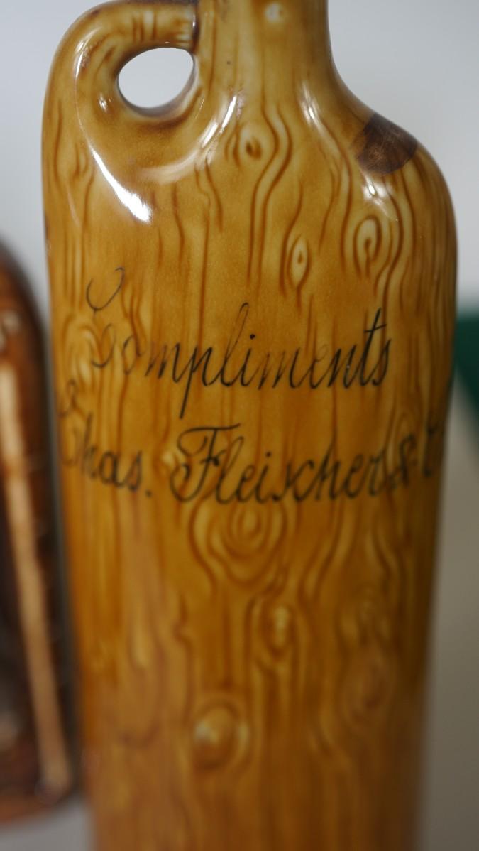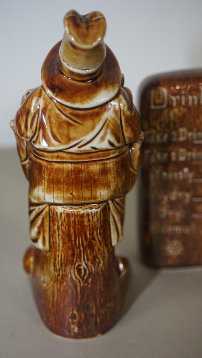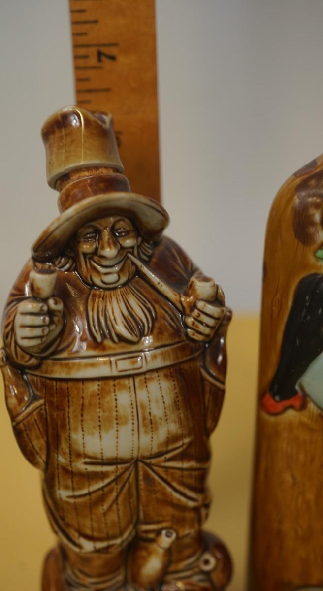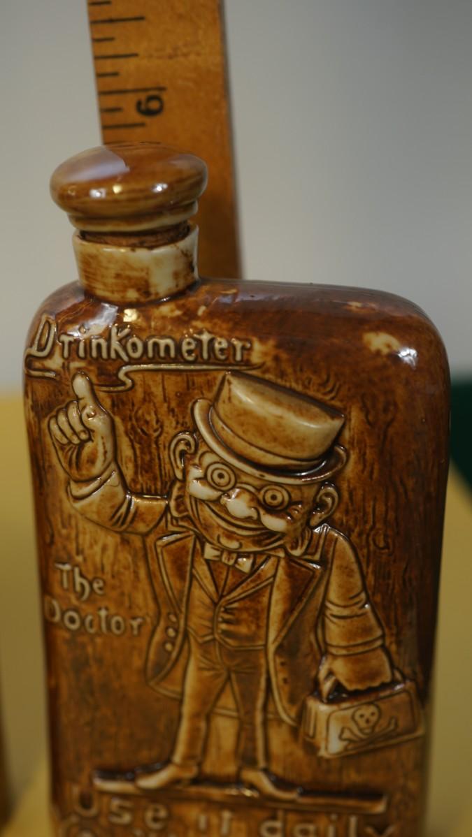 grouping of three liquor bottles German , brown glaze , character forms with hand painted glazes.