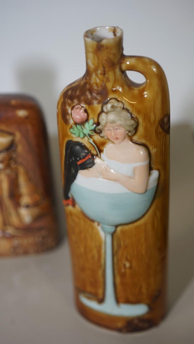 GROUPING OF THREE GERMAN ANTIQUE CERAMIC LIQUOR FLASKS - CHARACTER FORMS