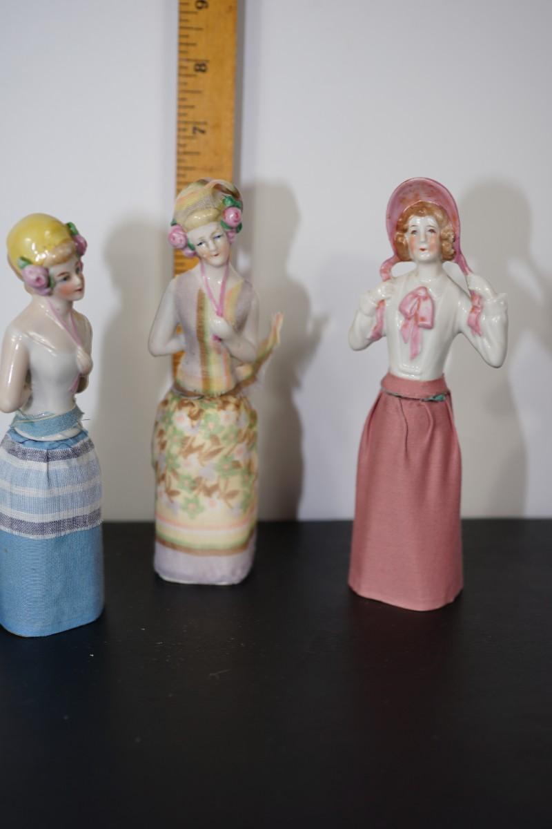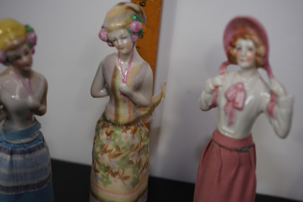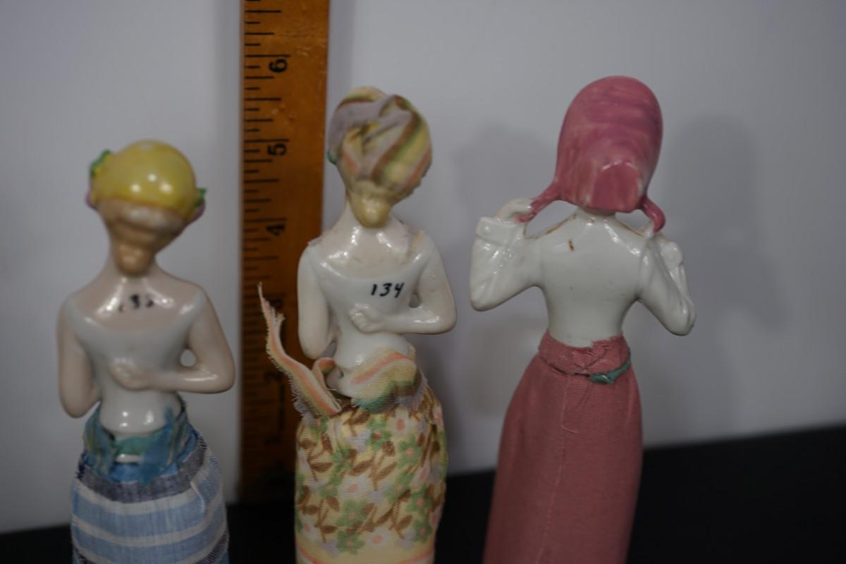GROUPING OF THREE PIN CUSHION PORCELIAN HALF DOLLS.