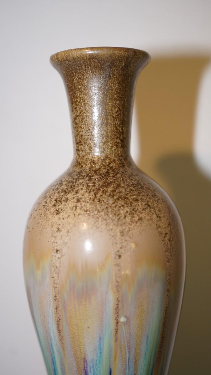 18" vase with green over glaze to the speckled brown gold tones at the neck and top marked T8 B6 on base