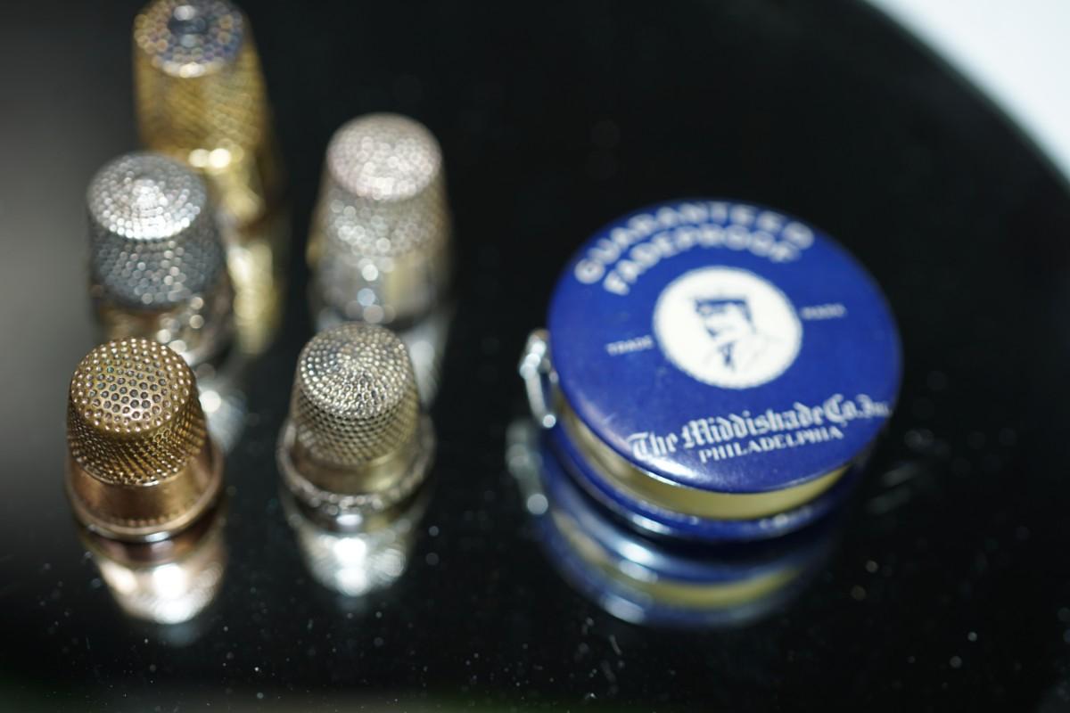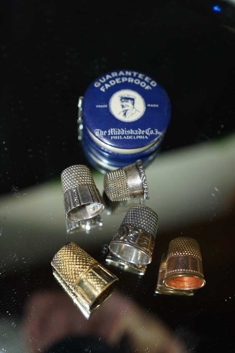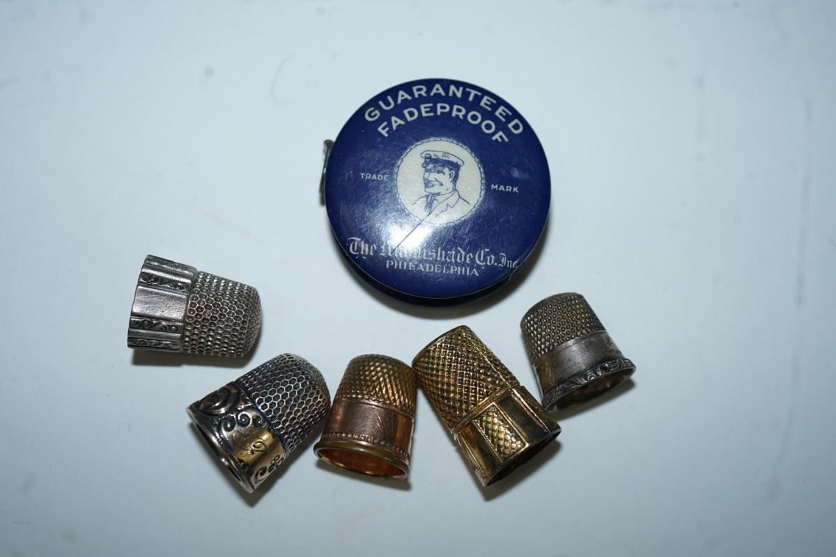 GROUPING OF THREE STERLING ANTIQUE THIMBLES, STERLING , ROSE GOLD AND BRASS. VINTAGE ADVERTISING TAPE MEASURE