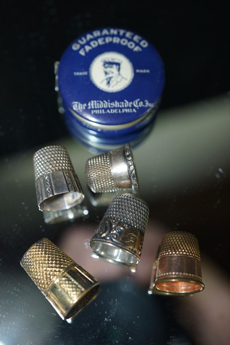 grouping of five thimbles two are stamped sterling, one maybe silverplate, one is rose gold plate and the other is brass,