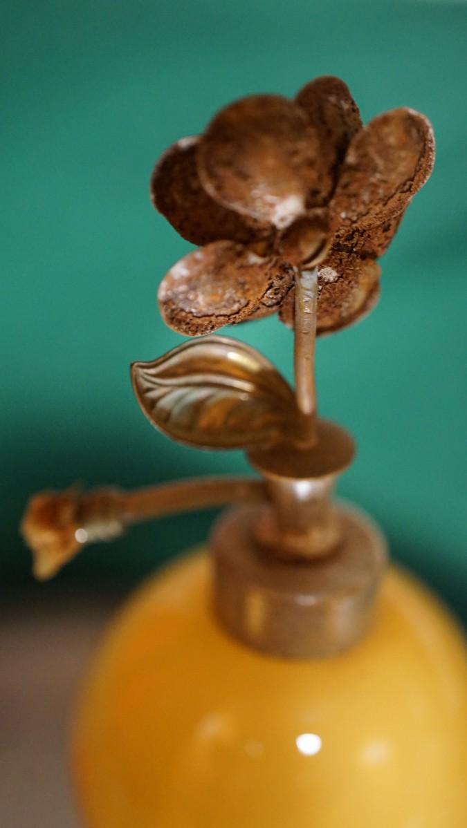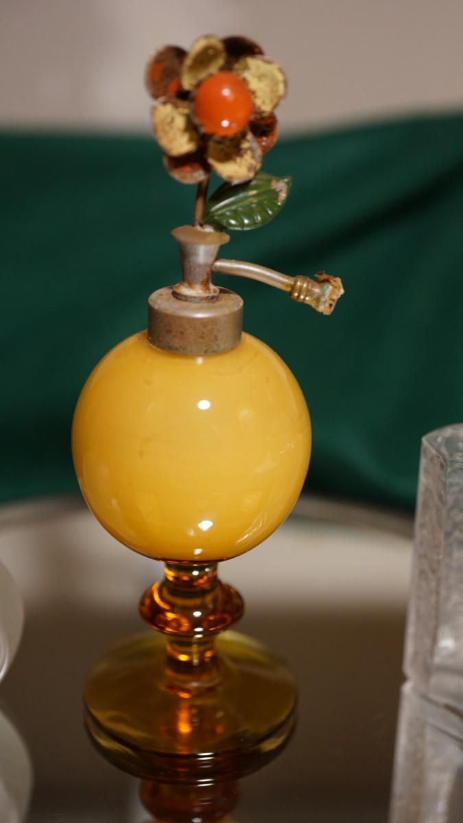 Art deco style. The yellow ball formed perfume is missing the bulb. needs a bit of fine cleaning where the top enters the bottle, staining and water residue. a bit of paint loss on the top , 7" total height