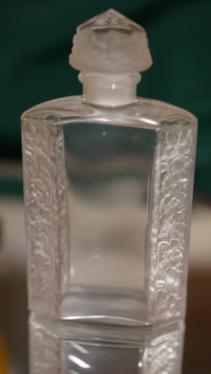 The square form bottle with the etched sides is etched on base Made in France tiny chips on the stopper interior . 4" in height.