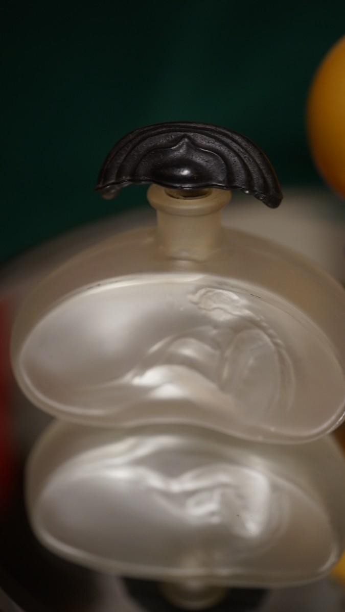 art deco style frosted glass bottle with the black stopper is just under 4" and good condition and not signed