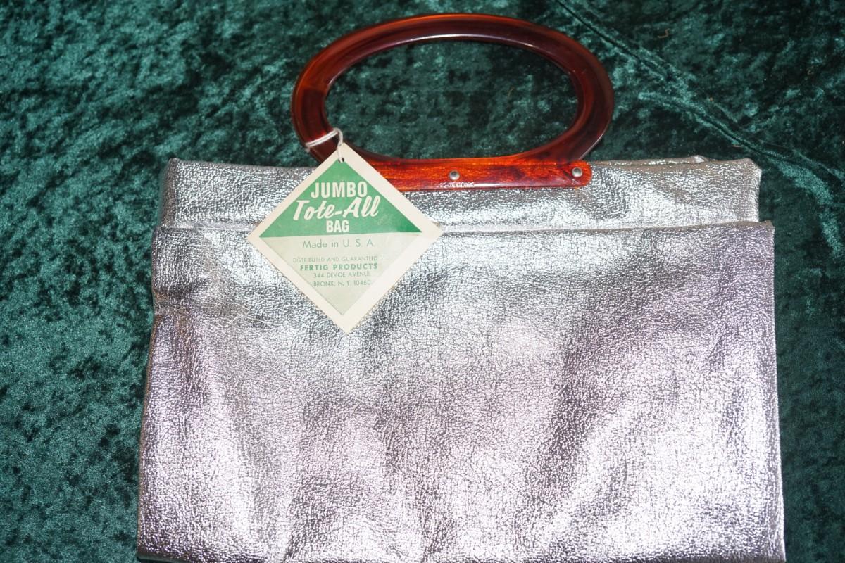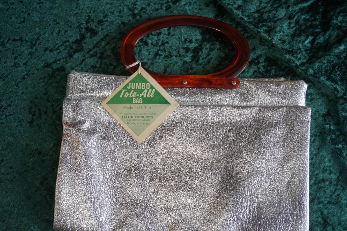 The silver cloth style handbag with the plastic handle has not been used and has the original tags.