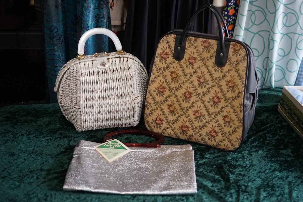 GROUPING OF THREE VINTAGE PURSES /WHITE WOVEN STRAW, CLOTH NEEDLEPOINT STYLE FABRIC &VINYL, SILVERTONE FABRIC WITH PLASTIC HANDLE NOT USED