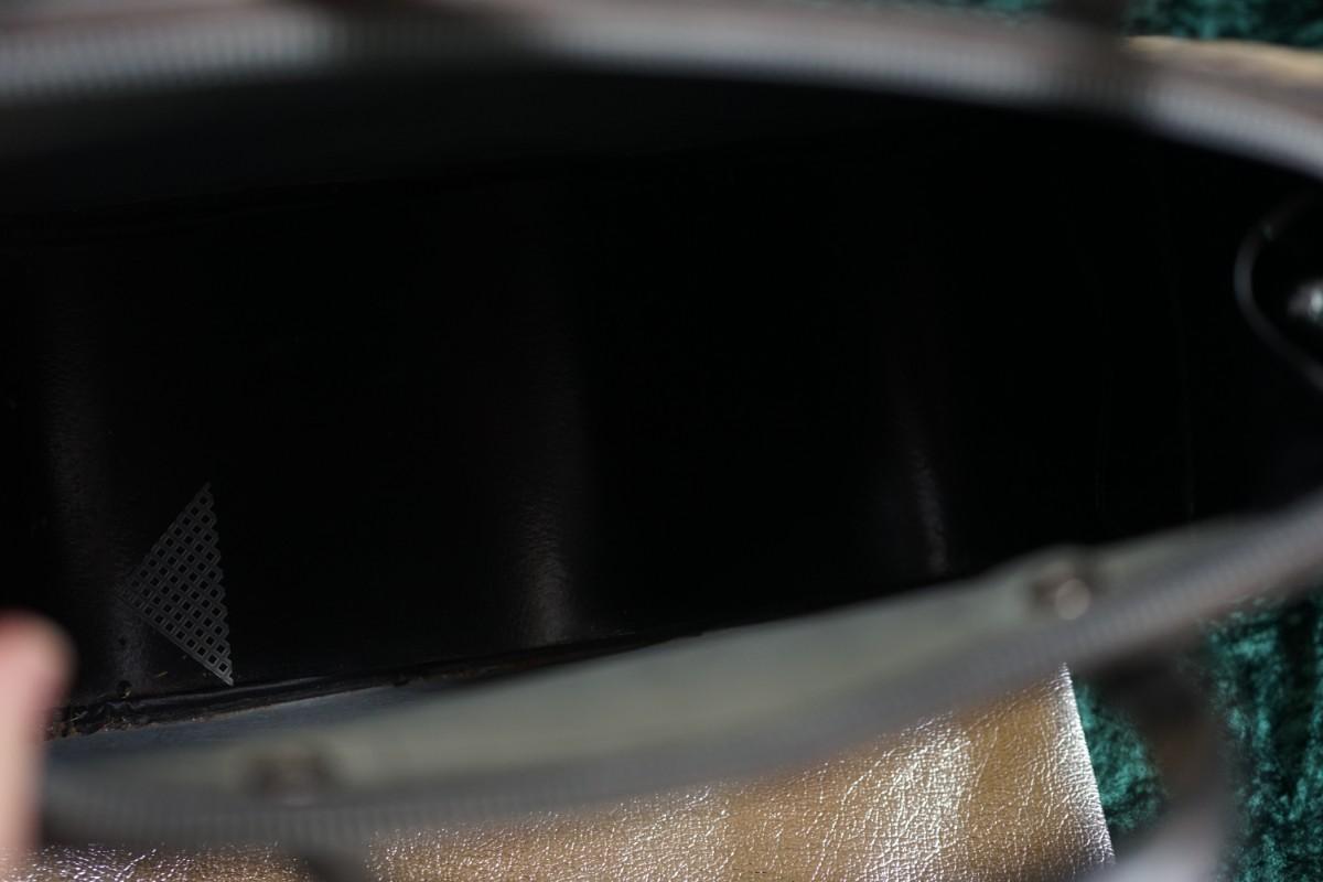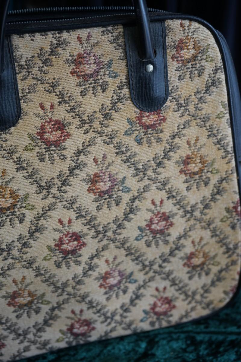 The cloth and vinyl bag with needlepoint style fabric is in fair condition. The vinyl needs some cleaning / the interior is slightly dry the cloth exterior has some discoloration from age.