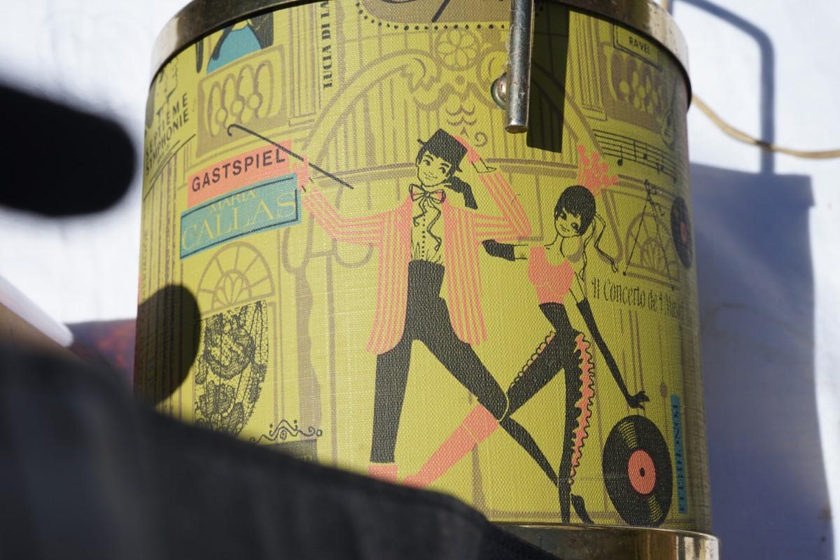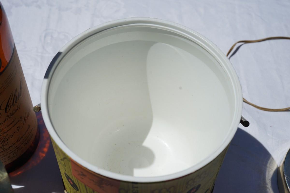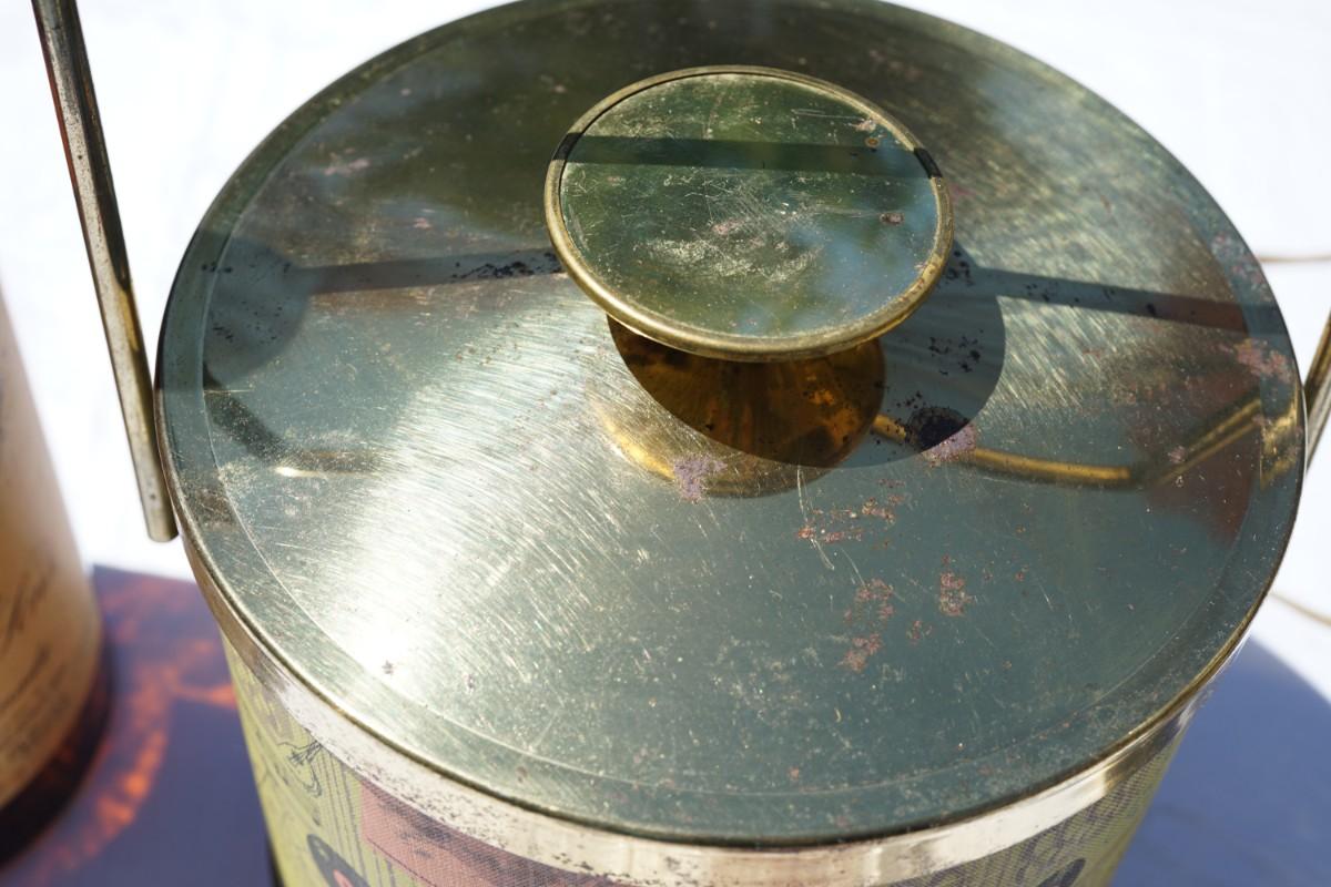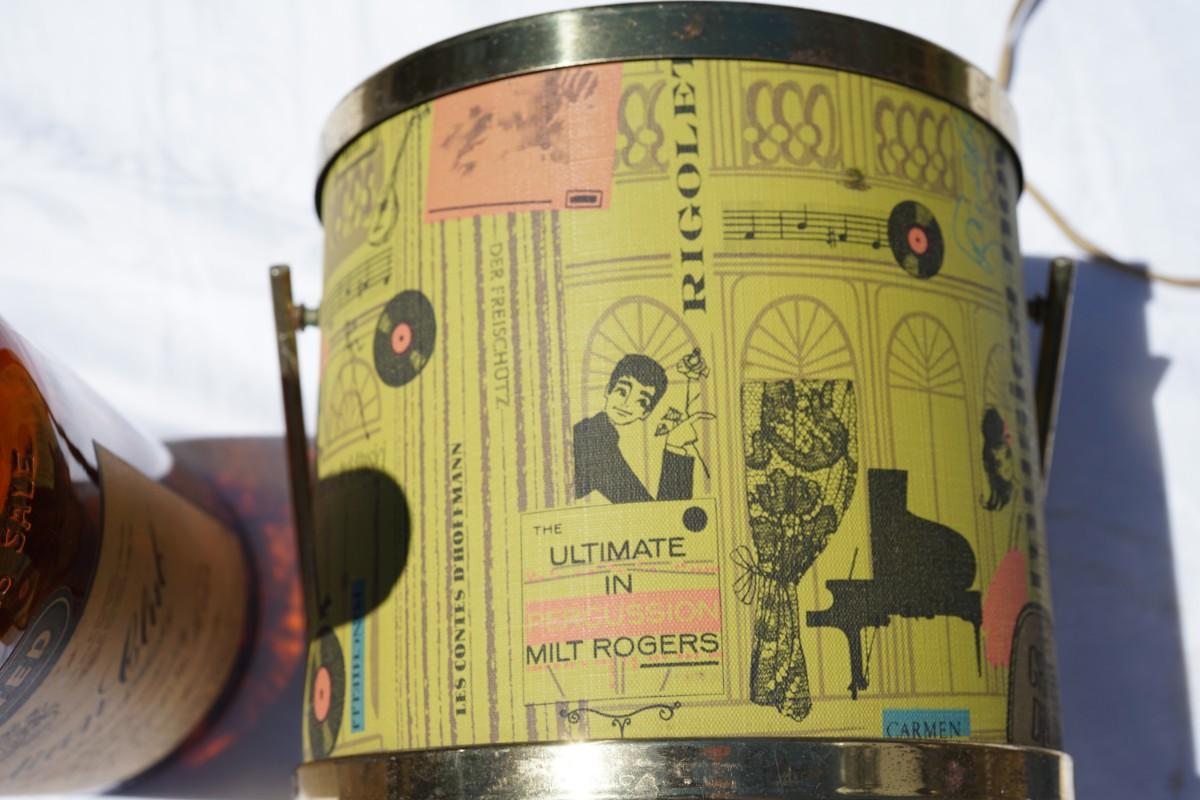 ice bucket has a vinyl covering of the classic 60's themes, records, people dancing in 60's colors. some wear and pitting to the brass accent lid and top.