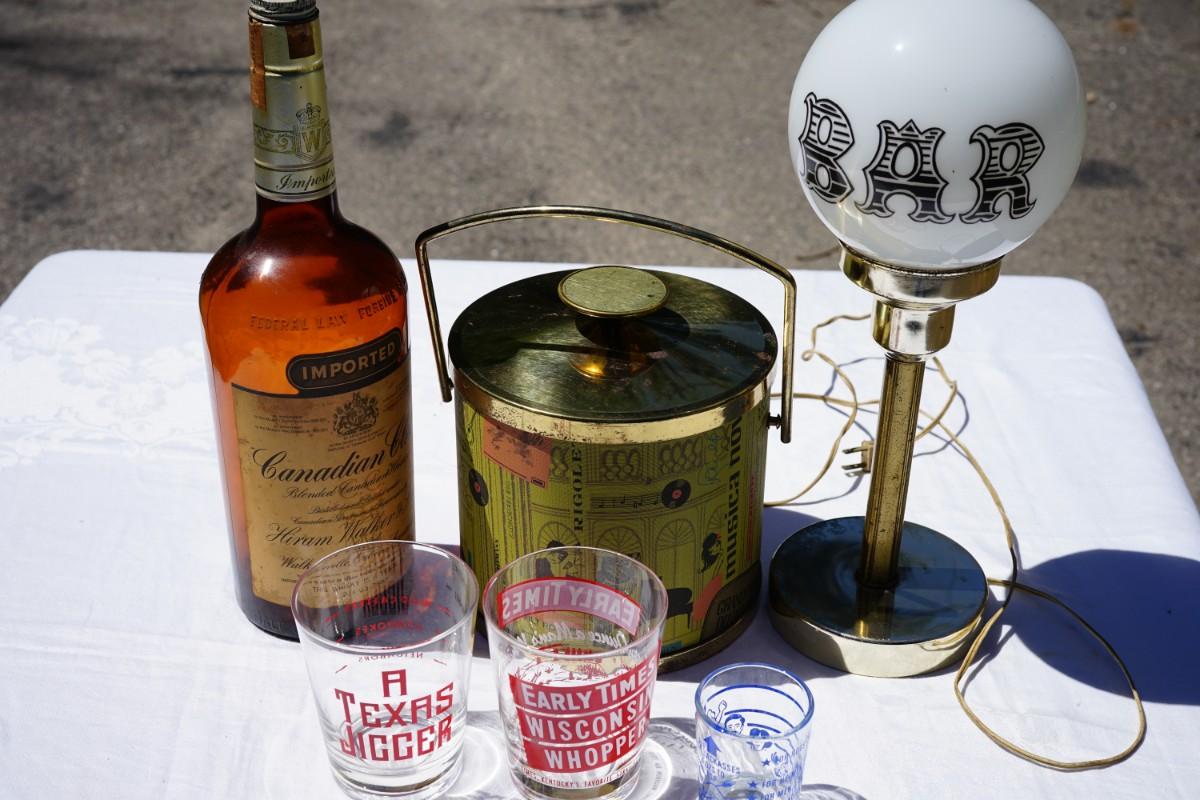 GROUPING OF VINTAGE BAR ITEMS/ VERY CLASSIC ICE BUCKET/ "BAR" GLOBE LAMP/ SHOT GLASSES