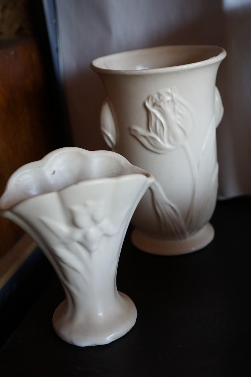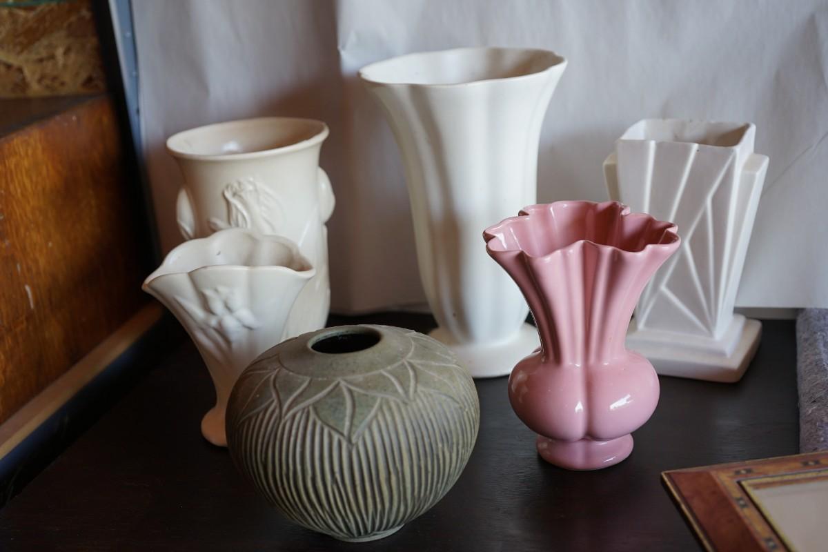 from the early 1900's a group of five vases of shawnee and other. various sizes.