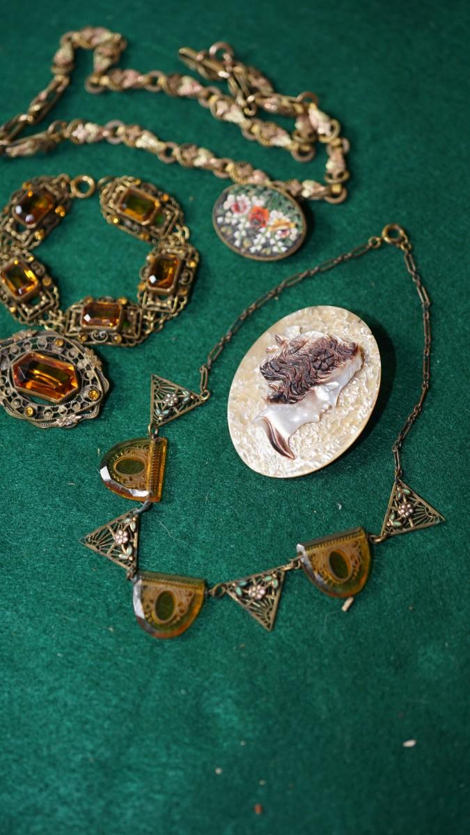 GROUPING OF VINTAGE JEWELRY FROM 1920'S AMBER COLORED STONE AND FILLIGREE / SIX PIECES