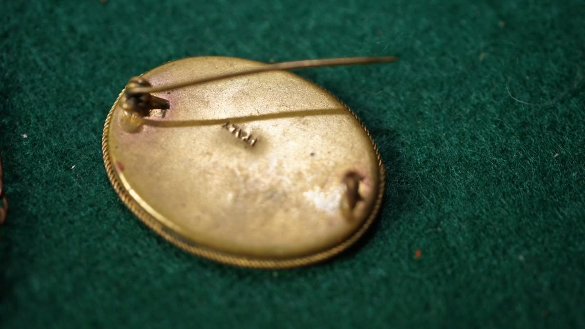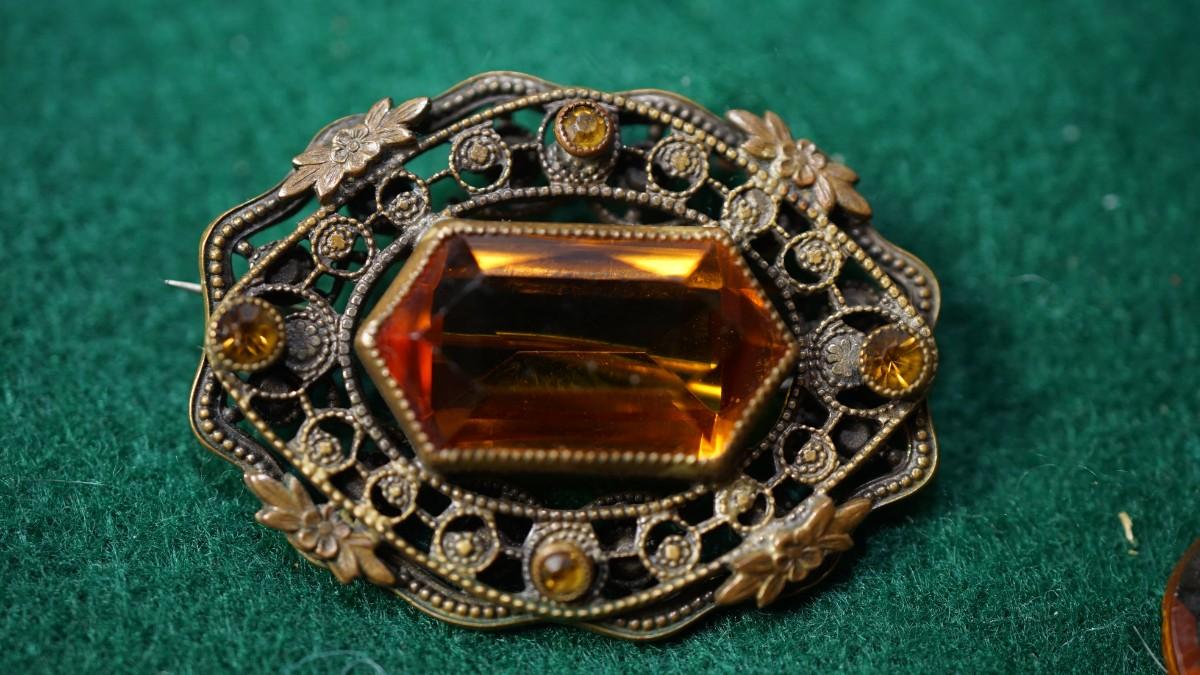 A pin that slightly matches above with a amber facet cut stone on brass filligree 1 1/2" by 1"