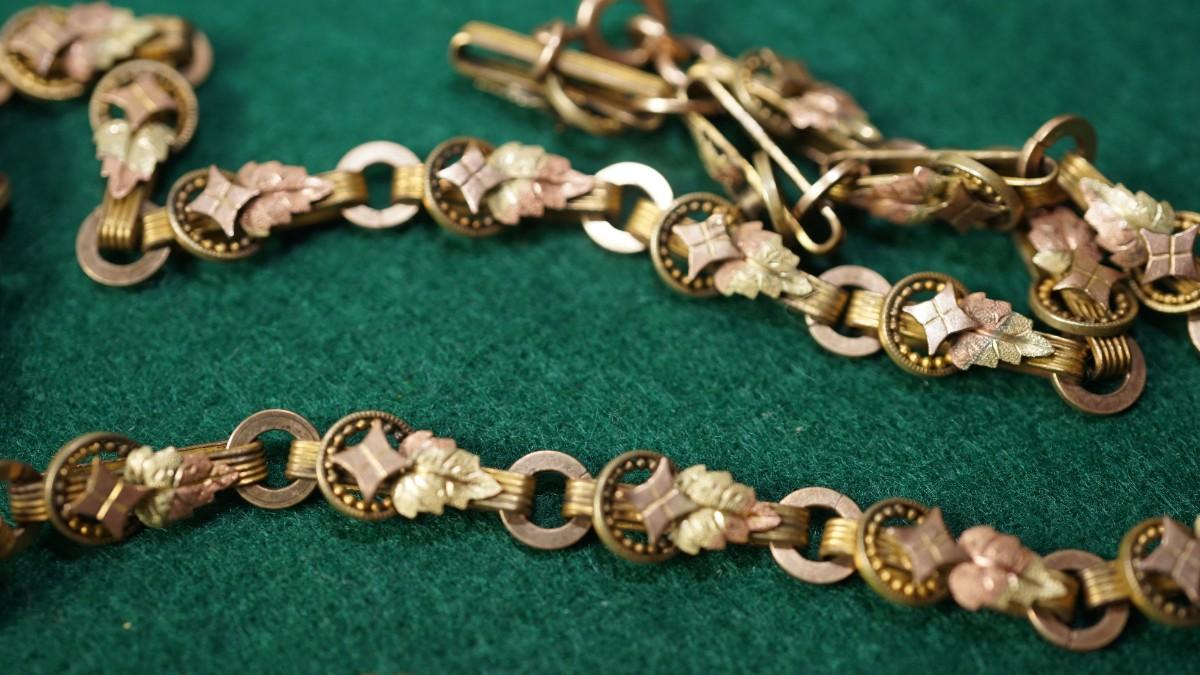 two tone leaves of copper and brass with ring chain links necklace 20" in length