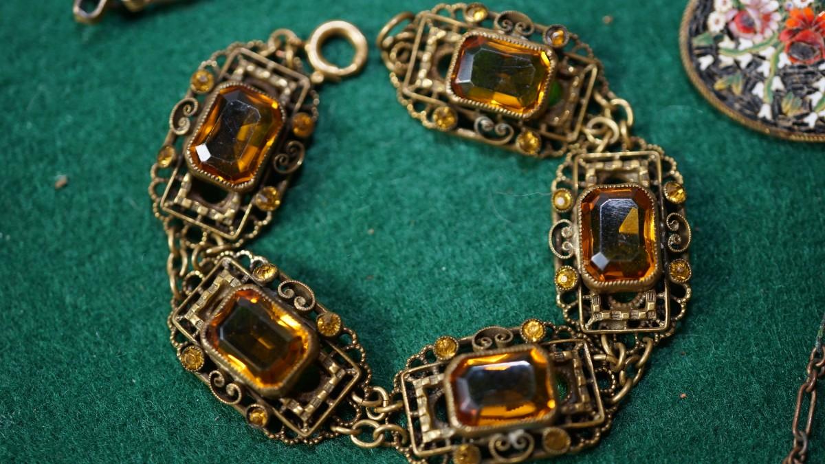 1920's brass with amber faceted stone bracelet with intricate filigree 7 1/2" " in length