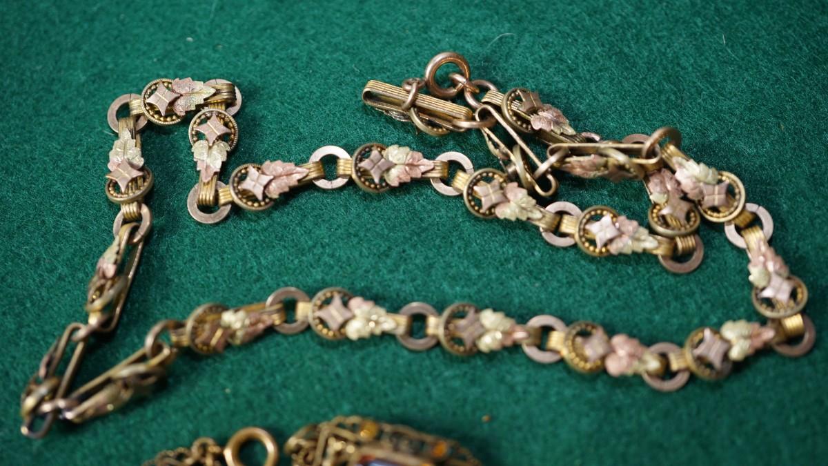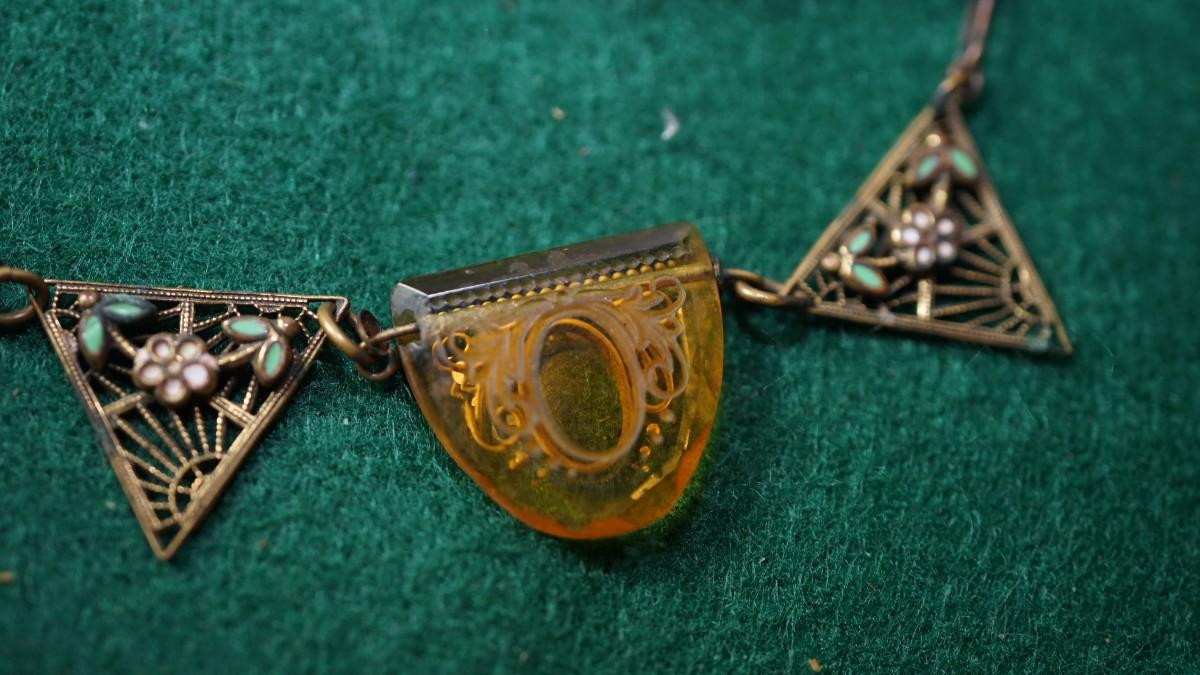 filigree necklace with enamel work and amber engraved glass arches to accent.,13" long