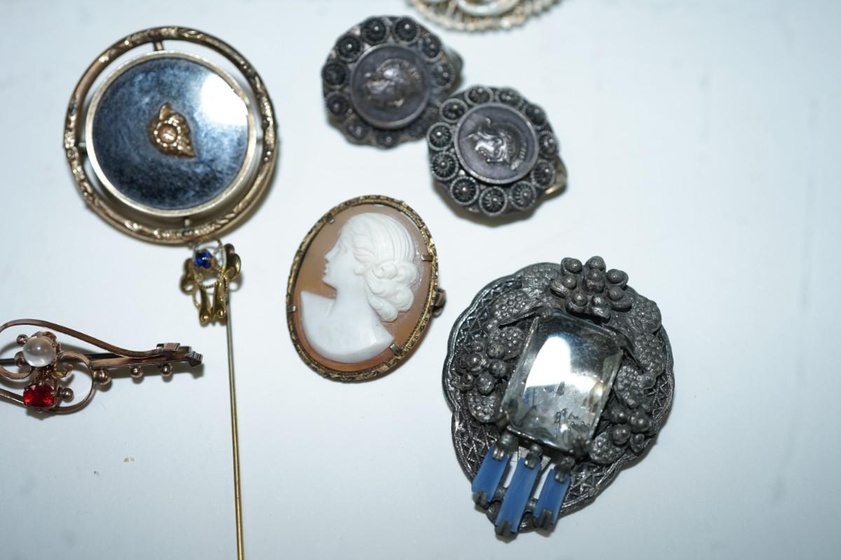 various costume jewelry to include a Victorian keepsake pin, Norway solje pin and other, cameo pin,