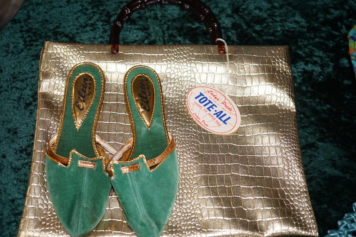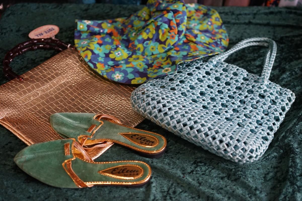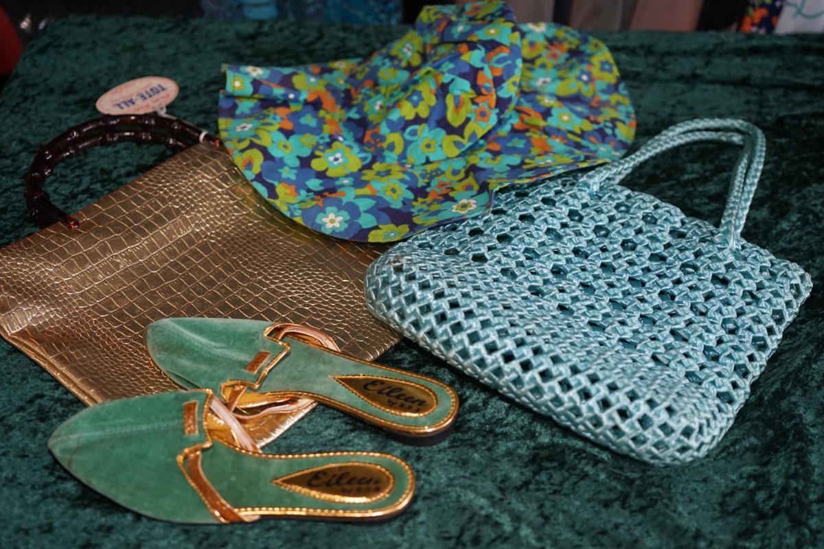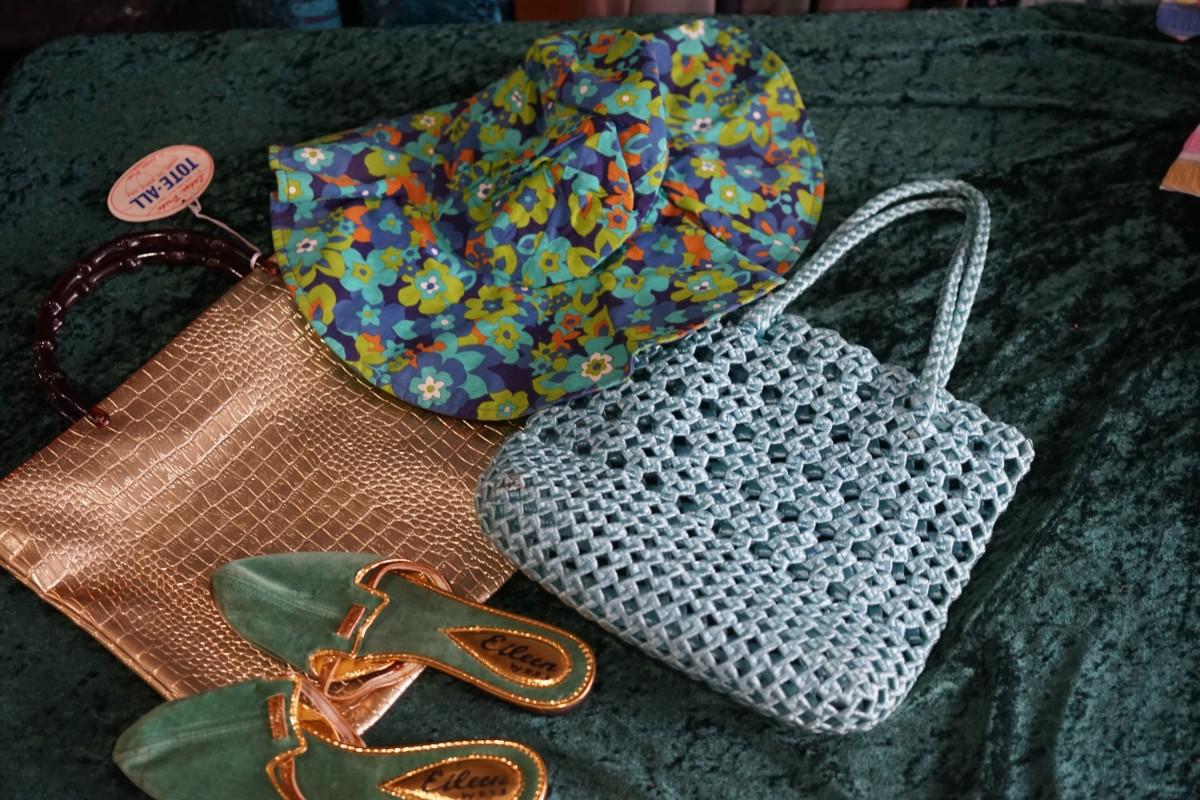 GROUPING OF VINTAGE LADIES BAGS /FUNKY FLOWER HAT & VINTAGE SLIP ON SANDLES