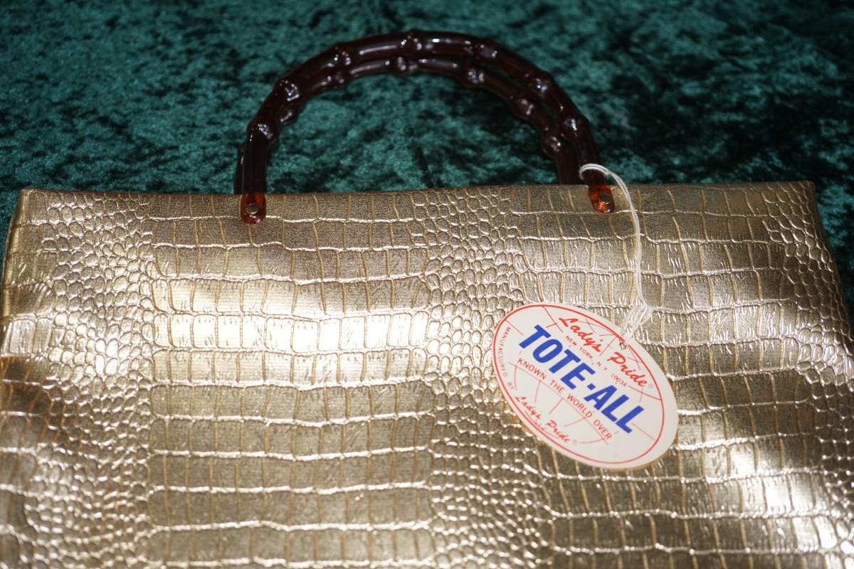 the gold tone simulated reptile skin totel with a plastic handle has not been used. 12" by 14"