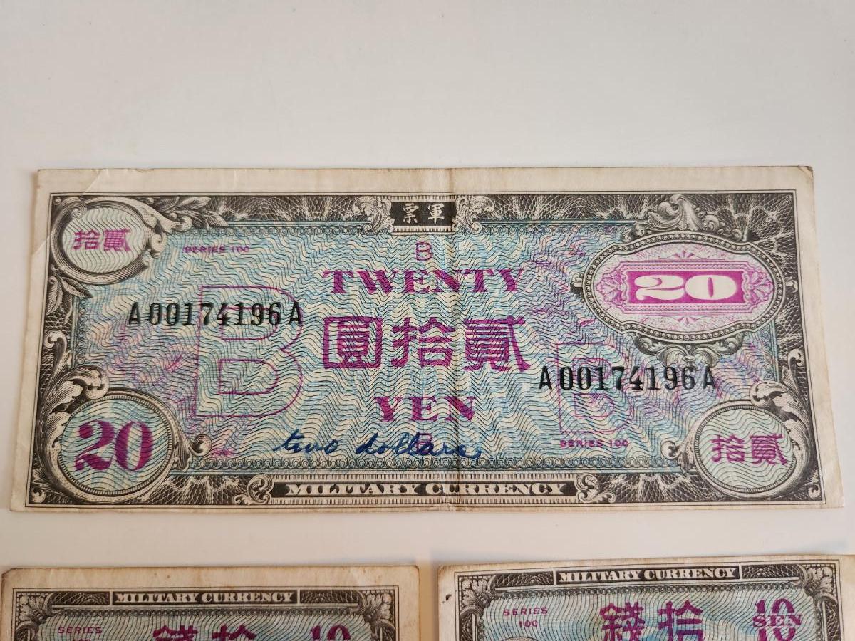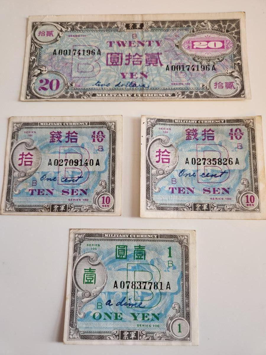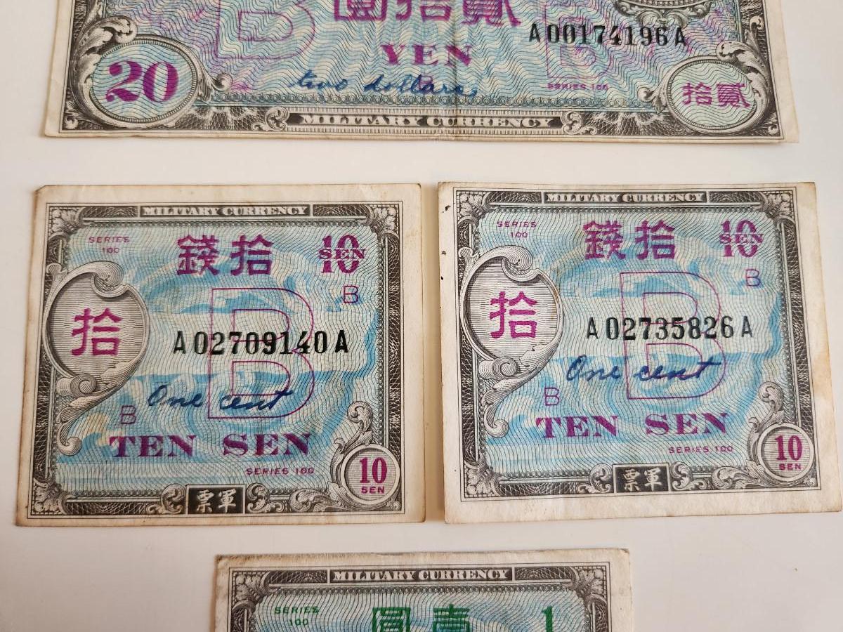 This lot is for a grouping of Vintage Military Currency Notes. Also called a "B yen" Note. Issued in 1945 by the Allied Powers during occupation of Japan after WW2. These notes were restricted for military use only. Someone has written in pen on each note its value at that time of useage. This item is KY sales tax-exempt.