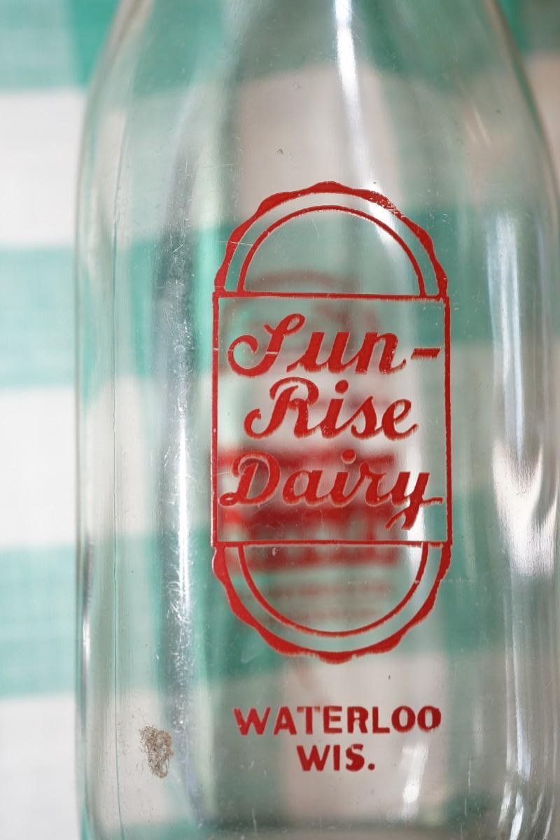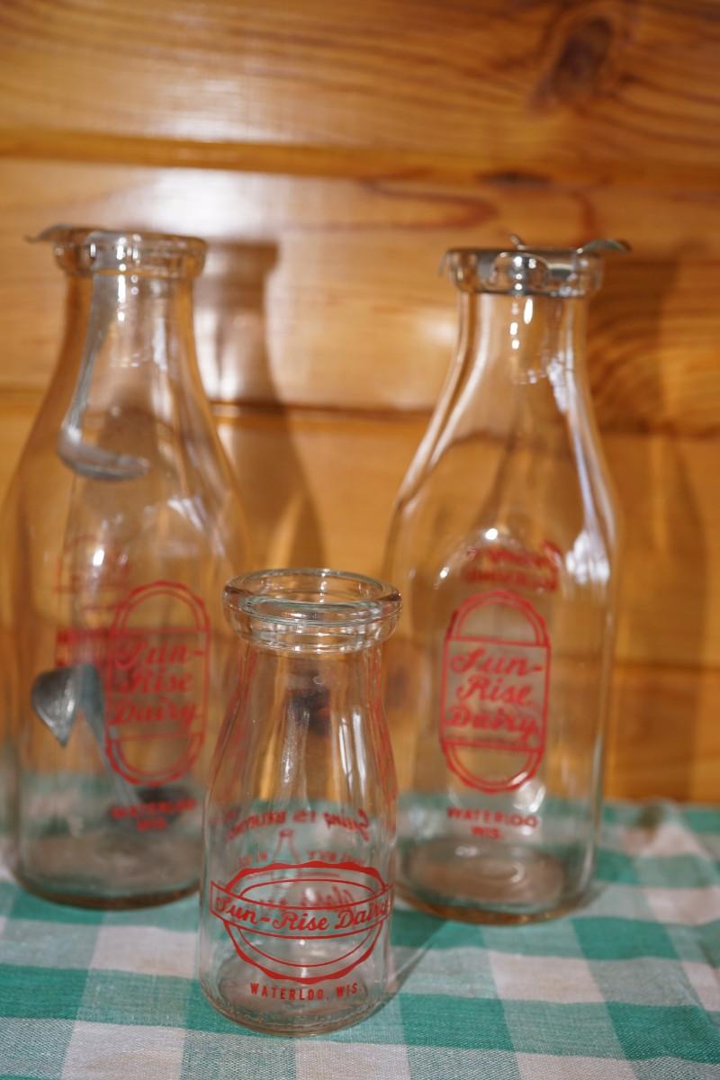 GROUPING THREE VINTAGE MILK BOTTLES FROM SUN-RISE DAIRY WATERLOO ACL LABELS