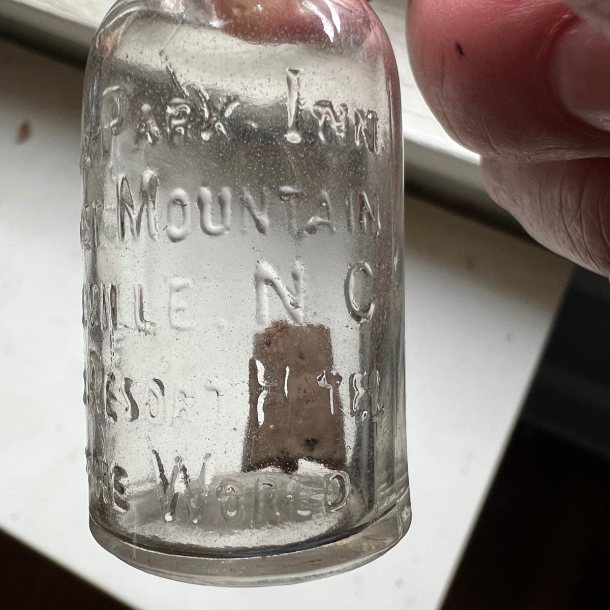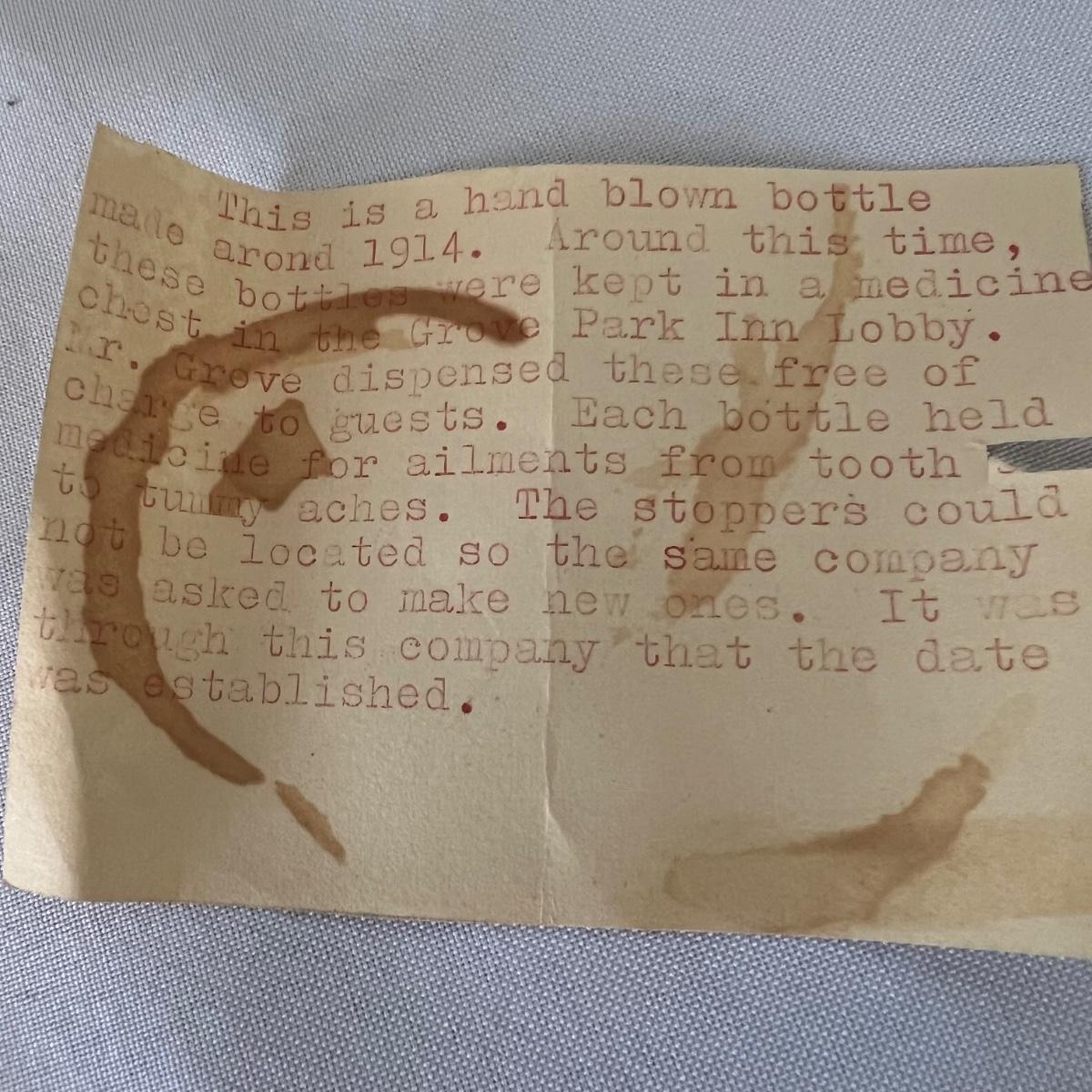 This very special. assortment of glass medicine bottles includes a pair from the Grove Park Inn; these small bottles come with a typewritten note that we cannot authenticate but notes that the bottles hark back to around 1914! Bottles say ‘Grove Park Inn Sunset Mountain, Asheville NC, Finest Resort Hotel in the world’. One has an extra stopper inside the bottle. See pics for the other great collector’s bottles in this lot.