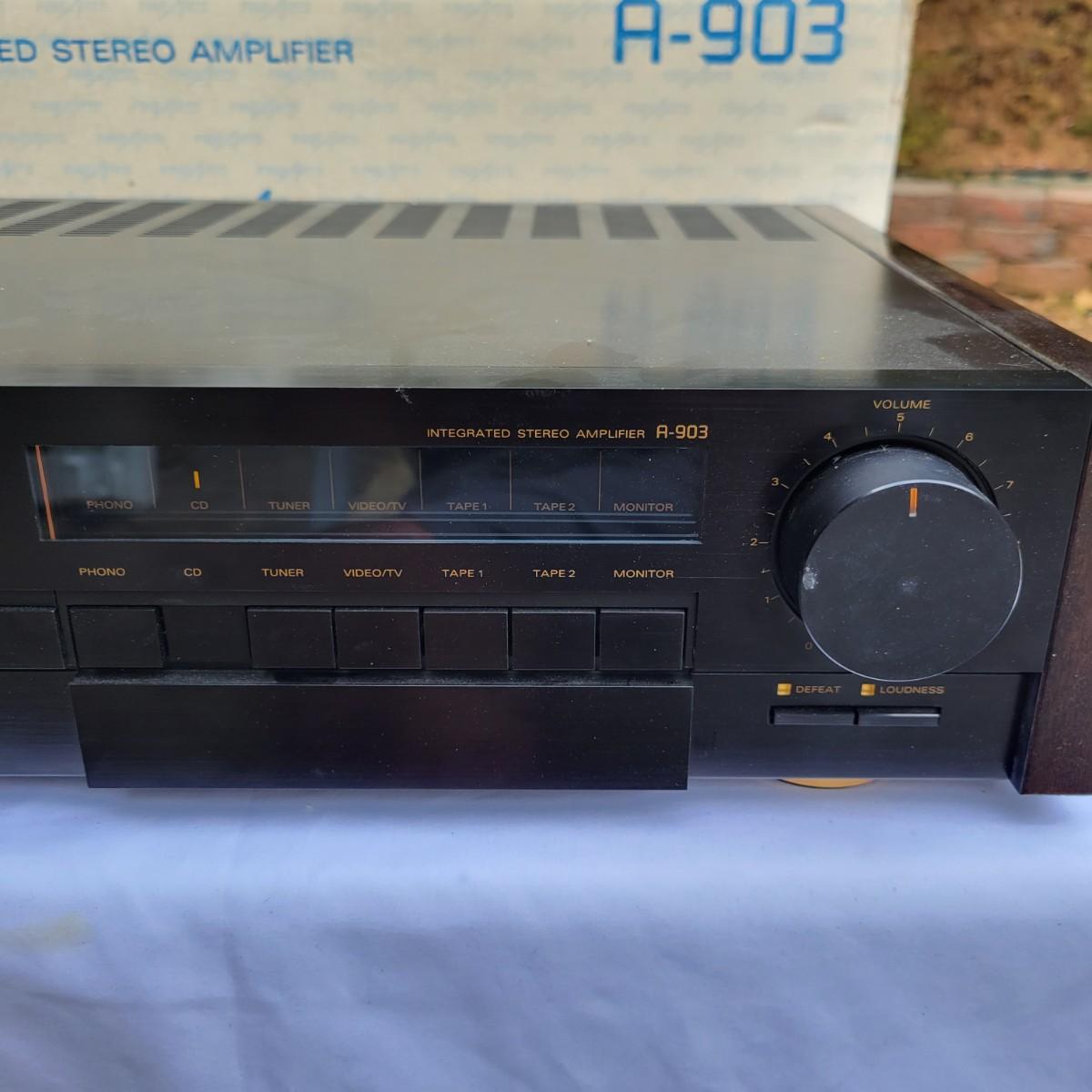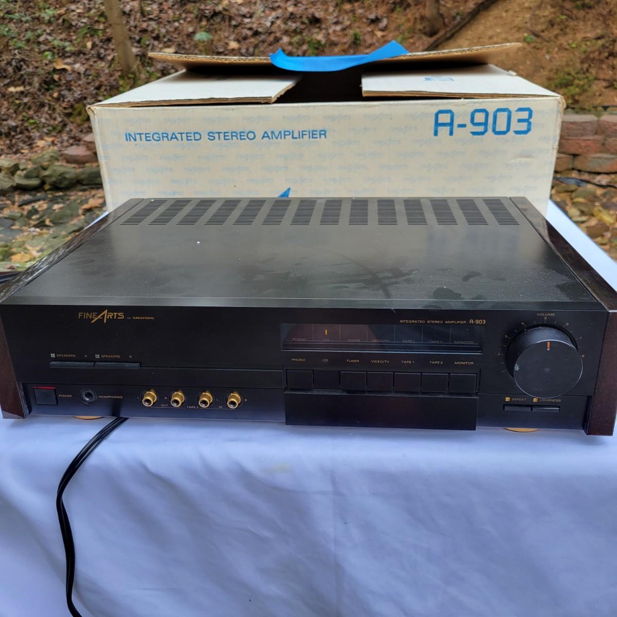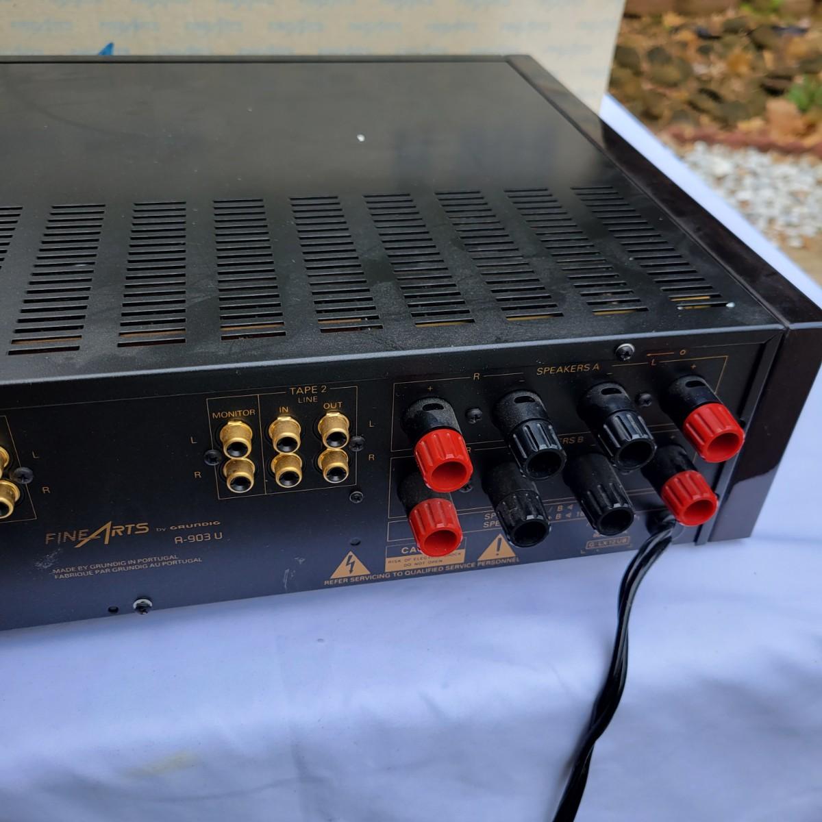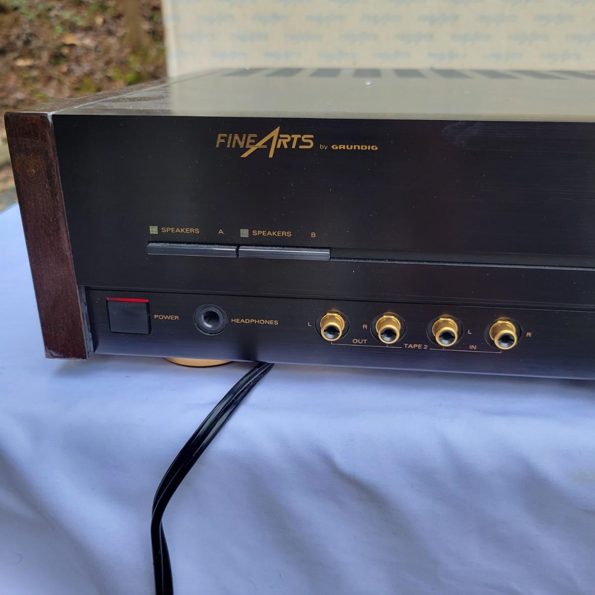 A Fine Arts by Grundig integrated stereo amplifier that powered on when plugged in. This unit can handle up to four speakers at 16 ohms and has a multitude of component lines in and out. It measures approximately 18.5" x 14.5" x 4.5"H. Shipping available