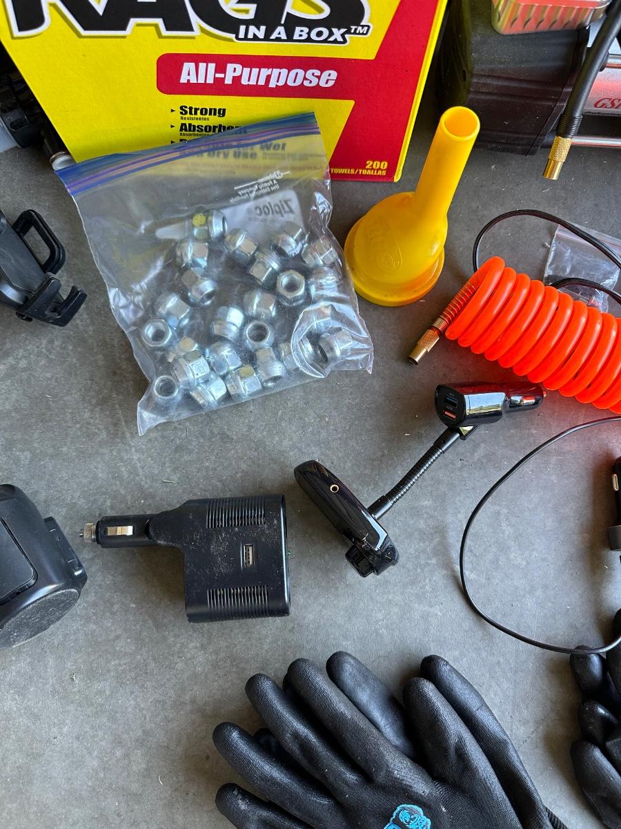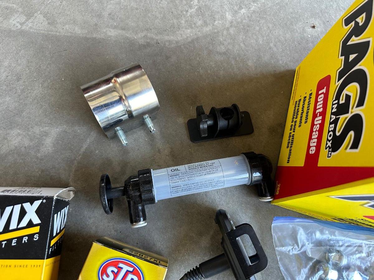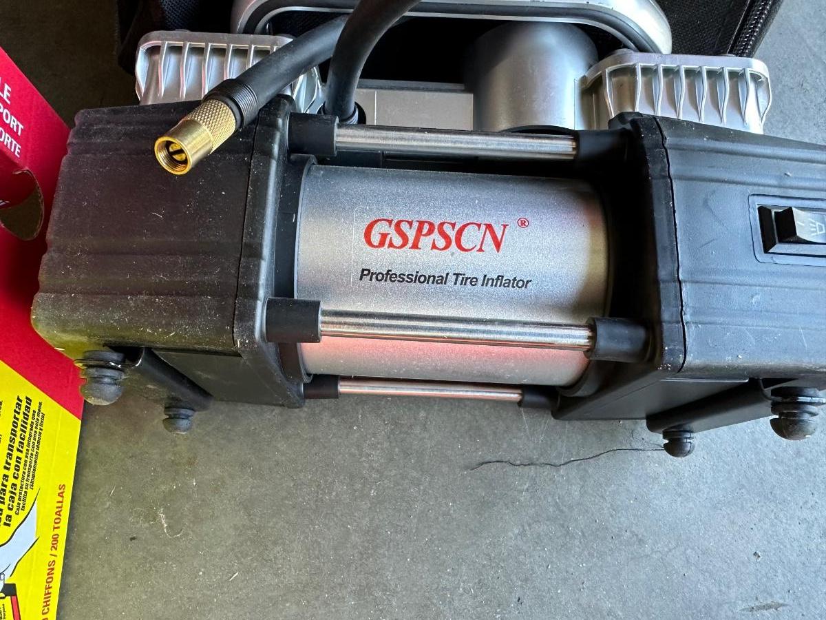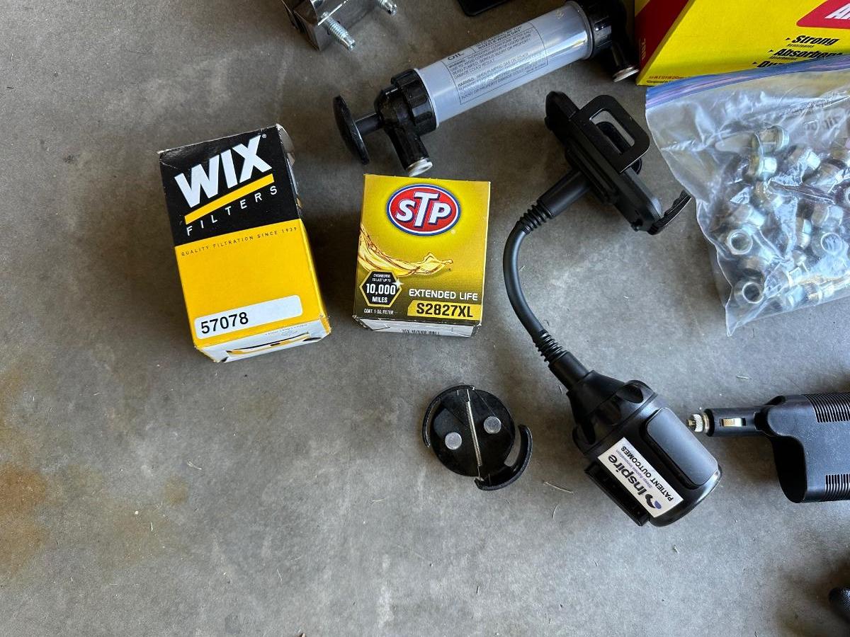 GSPSCN PROFESSIONAL TIRE INFLATOR, LUG NUTS, OIL AND FUEL FILTER, GLOVES, MUFFLER CLAMP AND OTHER ITEMS
