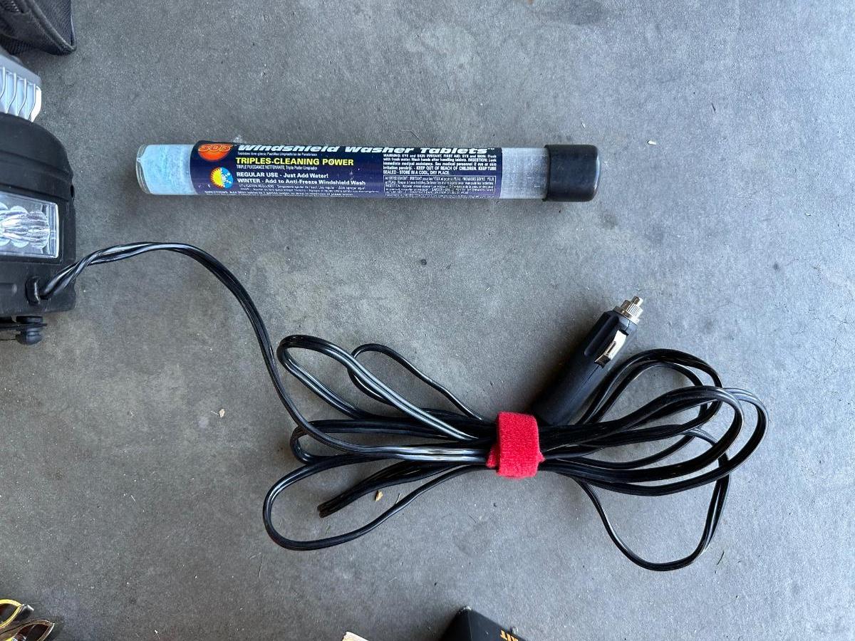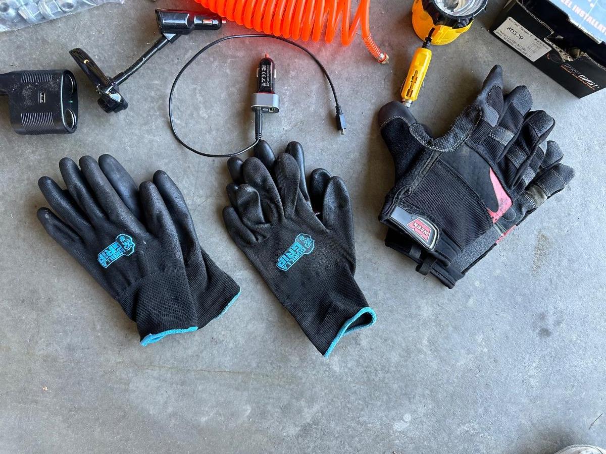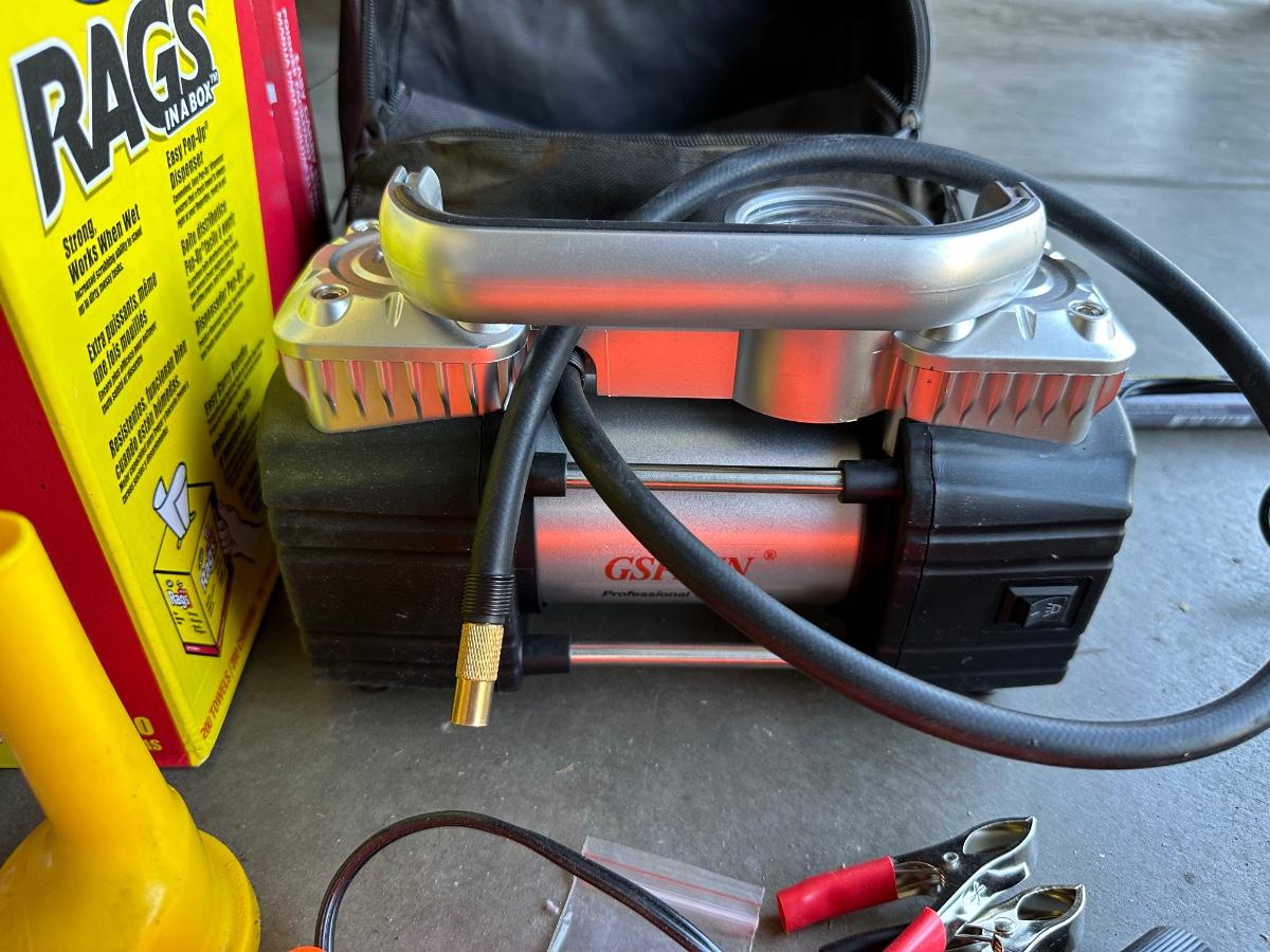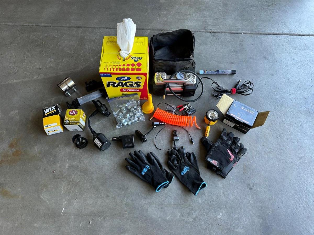GSPSCN PROFESSIONAL TIRE INFLATOR, LUG NUTS, OIL AND FUEL FILTER, GLOVES, MUFFLER CLAMP AND OTHER ITEMS