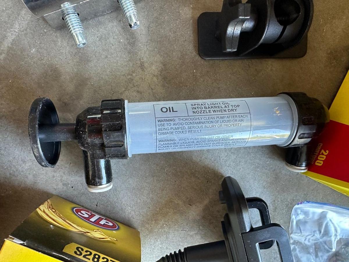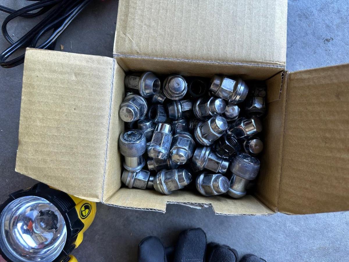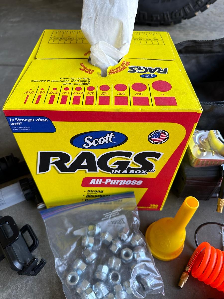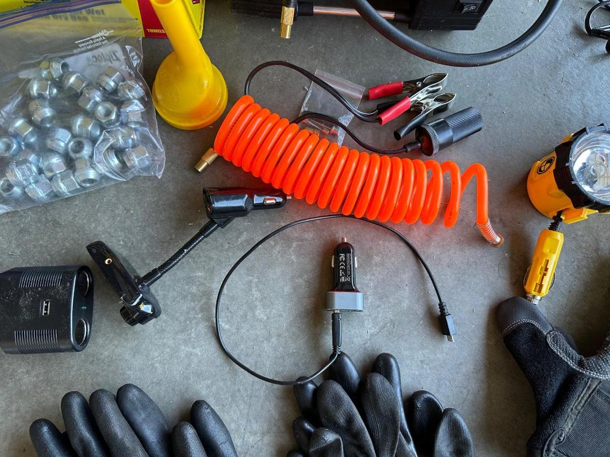 GSPSCN PROFESSIONAL TIRE INFLATOR, LUG NUTS, OIL AND FUEL FILTER, GLOVES, MUFFLER CLAMP AND OTHER ITEMS
