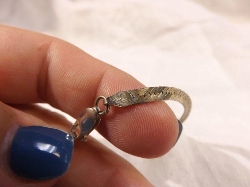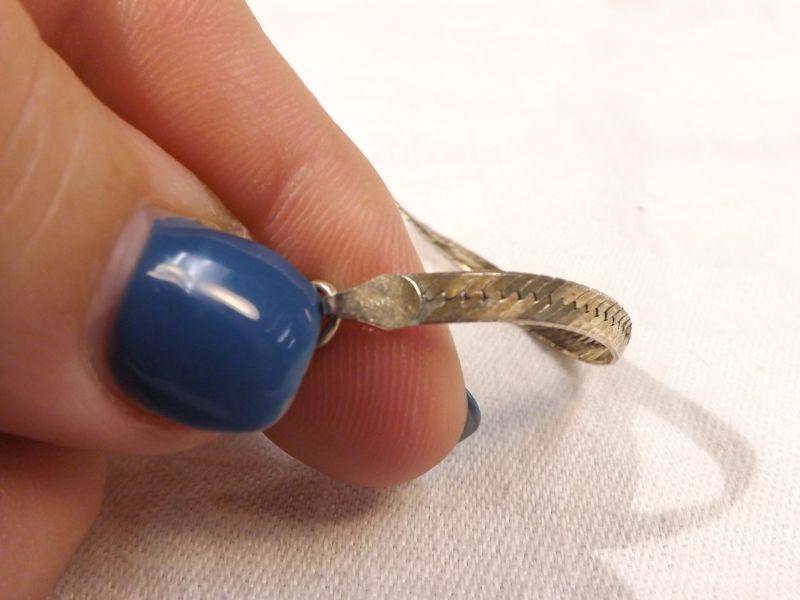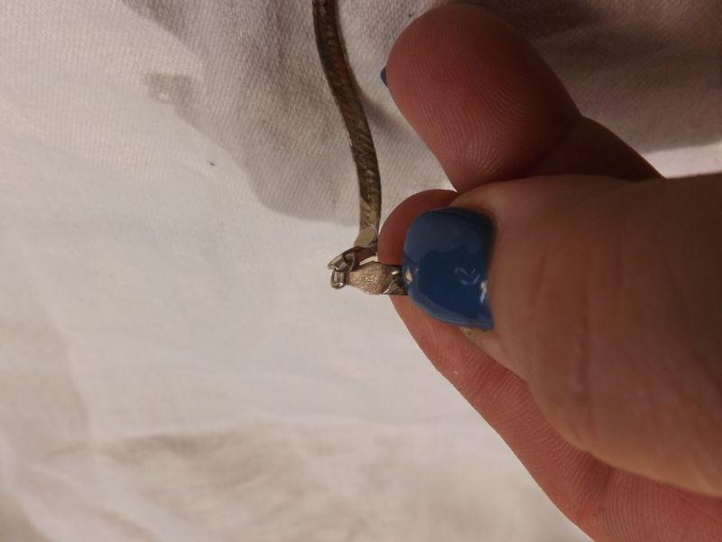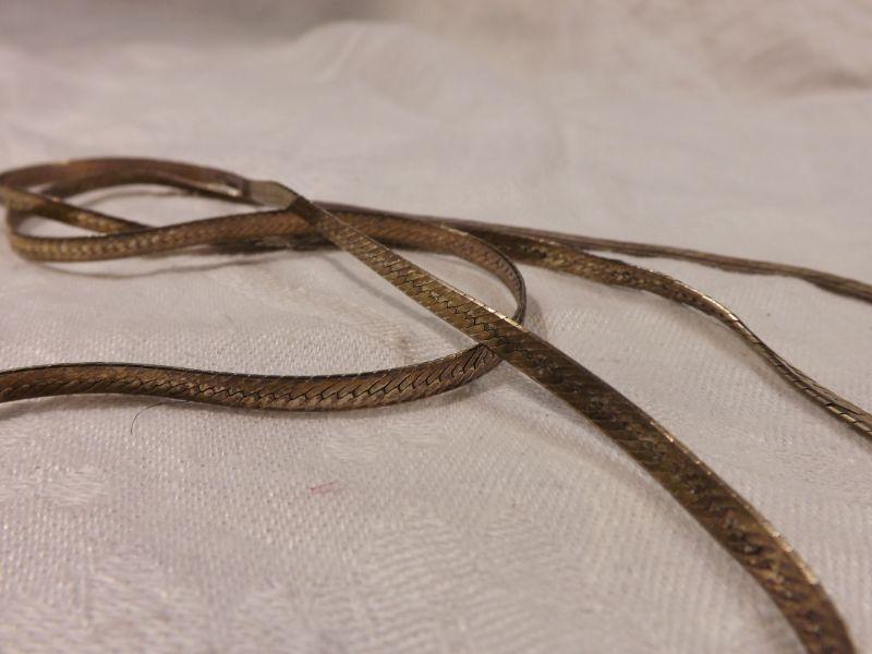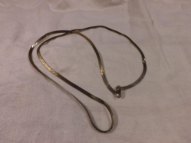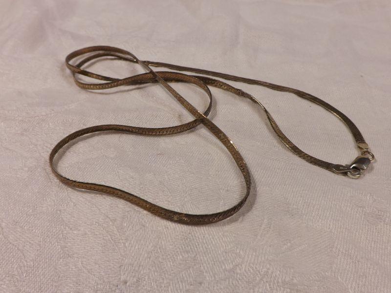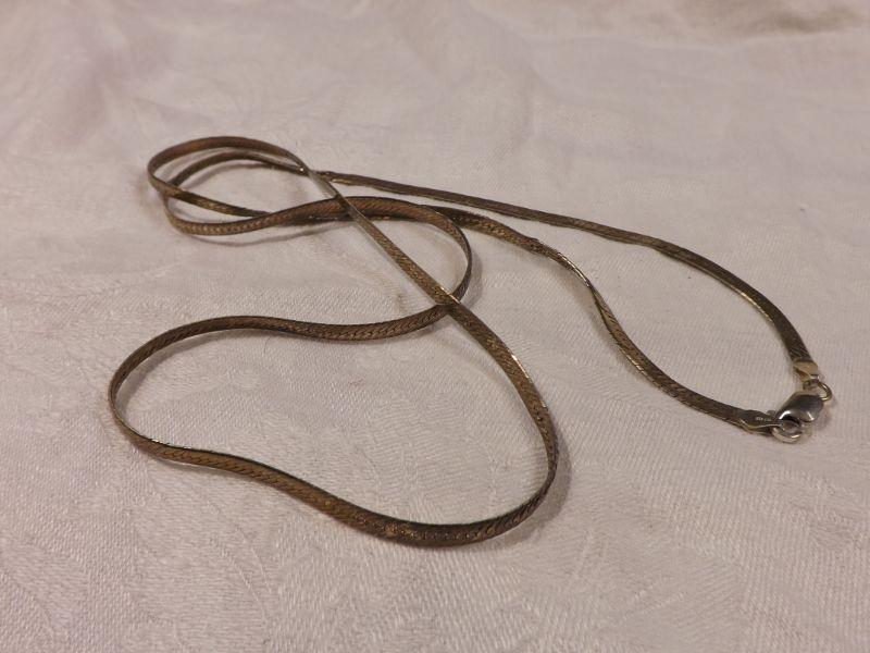 Gold-plated 925 sterling herringbone necklace, 28" long. some wear and kinks. **Please read Terms and Conditions before placing a bid. Pick up is Wednesday, September 25 from 4pm to 7pm and Saturday, September 28 from 9am to 1pm in Williamstown, NJ. All sales are final. All sales are as is, where is. Please review all photos. Any props included in photos are not included in listing. All measurements are approximate.