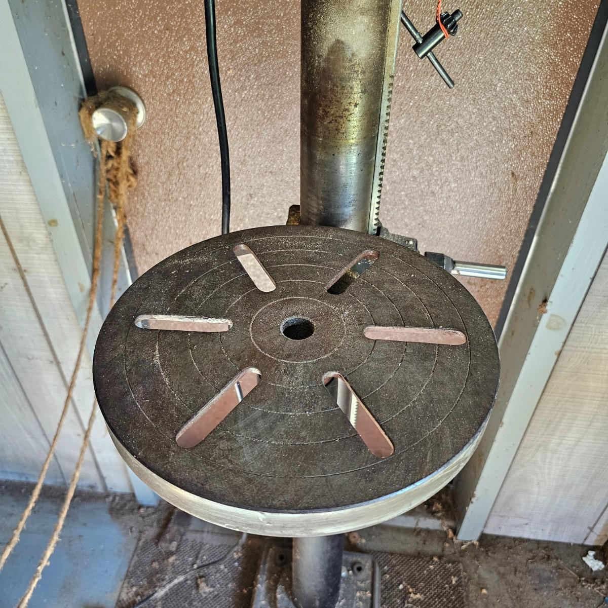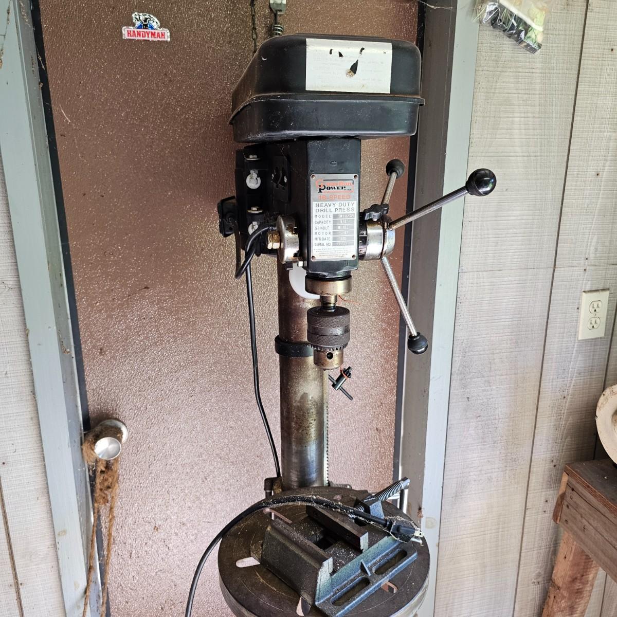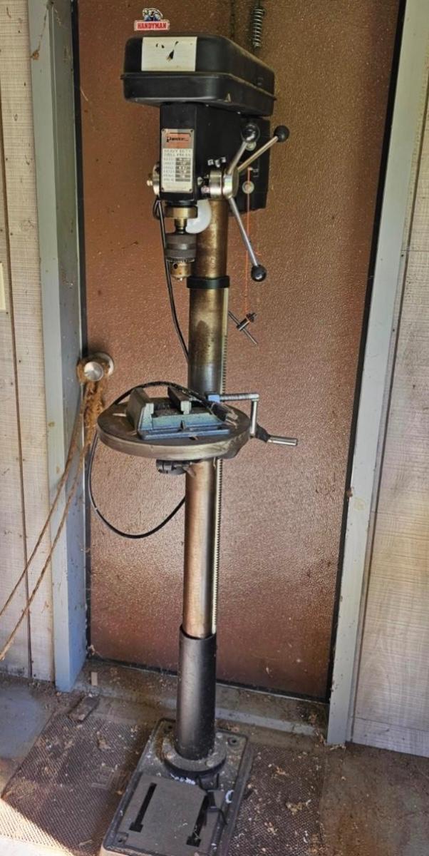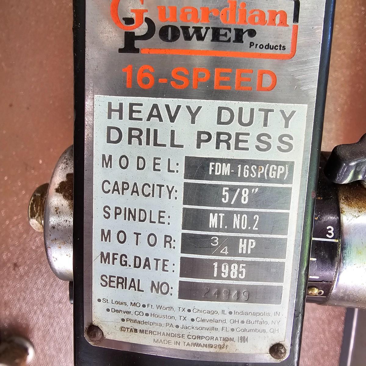 16 speed floor standing heavy duty drill press by Guardian Power. Unit has cast-iron base, ratcheting handle adjust for drilling table, 5/8" chuck with key and comes with a #4 table vise for holding objects while drilling. 3/4hp motor with multi position belt drive for speeds. Unit measures 14" x 23" x 64"H, has light and powered on when plugged in. See photos for details.