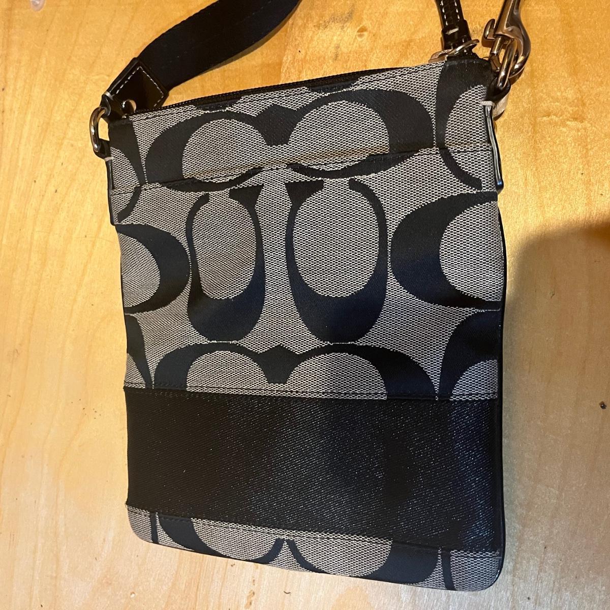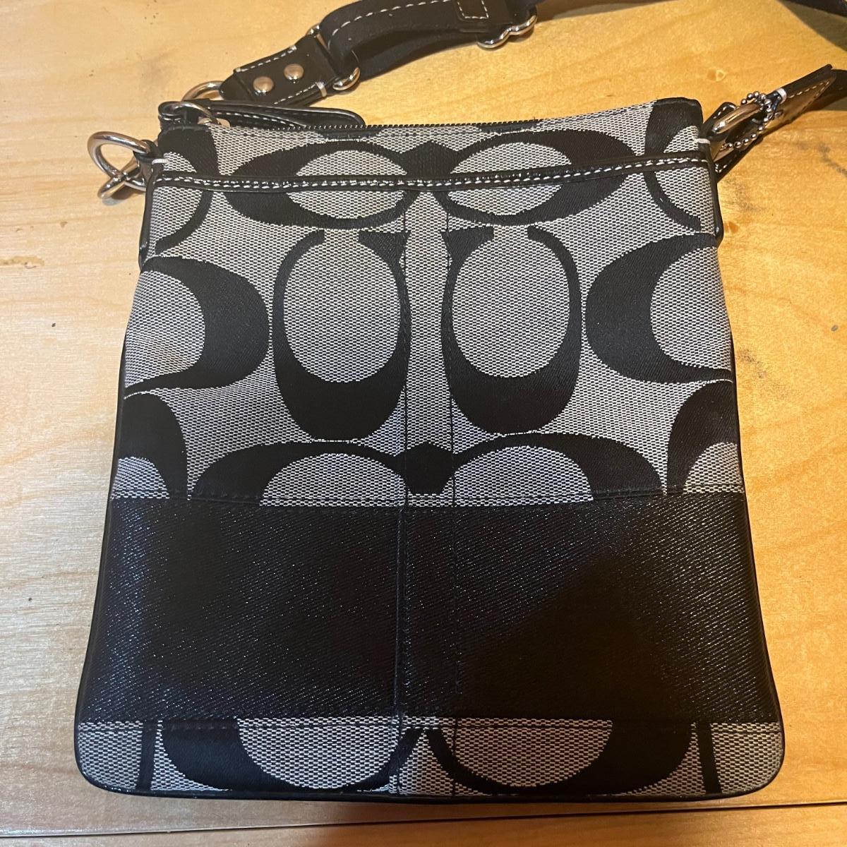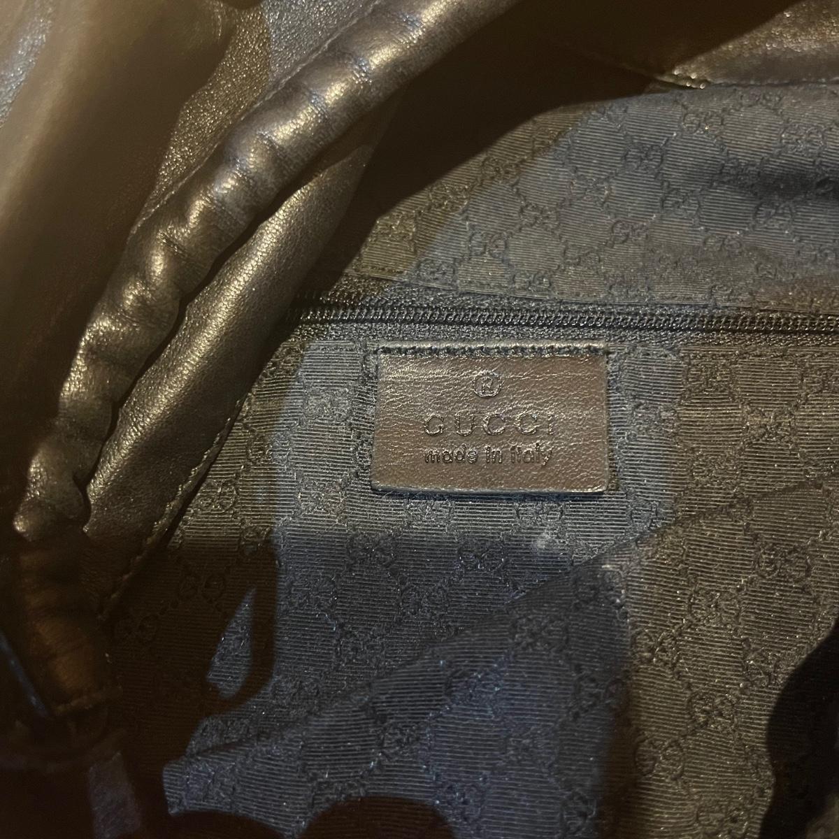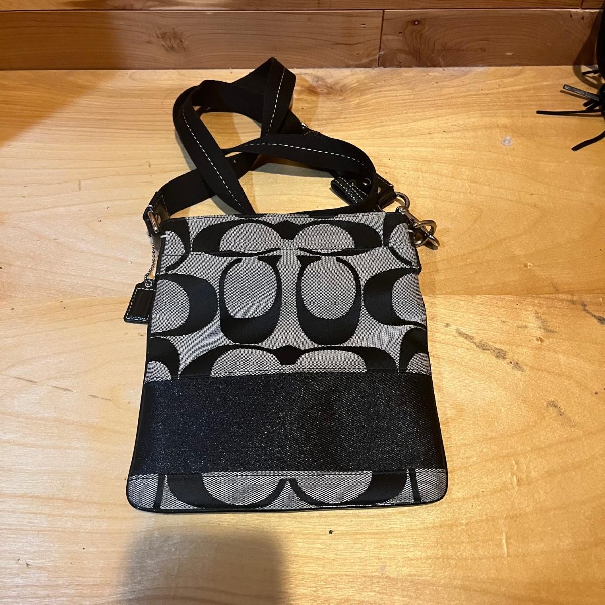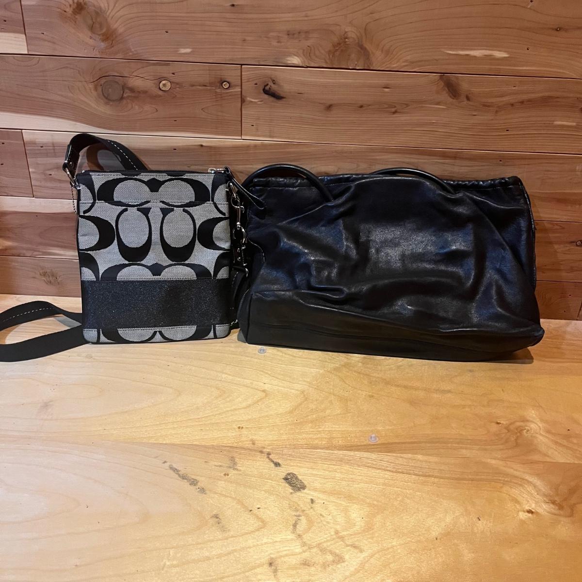 Lot includes a cross body Coach purse and leather Gucci purse. Coach crossbody has two exterior pockets with one large main compartment. Gucci purse features a cinch closure. It has a main compartment that contains a small interior pocket. Both purses are in good condition. Gucci purse measures 3.5” x 9” x 14”.