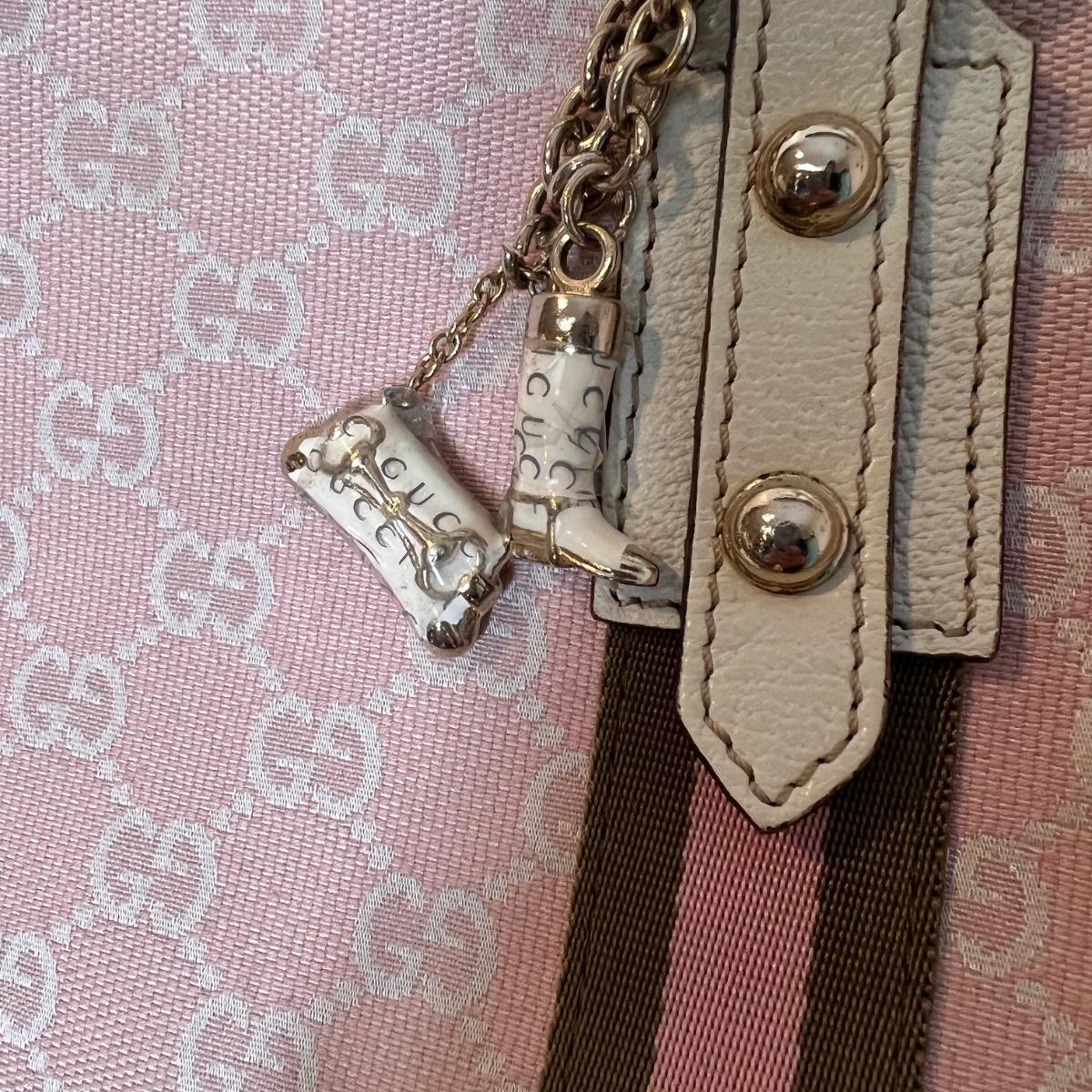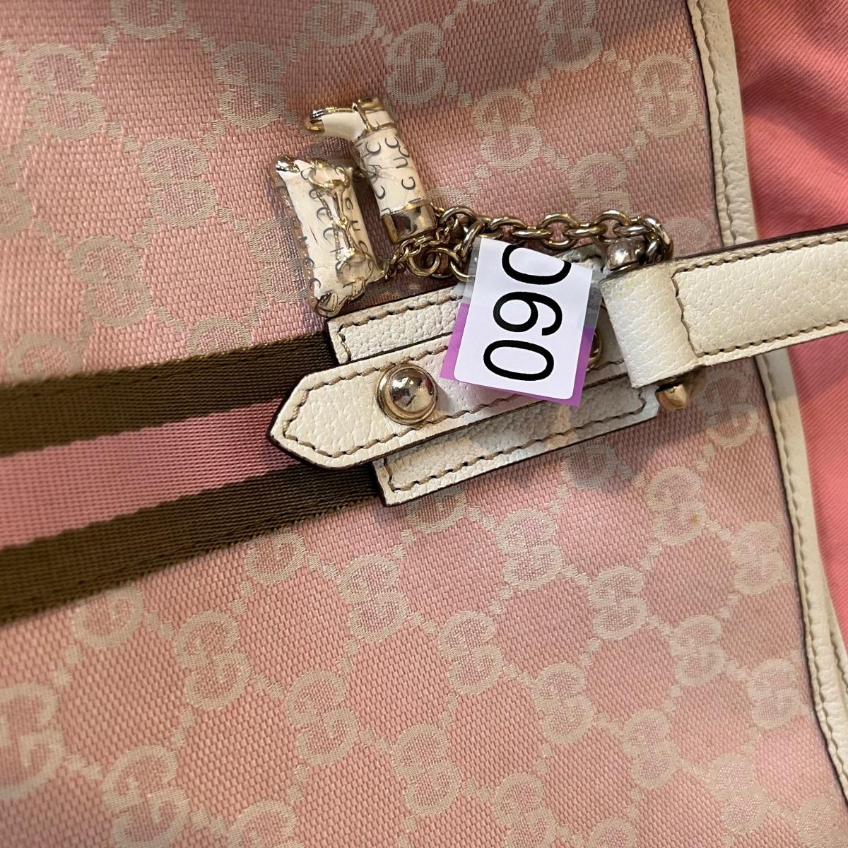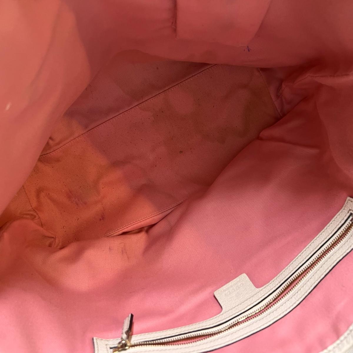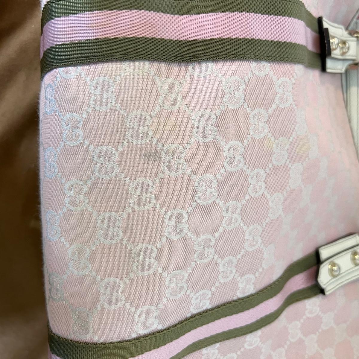 Color: pink white canvas with GG logo and olive green pink stripes, white leather gold tone hardware